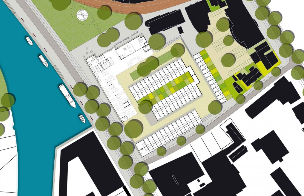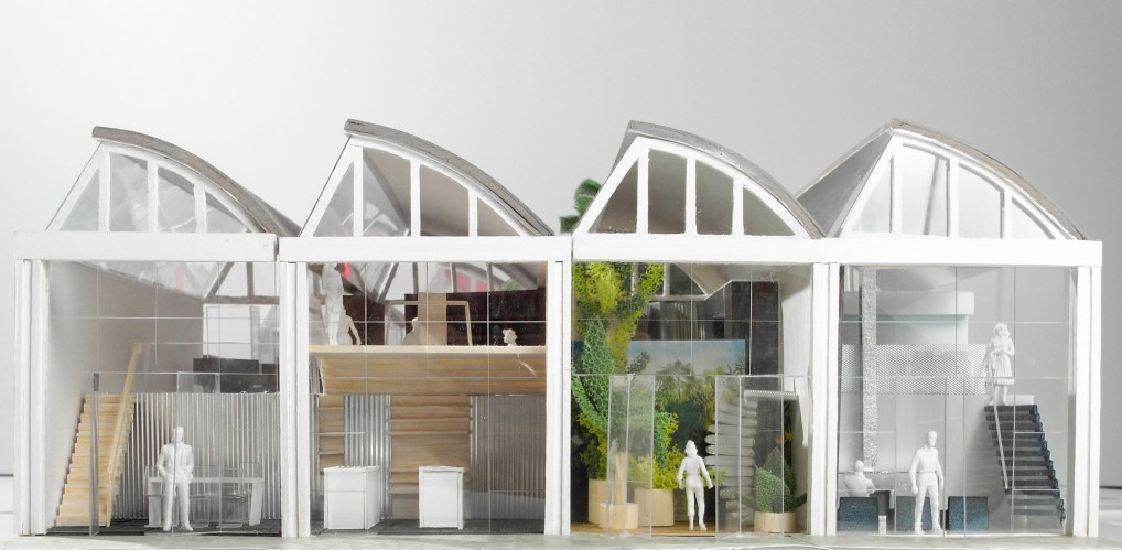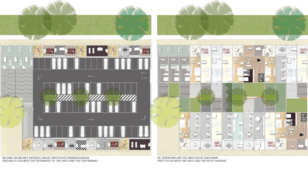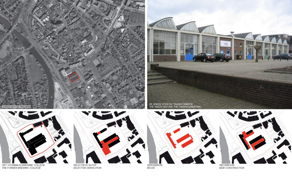 The reuse of the former practice rooms and the development of ‘shed houses’ was an essential part of the urban development plan for the Brewinc College location. Each shed is transformed into a house or working unit. The houses are folded around a garage at ground level, so as to maximize the living atmosphere around the central courtyard. Future buyers are offered a series of interior prototypes for their shed unit.