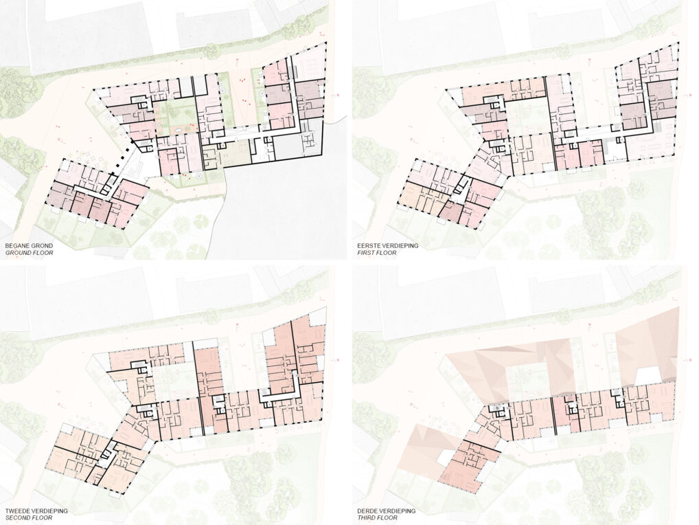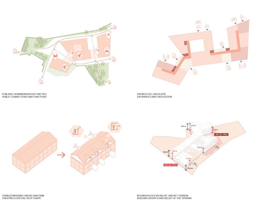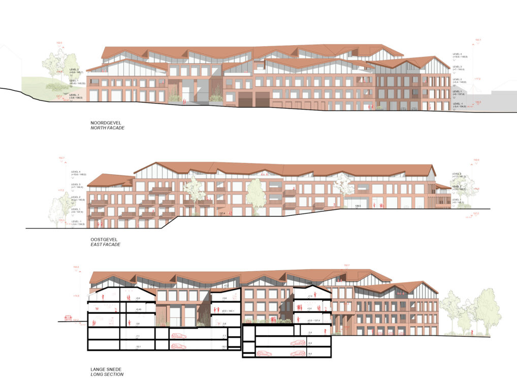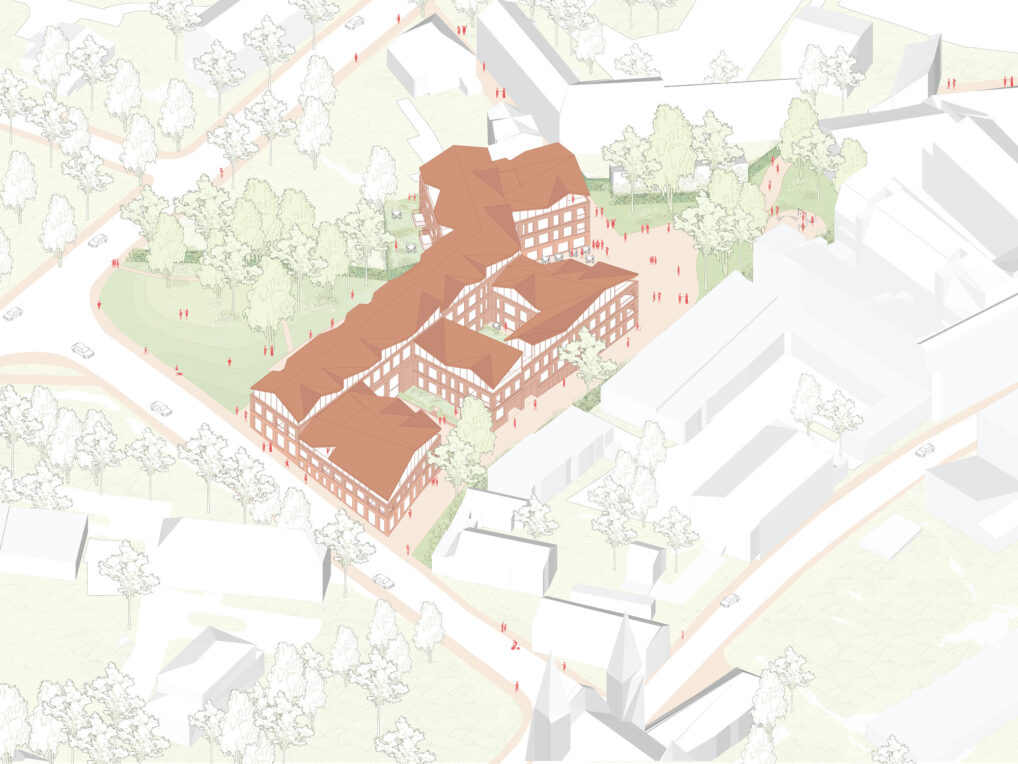 Door de verfijnde vorm van het gebouw wordt het nooit in zijn geheel gezien en heeft vanuit iedere hoek een nieuw gezicht. Het dak krijgt een speciale behandeling. Door nauwkeurige transformaties van de klassieke vorm ontstaat er een spannende woonomgeving en een verbijzondering voor de architectuur. Het dak is losgekoppeld van het volume door doorlopende ramen en zweeft hierdoor boven de bakstenen plint. De appartementen onder dit dak krijgen hierdoor fantastische zichten over de oude stad.