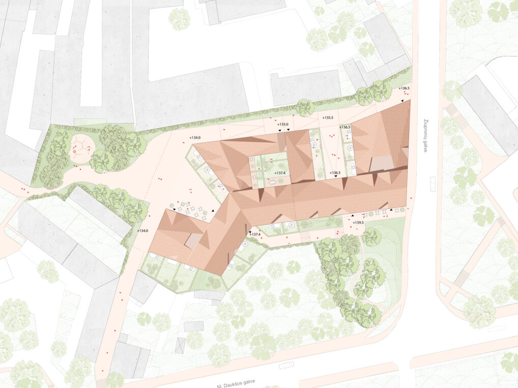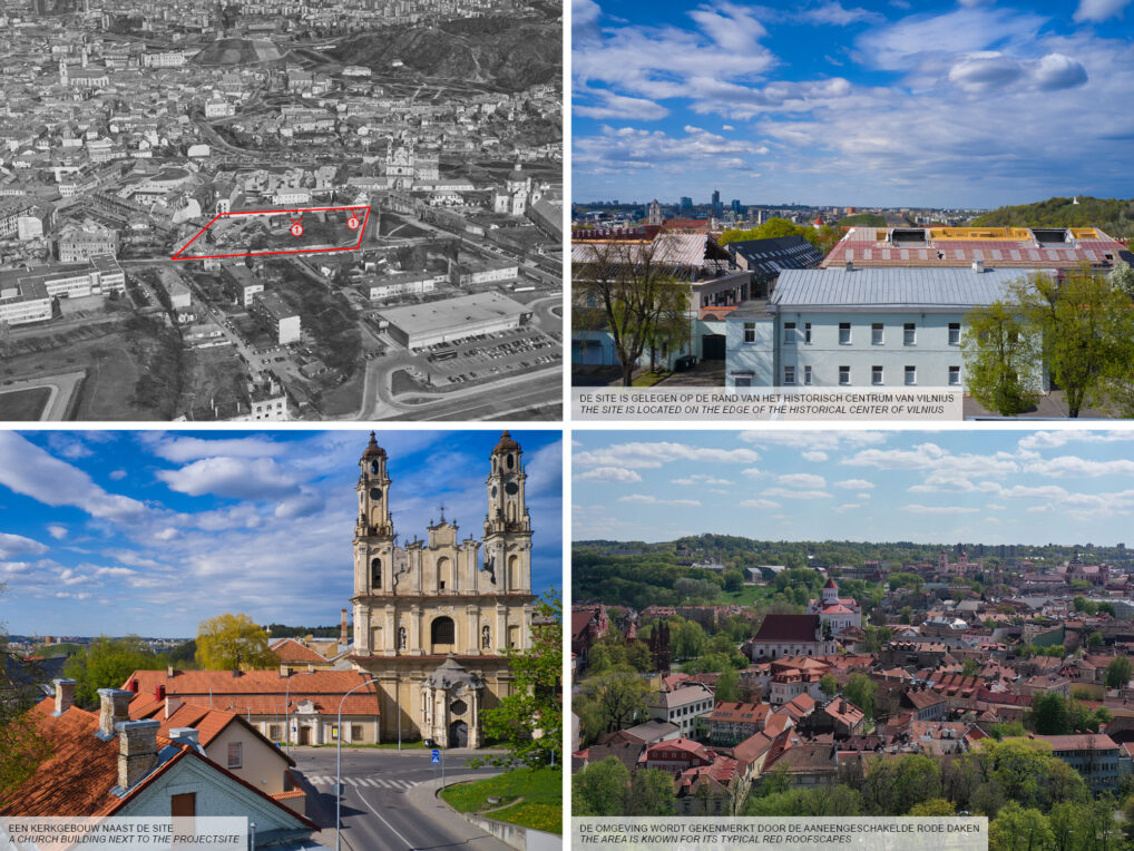‘A room with a view’ biedt kwaliteitsvolle woningen gecombineerd met commerciële functies voor het historische centrum van Vilnius. Met maximaal respect voor de omgeving is het project een modern, maar contextuele aanvulling voor de stad. Het gebouw is een verfijnd volume gecombineerd met een dak. Twee hofjes verzorgen de transitie tussen de openbare ruimte en de privacy van de woningen. De hofjes ontsluiten de woningen, bieden groene publieke ruimte en plaats voor terrassen van de commerciële plint.