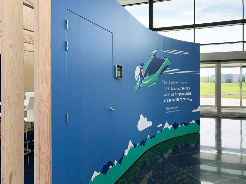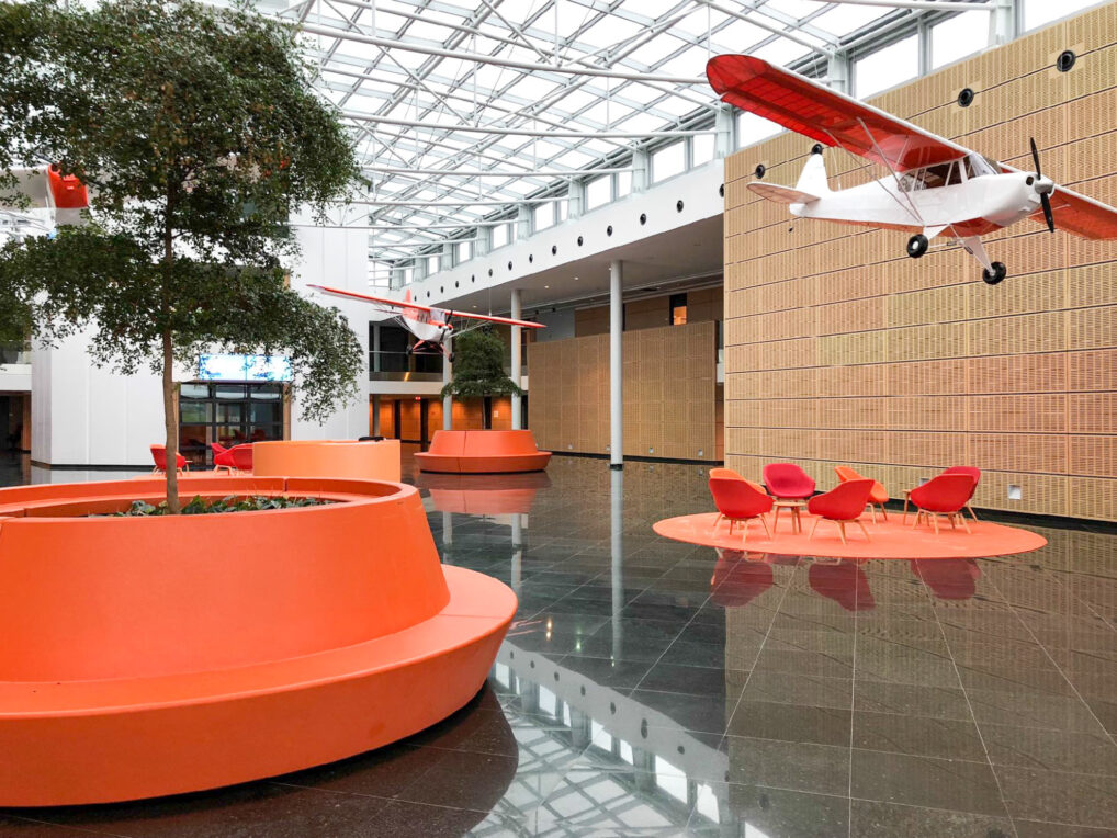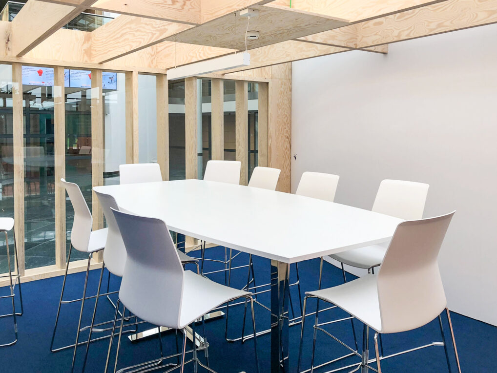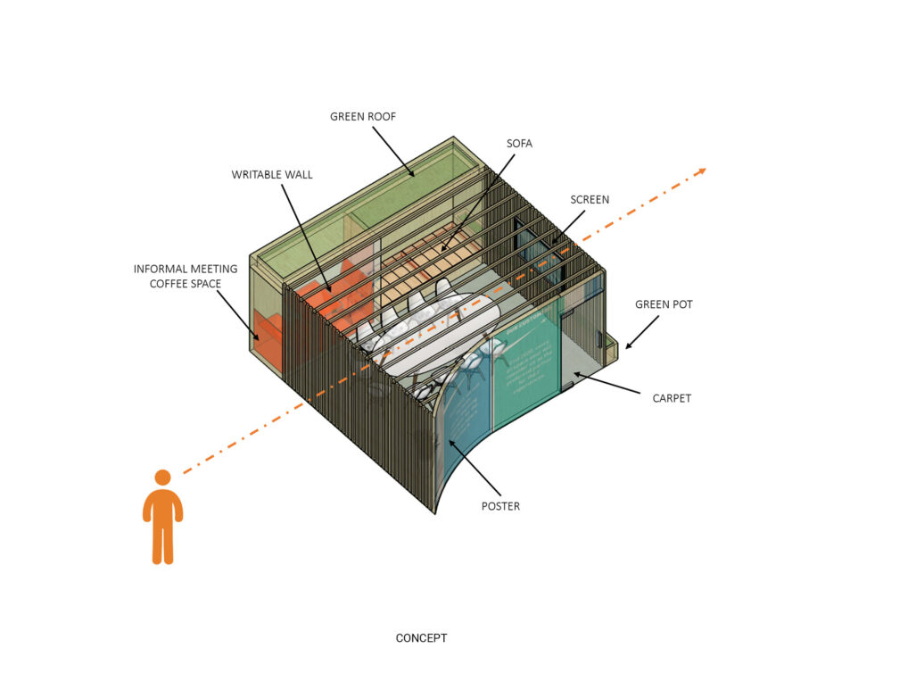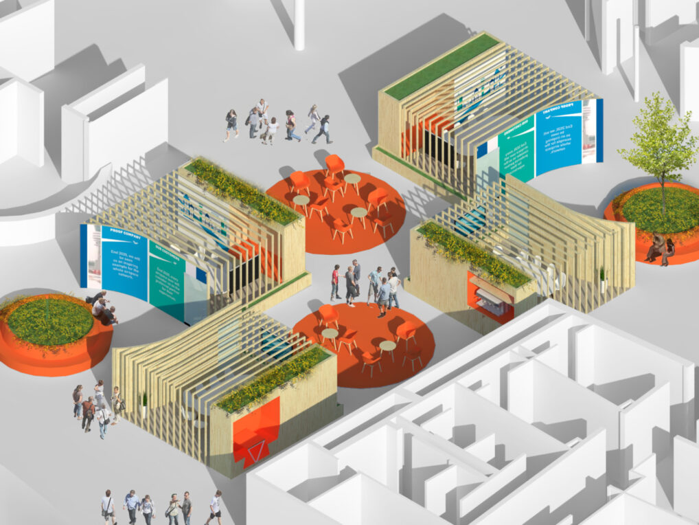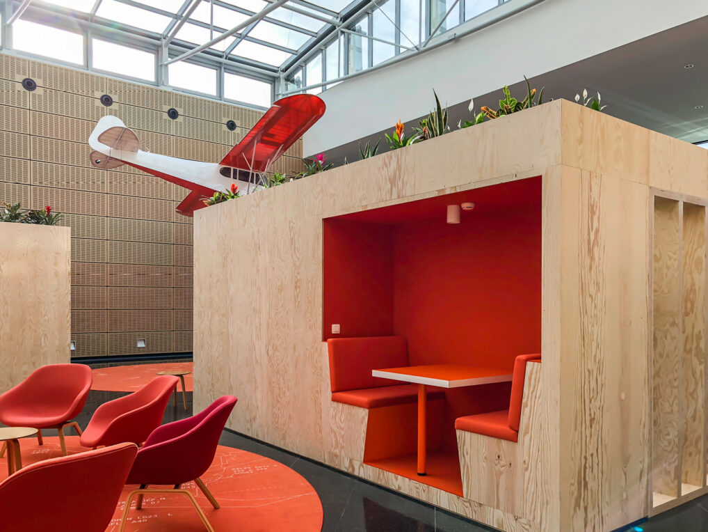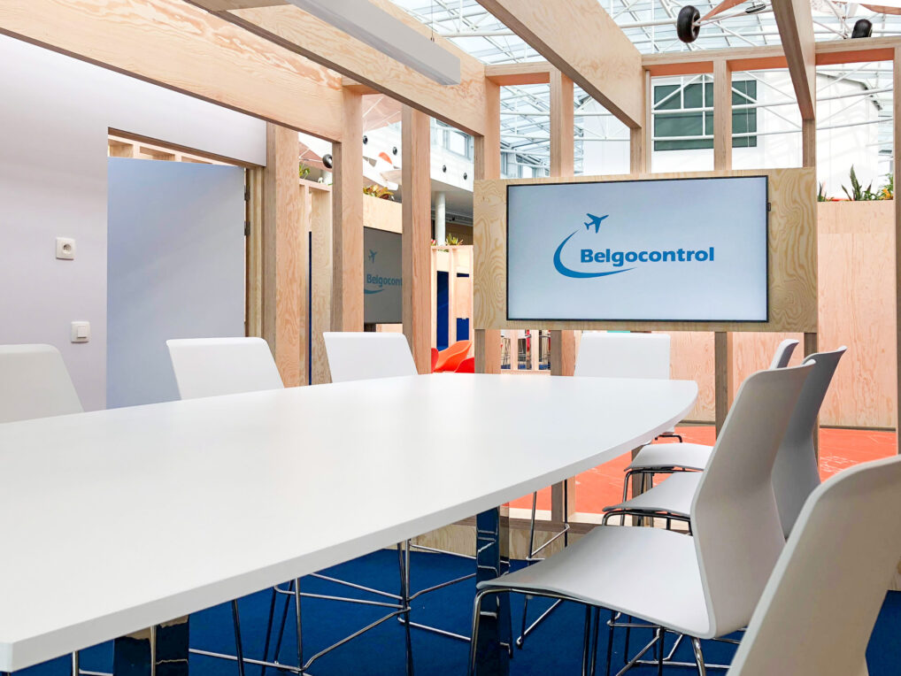 Het project bestaat uit 4 tijdelijke werkplaatsruimten voor de internationale luchthaven van Brussel, in de inkomhal van het verkeerstorengebouw dat in 2005 werd voltooid. De kern van de hal wordt omringd door de cafetaria en het auditorium. JDWA is gevraagd om de leegte tussen de bestaande elementen op te lossen: de oranje zithoeken, en te proberen een sterke dialoog met hen en het royale daklicht te creëren. Om in te spelen op tijdelijke behoeften, snelle installatie en demontage, zijn de paviljoens van hout. Het belangrijkste concept is om te spelen met het natuurlijke licht. Het licht komt de paviljoenen binnen via het glazen dak en wordt vervolgens gefilterd door de houten structuur. Op deze manier is het mogelijk om alles eromheen te zien en te genieten van het natuurlijke licht. Als marketingstrategie is rekening gehouden met de huisstijl en zijn de huisstijlkleuren verwerkt in het ontwerp (expowanden). Het interieur is ontworpen als een flexibele ruimte waar medewerkers de ruimte hebben om samen te creëren, op het glas te schrijven en te ontspannen op de bank. Aan de achterkant van alle paviljoens behalve één, is een informele vergaderruimte geïntegreerd. In de andere is de ruimte gewijd aan een pantry. Elk paviljoen is 18 m2 geschikt voor 10 personen.