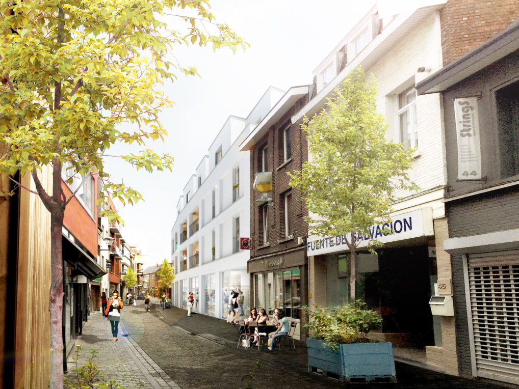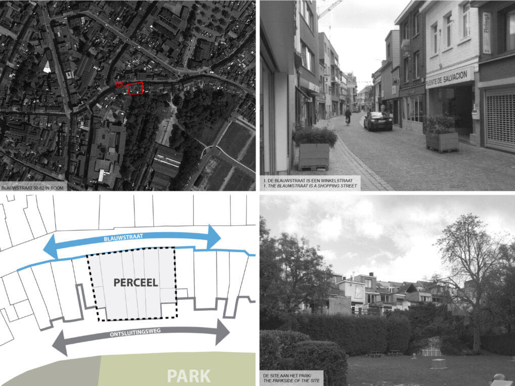 Goed Wonen Rupelstreek wenst een appartementsgebouw met commerciële ruimten te realiseren aan de Blauwstraat te Boom. Hiermee wordt ingespeeld op de vraag van oa de gemeente om deze historische winkelstraat nieuw leven in te blazen. De uitgangspunten van het ontwerp zijn om de koopappartementen op een efficiënte en kwalitatief hoogwaardige manier in het beschikbare volume te realiseren met hiernaast een commerciële ruimte op het gelijkvloers. Die commerciële ruimte kan als één of als drie onafhankelijke winkels ingedeeld worden. De twee (deels) ondergrondse bouwlagen omvatten parkeren, fietsenstallingen en magazijn. De kwaliteiten van de specifieke locatie van het gebouw tussen de Blauwstraat en het groene centrum-parkeren wordt aangewend door een short-cut te creëren tussen beiden in de vorm van een doorgang. Deze doorgang vormt de schakel tussen het park(eren) en de stad waardoor dit een uiterst centrale locatie zal zijn waar het voor commerciële functies interessant is zich te vestigen. Het gebouw omvat acht appartementen die worden bereikt via een centrale trap- en lifthal. Alle appartementen hebben een oriëntatie naar zowel de Blauwstraat als naar het park. Grote raampartijen ontsluiten aan de ruime zuidelijk georiënteerde terrassen die uitzien op het park. Doordat de magazijnen van de commerciële ruimte zich in het eerste kelderverdiep bevinden, kan de volledige commerciële ruimte worden aangewend voor primaire verkoopruimte. Deze heeft uiteraard een grote glaspartij naar de Blauwstraat maar zal ook ramen hebben gericht naar de steeg en het achtergelegen park(eren). Hierdoor wordt de zichtbaarheid en de relatie met het achtergelegen gebied vergroot. Het gebouw is opgetrokken uit lichtgrijs gekaleide gevelsteen. De voorgevel wordt gekenmerkt door haar formele grid-structuur dat de schaal van de appartementen den de travee-indeling in de straatgevel leesbaar maakt. De gaanderij wordt afgewerkt met een lichte houten afwerking waardoor in de straat een aantrekkelijk spel tussen het metselwerk en het hout ontstaat.