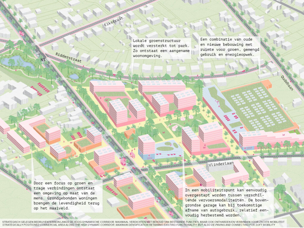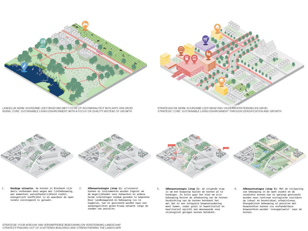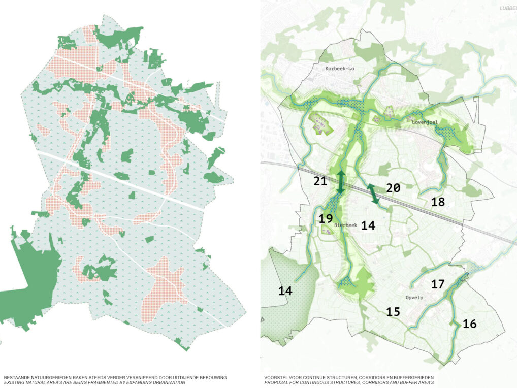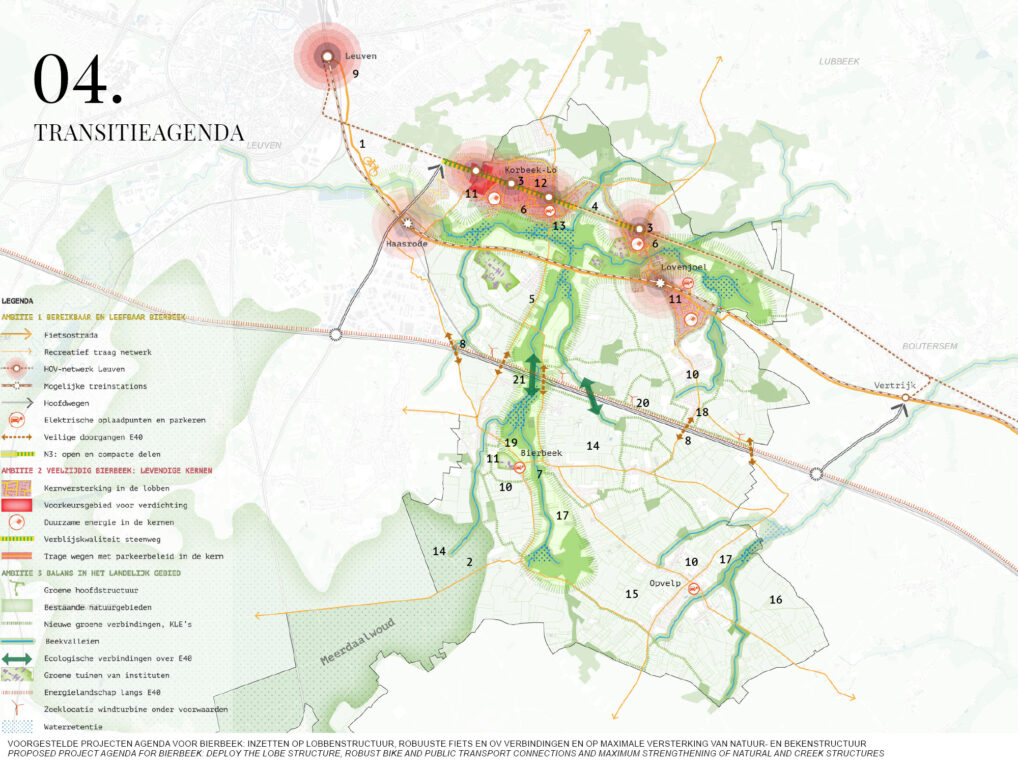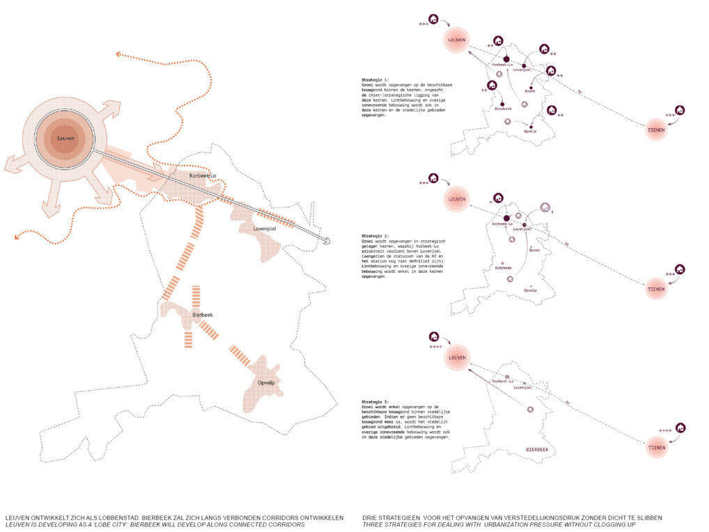 In het voorstel word de lobbenstructuur omarmd en uitsluitend strategisch verdicht langs de hoog dynamische corridor richting Leuven. Hierdoor kan de gemeente hoge woonkwaliteit ontwikkelen en waarborgen, maar zich ook profileren als hoogwaardige landelijke en recreatieve gemeente.