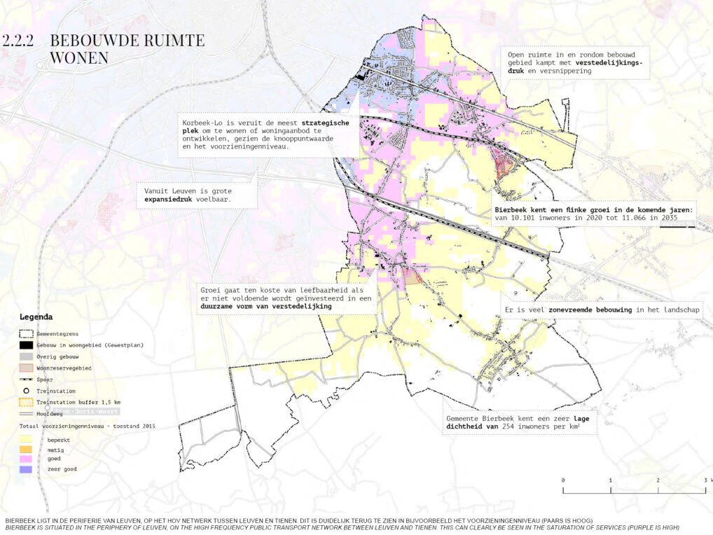 Gemeente Bierbeek is gelegen tussen Leuven en Tienen die worden verbonden door de Tiensesteenweg. Aan deze corridor liggen de grootste kernen van de gemeente; Korbeek-Lo en Lovenjoel. Als fusiegemeente wordt bebouwing in Bierbeek echter voornamelijk verdeeld over deze twee kernen, maar ook over Bierbeek dorp als hoofddorp. Door het uitdijende Leuven neemt de verstedelijkingsdruk op de gemeente met hoog tempo toe, net zoals het verkeer dat daarmee gepaard gaat. De lokale infrastructuur piept en kraakt onder het sluipverkeer. De gemeente staat voor een keuze: ofwel omarmen ze de door Leuven voorgestelde lobbenstructuur en wordt ontwikkeling van hoofddorp Bierbeek gestaakt, ofwel ontwikkelen ze gespreid door en lopen het risico bestaande kwaliteiten op het gebied van natuur en leefbaarheid te verliezen.