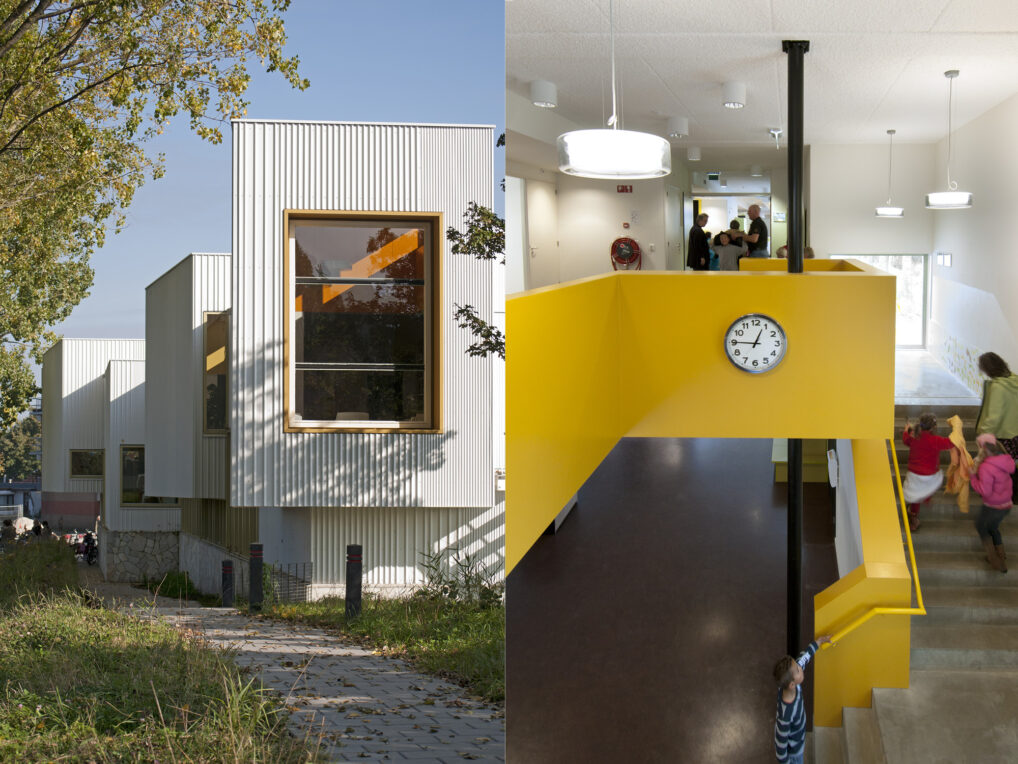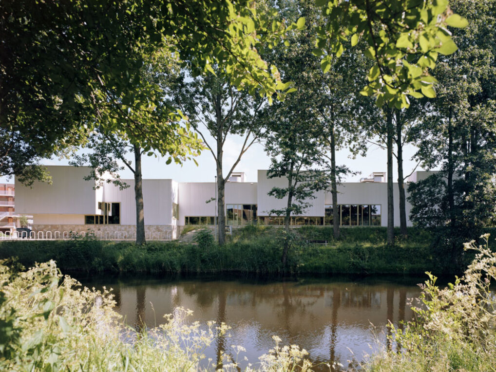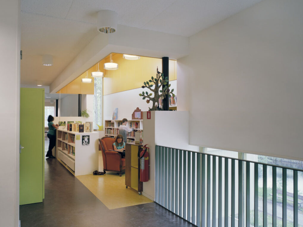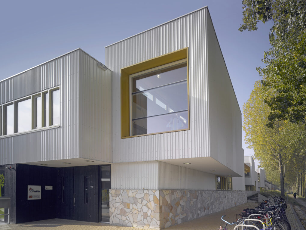 Subtiele hoekverdraaiingen in deze ruimtes creëeren lange zichtlijnen over het kanaal. De grote hal staat in open verbinding met het verdiept gelegen speellokaal. Hierdoor kan de hal ook als podium dienen met het publiek in het speellokaal. Een acht meter brede trap stijgt met de dijk mee naar de verdieping, en dient tegelijkertijd als zitobject. De school is het nieuwe beeldbepalende gebouw van de wijk Beijum. Het exterieur van de school kreeg een frisse aanblik. De kleur wit overheerst en contrasteert met de sombere, grijsbruine tinten van de omliggende gebouwen. De gevels aan het schoolplein krijgen een ‘warme’ houten bekleding.