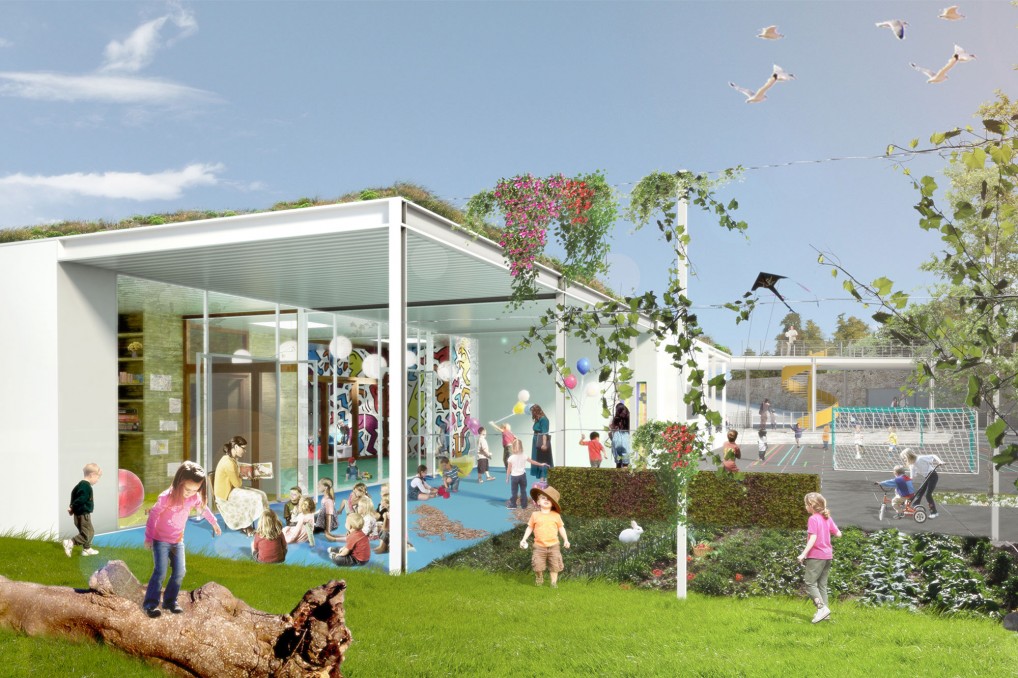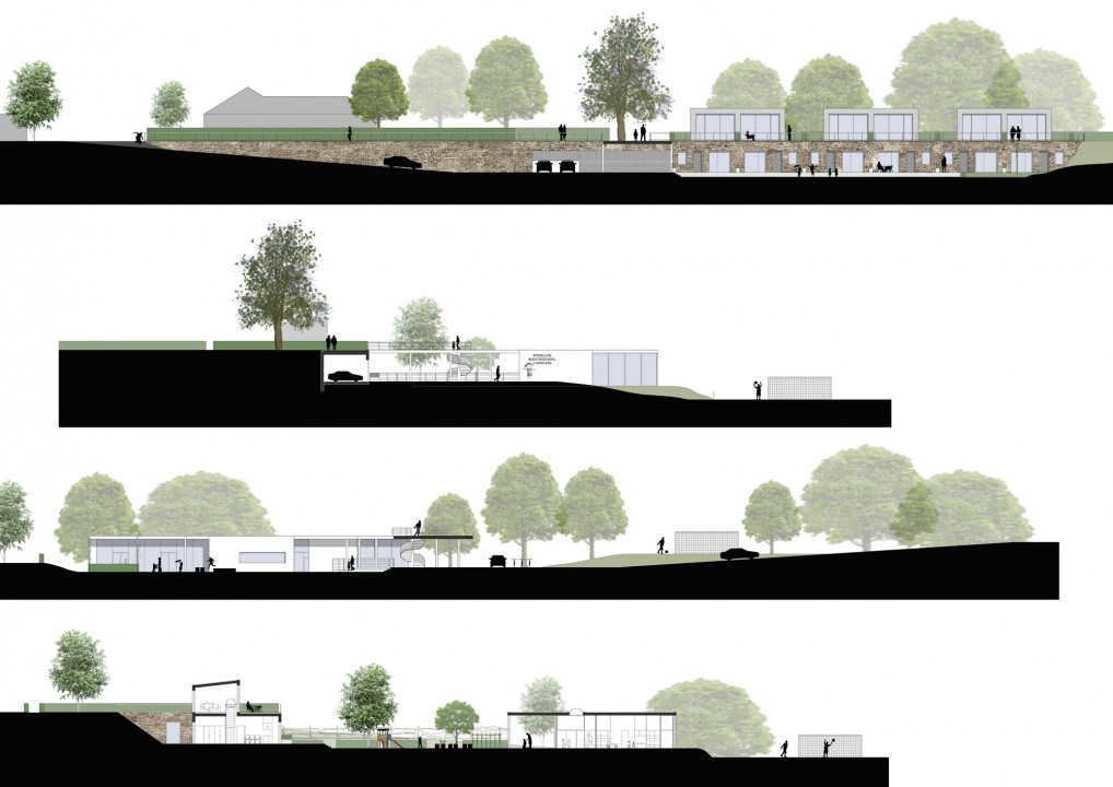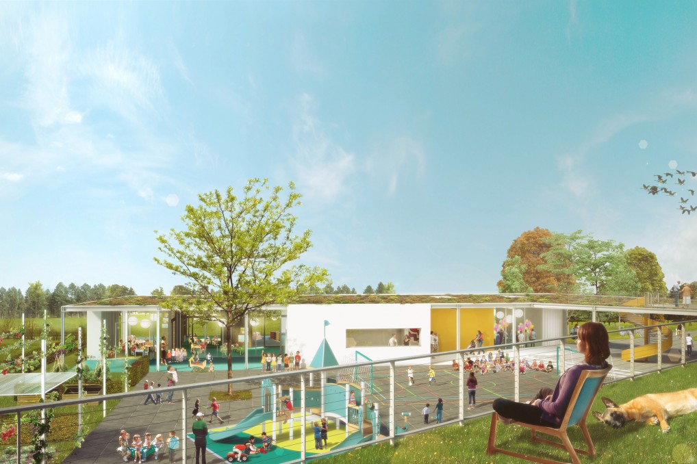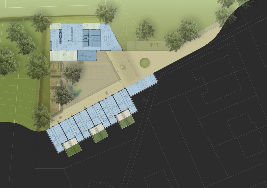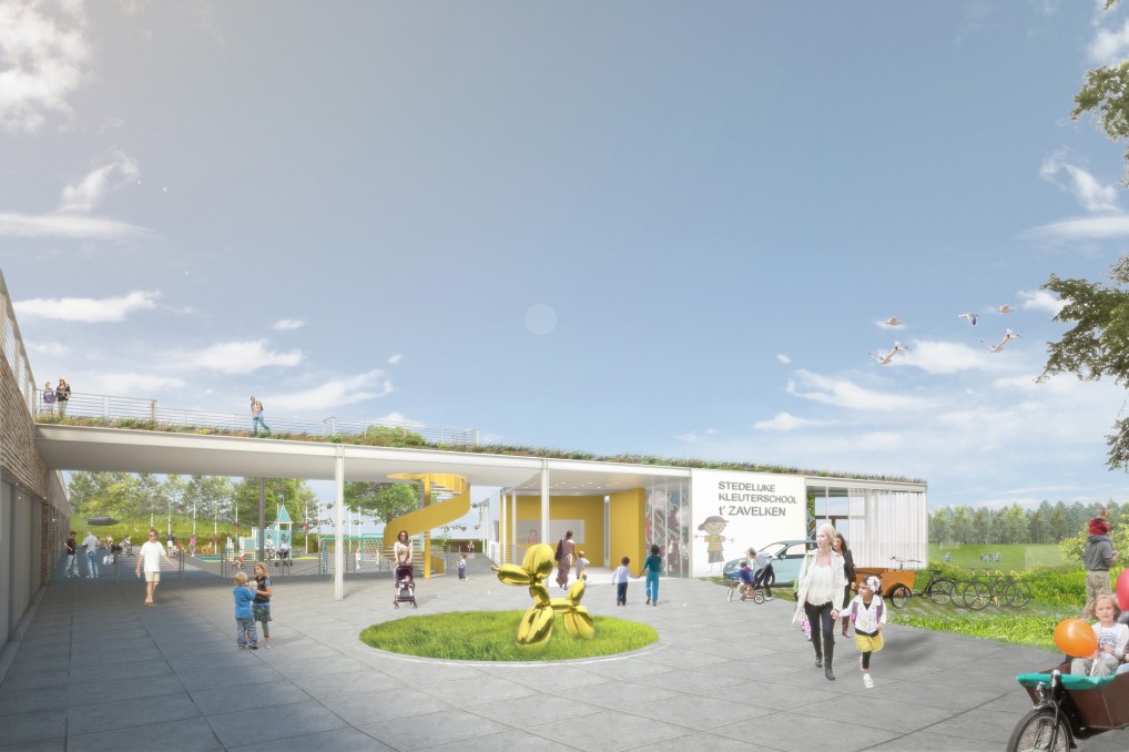 De huidige school ‘t Zavelken voldoet niet meer en wordt herontwikkeld. Deze kans wordt aangegrepen om een totaalproject te realiseren met een nieuwe kleuterschool en 6 nieuwe koopwoningen voor jonge gezinnen. De site wordt getypeerd door de rustige en vooral groene omgeving aan de Ronsevaaldreef in Erembodegem vlakbij het kasteel van Ronsevaal en het natuurgebied de Gerstjens. Het is de opgave om zowel school als woningen een volwaardig deel te laten uitmaken van de bestaande verkaveling. De nieuwe school dient op te gaan in de nieuwe woonomgeving. De speelplaats wordt dan een plein waar verschillende activiteiten kunnen doorgaan, ook voor de omwonenden. De gebouwen worden op die manier zo optimaal mogelijk benut. Dit schept randvoorwaarden voor de openbare ruimte en het schoolplein, maar ook voor het schoolgebouw zelf. Het hoogteverschil in de omgeving van de Ronsevaaldreef is markanten geeft de plek natuurlijk, fantastisch uitzicht over het groen in de directe omgeving.