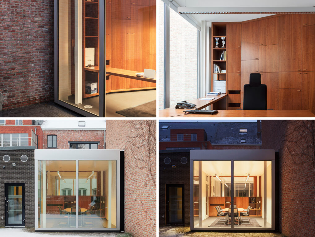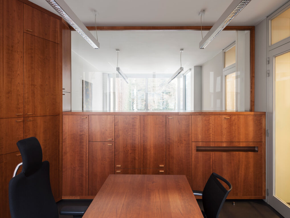 De vergaderruimte van 21m² en het kantoor van 18m² zijn fysiek maar niet visueel van elkaar gescheiden. Het sleutelelement in dit ontwerp is het meubilair in kersenhout. Het op maat gemaakte element zorgt voor voldoende opslagruimte voor onder andere verwarmingselementen, printers, papiermanden en zelfs een koffiemachine. Het meubel werkt als één grote machine die de ruimte opdeelt.