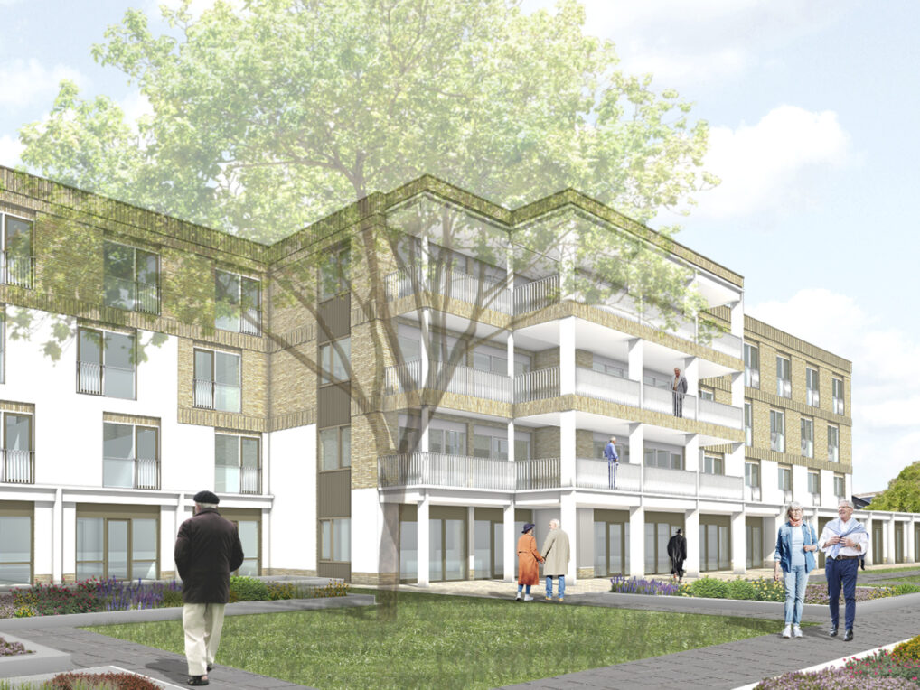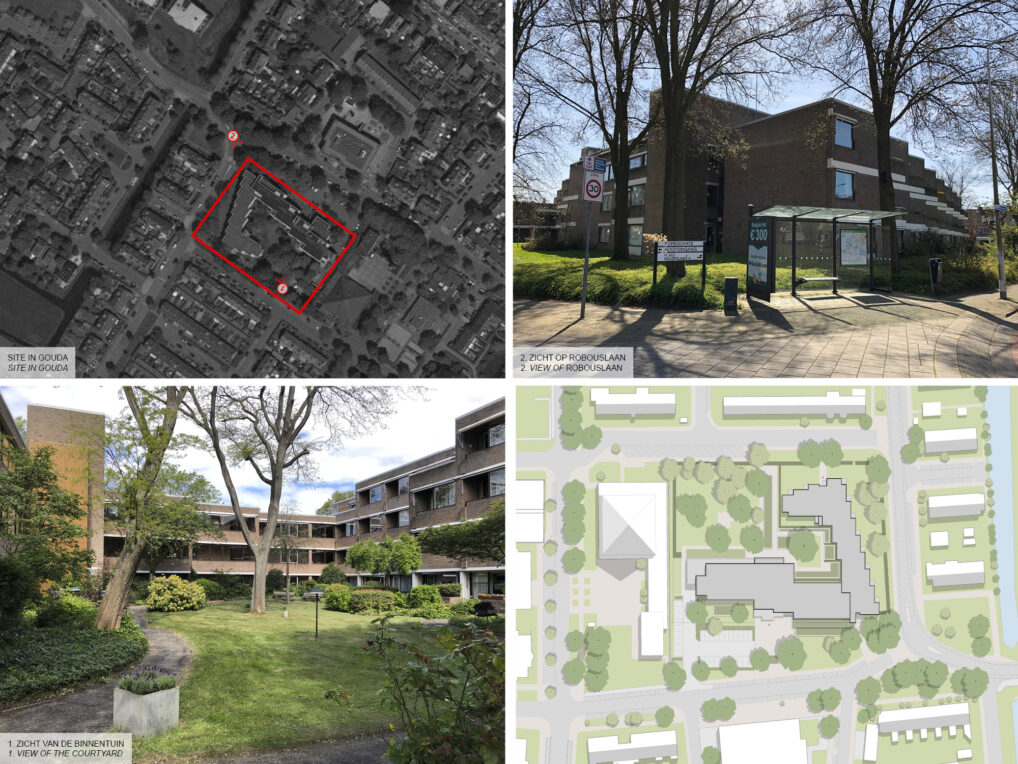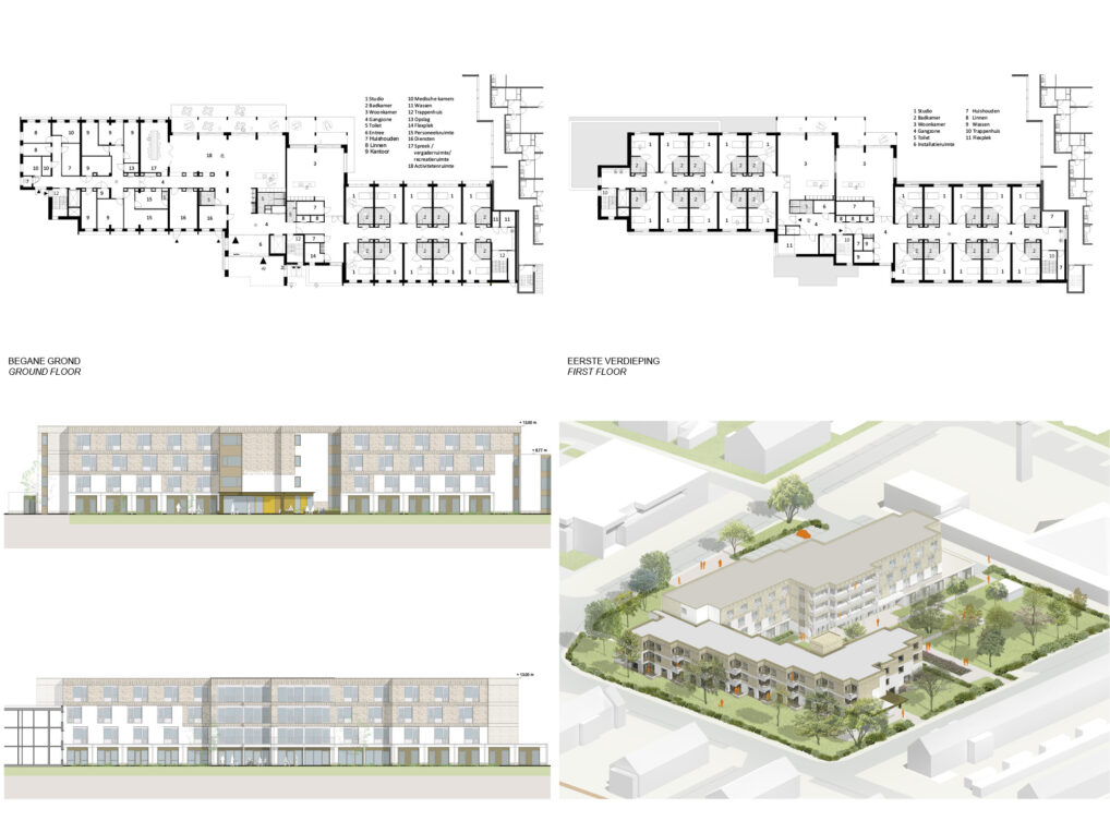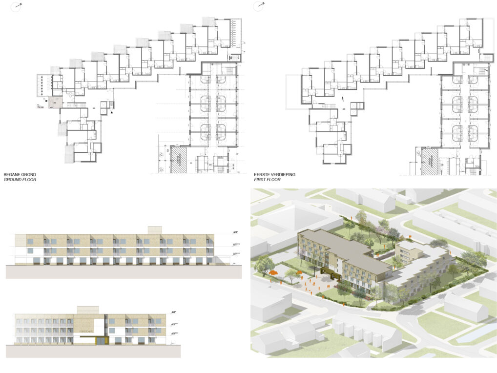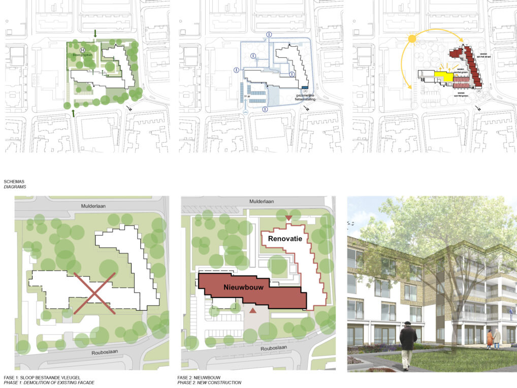 De bestaande vleugel met de zorgvuldige ontworpen gestaffelde zelfstandige woningen (aanleunwoningen) met individueel balkon worden gerenoveerd. De getrapte opbouw van de plattegronden en gevel zorgen voor een passende schaal in de wijk. Gekozen is de beide vleugels stedenbouwkundig als een ensemble te benaderen en eenheid te zoeken in de gevelmaterialisatie. Een lichte uitstraling passend in de wijk. De gevelopbouw is verder opgedeeld in een herkenbare opgetilde plint met grote markante luifel aan de entreezijde als een herkenbaar gebaar naar de wijk en een geleidelijke overgang van het voorterrein naar de centrale hal. De zorgappartementen op de verdiepingen zijn individueel herkenbaar in de gevel en verspringen t.o.v. van elkaar zodat de gevel een vriendelijke uitstraling vertoont. Ter plaatste van de woonkamers aan de binnenhofzijde zijn grote verblijfsbalkons gesitueerd. Verder zijn de plattegronden zo ontworpen dat de individuele zorgappartementen later geschakeld kunnen worden en er 2 kamerwoningen van kunnen worden gemaakt vertoont. Ter plaatste van de woonkamers aan de binnenhofzijde zijn grote verblijfsbalkons gesitueerd. Verder zijn de plattegronden zo ontworpen dat de individuele zorgappartementen later geschakeld kunnen worden en er 2 kamerwoningen van kunnen worden gemaakt.