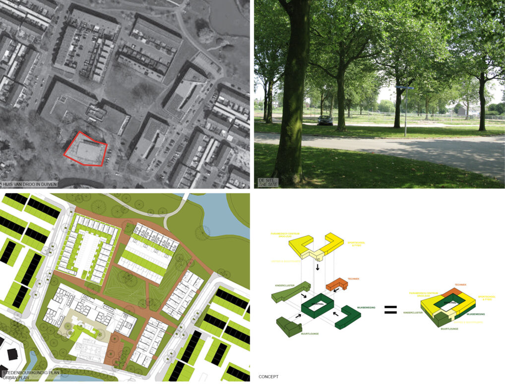 De gemeente Duiven wil Droo-Zuid ontwikkelen tot het hart van een buurtoverstijgend woonservicegebied. Doel is om oude én jonge mensen met een zorgvraag in de wijk te laten wonen, temidden van hun familie, buren en vrienden. Wij ontwikkelden met gebruikers een buurthuis ‘nieuwe stijl’; het Huis van Droo, het nieuwe hart van deze wijk. De sporthal in het centrum van het gebouw wordt ingepakt door het andere programma. De buurtlounge, gericht op de entree van de wijk, is het meest publieke deel, verder zijn er nog een kinderdagverblijf, een eerstelijns zorg en andere buurtondersteunende functies gevestigd in het gebouw.