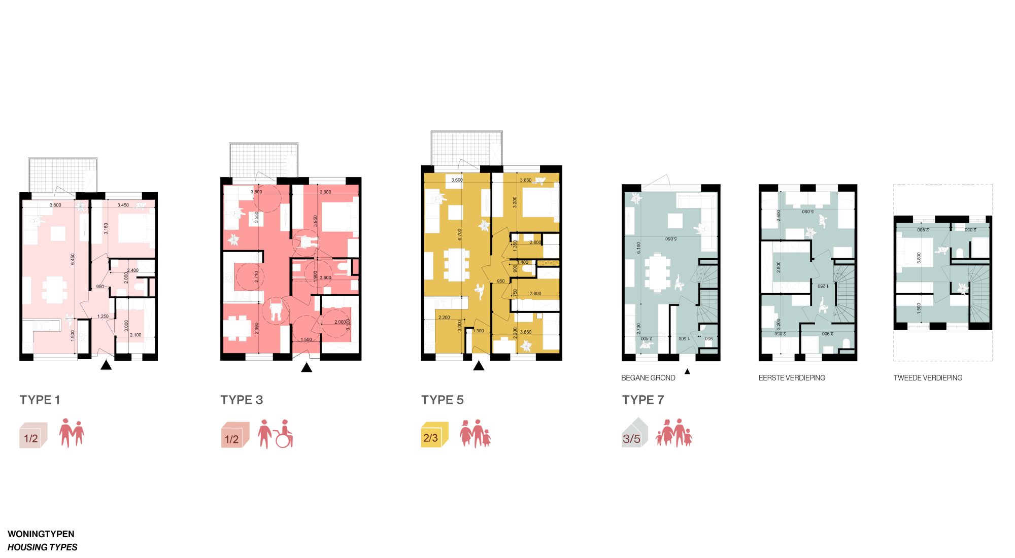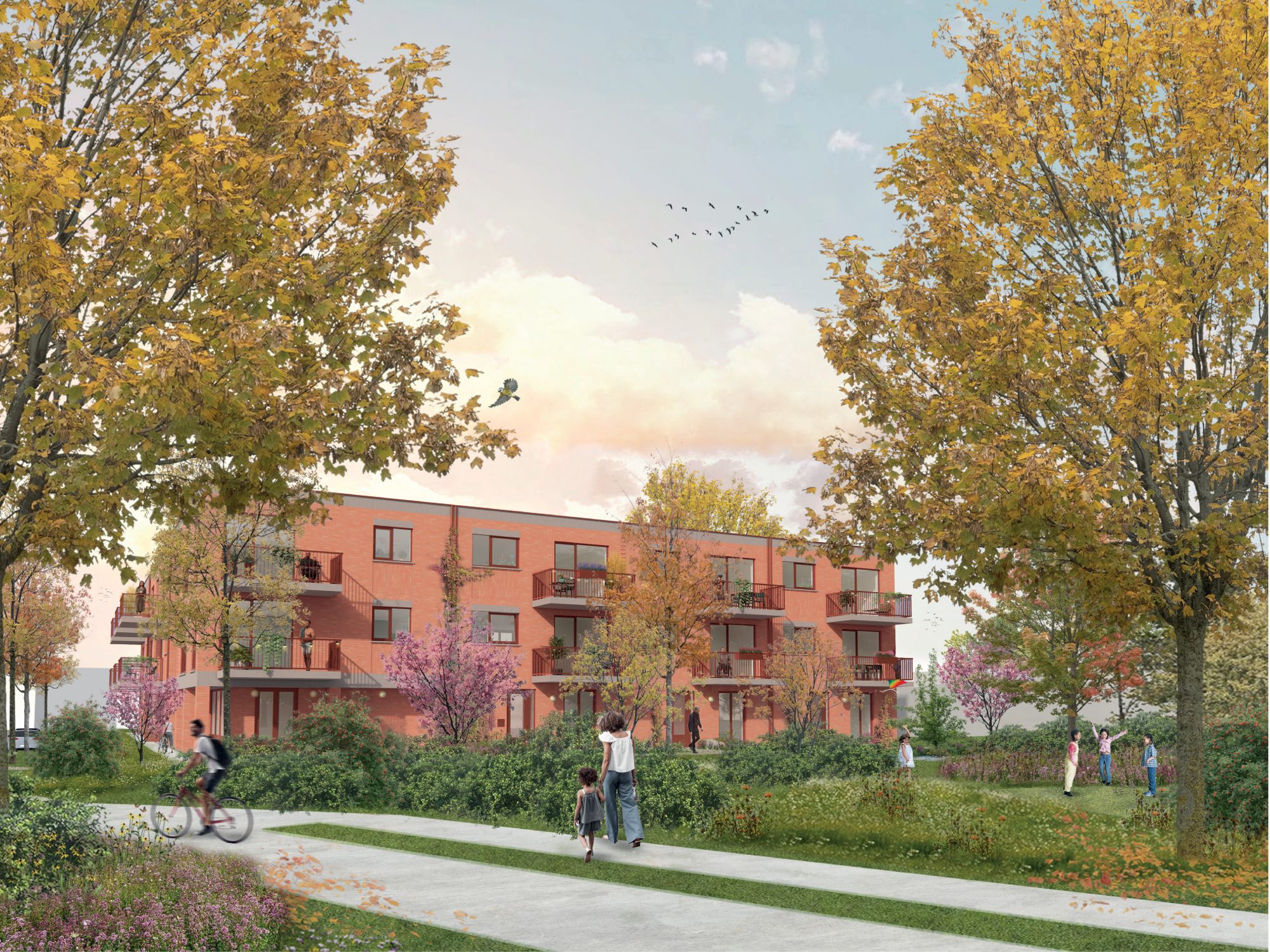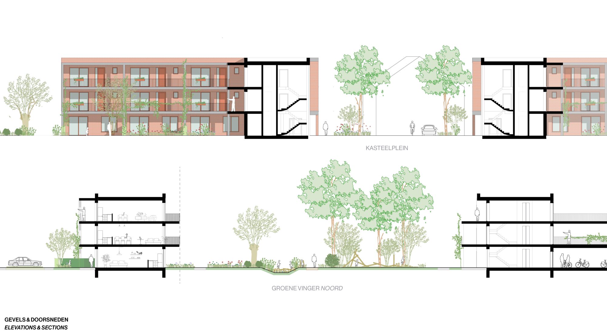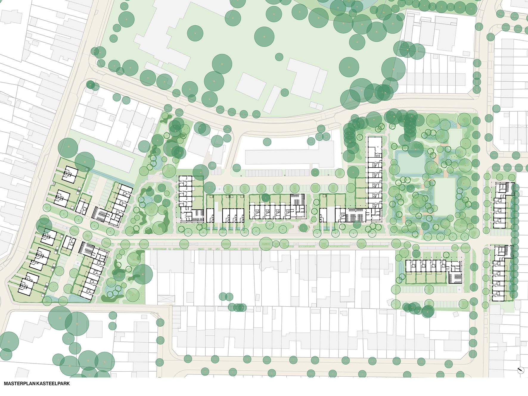 Het plan omvat 152 nieuwe wooneenheden, verdeeld over de drie woonhoven en bestaande uit een mix van woningtypes. Laagbouwvolumes worden georganiseerd rond semi-private binnenhoven, waar tuinen en parkeren zorgvuldig worden geïntegreerd. Entrees en balkons zijn georiënteerd op het Kasteelplein, de bestaande openbare straat, die wordt getransformeerd tot een duidelijke noord-zuidas. Deze as ondersteunt niet alleen het waterbeheer, maar vormt ook een rustige en samenhangende sociale en stedelijke verbinding doorheen de wijk.