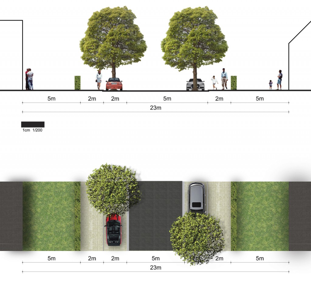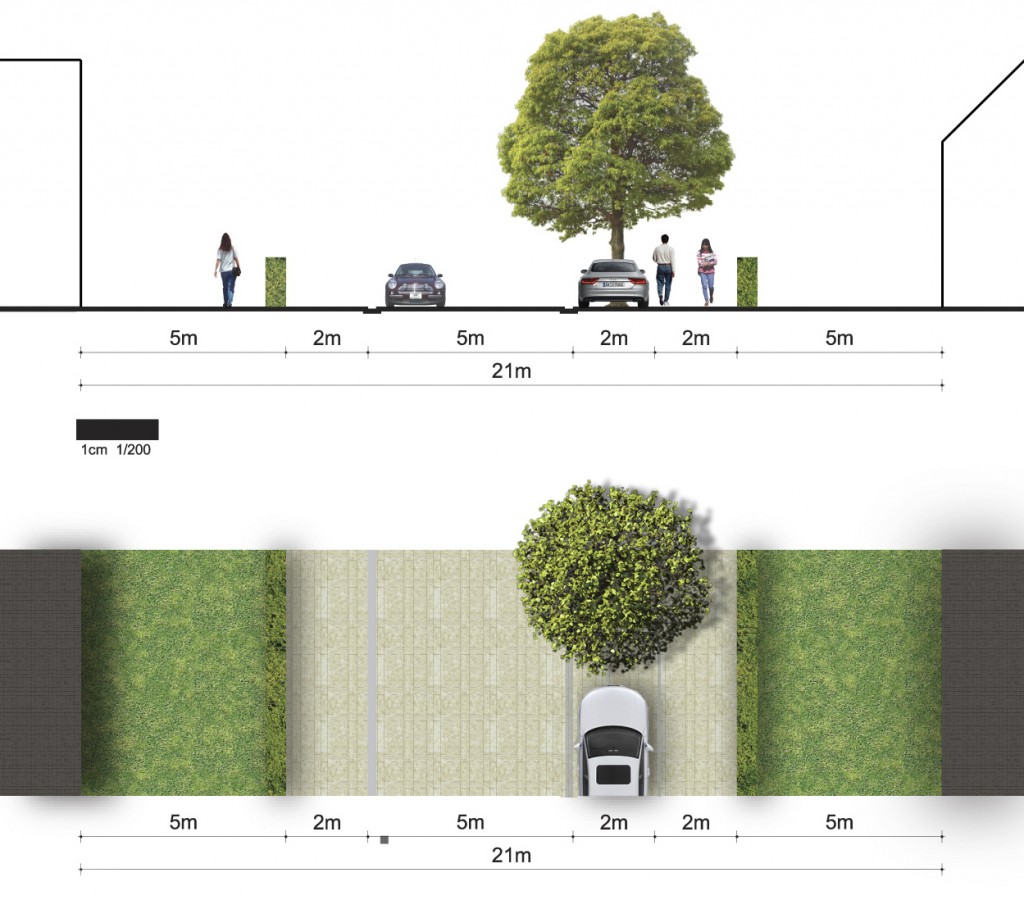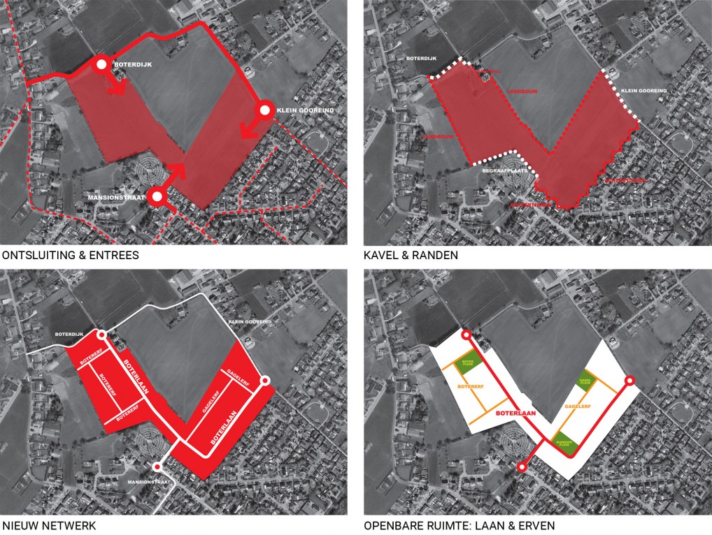 Het plan is opgezet als een eenvoudige verkaveling. De nieuwe ontsluitingen sluiten naadloos aan op de bestaande wegen die de omliggende woningen bedienen. Er is gekozen om één nieuwe straat aan te leggen met de allure van een laan. Op de laan sluiten twee ‘lusjes’ aan die de nieuwe woonerven zullen ontsluiten.