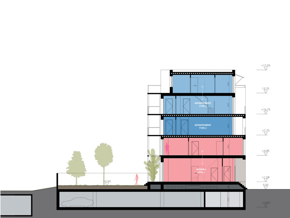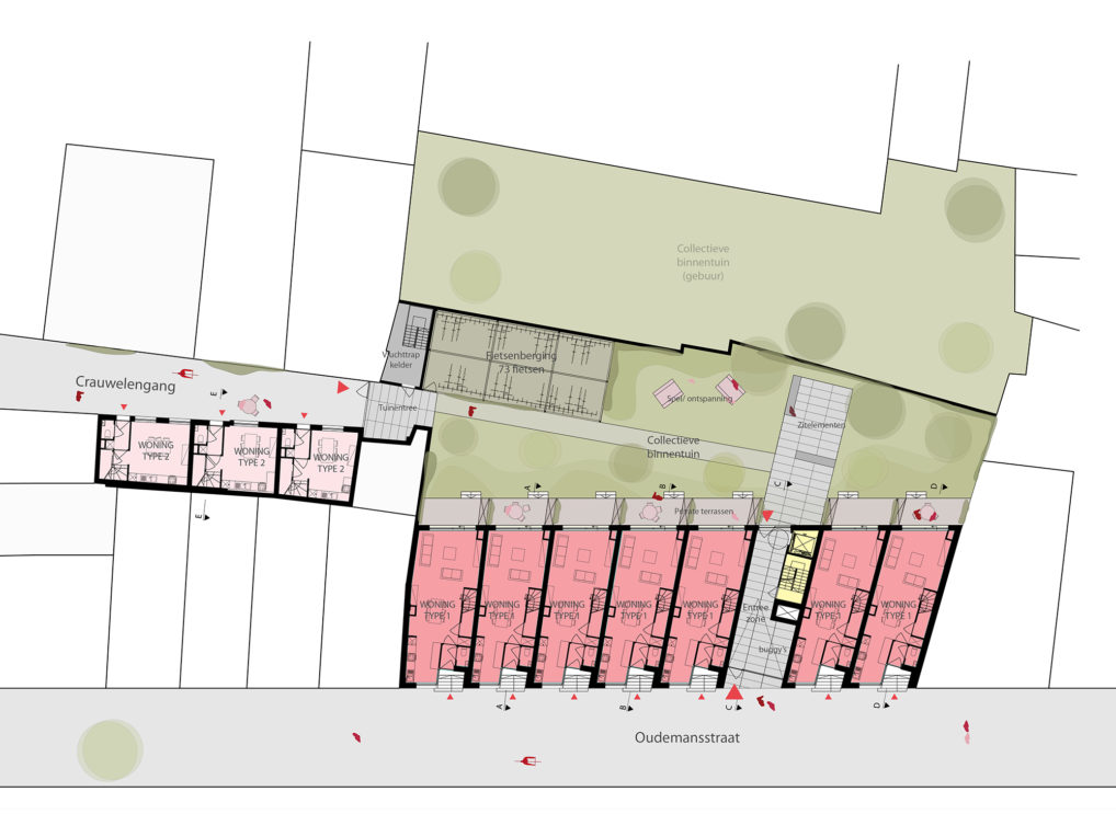 Revitalisatie van het Schipperskwartier tot een woonbuurt met het creëren van een eigentijds en aantrekkelijk woonklimaat door de renovatie van een appartementencomplex. Het project bestaat uit twee afzonderlijke gebouwen, waarbij het gebouw aan de Crauwelengang en het appartementsgebouw aan de Oudemansstraat hun entrees hebben aan de respectievelijke straten waaraan deze gebouwen liggen. Aan de buitenzijde vormt het gebouw een voortzetting van de straatgevel met een robuust grid waarmee de straat als stedelijke ruimte duidelijk wordt gedefinieerd en de kavelstructuur van de historische binnenstad wordt gevolgd. De achterzijde wordt gekenmerkt door een fijne stalen passerelstructuur die als inkompasserel dienst doet voor de bovenliggende appartementen. De gehele binnenruimte (binnentuin met achtergevel) vormt een lichte en groene omgeving midden in de stad. Speciale aandacht is besteed aan de inkomzones van de woningen. Dit is het deel van het gebouw dat de meest directe relatie aangaat met de publieke ruimte. De trap is een transitiezone tussen privé en publiek waar de bewoners in hun eigen plek aan de straat kunnen zitten. Ook de rest van de gevel is met zorg en detail ontworpen zodat deze het straatbeeld verrijkt. Hierin speelt het spel tussen open en gesloten geveldelen en de detaillering een belangrijke rol.