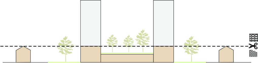 Ons voorstel zoekt naar de juiste insteek met betrekking tot de woningen en inrichting van de publieke ruimte om deze plek te transformeren naar een woonomgeving met een eigen karakter, ingebed in de omgeving. Identiteit, welbevinden, veiligheid en geborgenheid zijn de kernwaarden. Gezien de specificiteiten van de locatie wordt ingezet op de kwaliteit van de eigen woon- en buitenruimte in combinatie met collectieve publieke ruimte afgestemd op de omgeving.