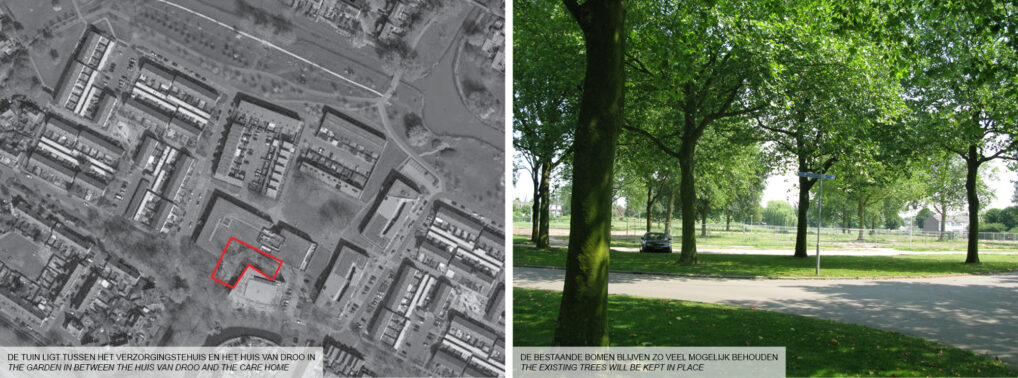 De ruimte tussen het nieuwe Huis van Droo en het verpleeghuis zal door beiden gebruikt worden. Aan de ene kant zullen de kinderen van het kinderdagverblijf er spelen, aan de andere kant zullen de ouderen de ruimte gebruiken als tuin. Samen is een plan gemaakt dat individueel, simultaan en samen gebruik mogelijk maakt en stimuleert. Er werd gezocht naar overeenkomsten tussen de kleinste kinderen en ouderen. Parcours in de tuin, veiligheid, overzicht en geborgenheid waren enkele concepten die meegenomen zijn in de uitwerking.