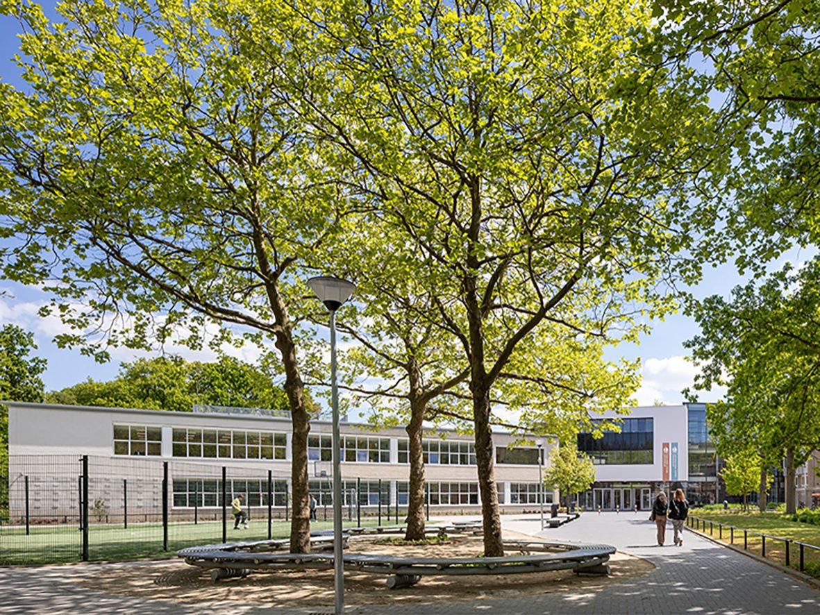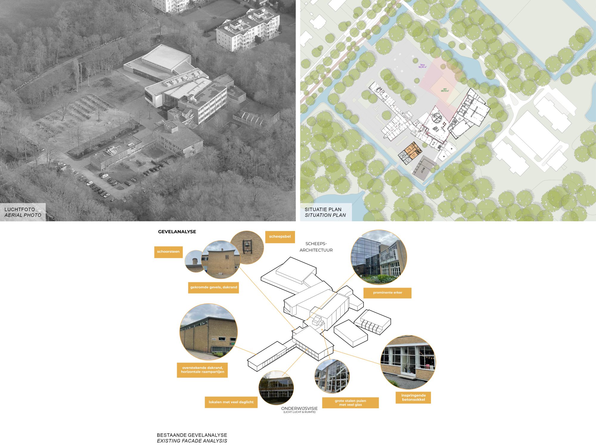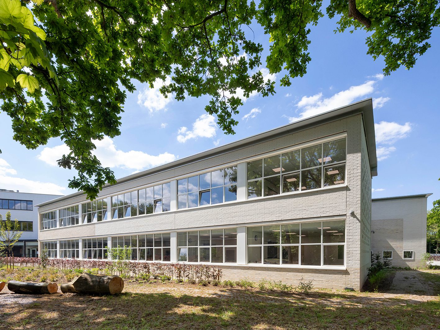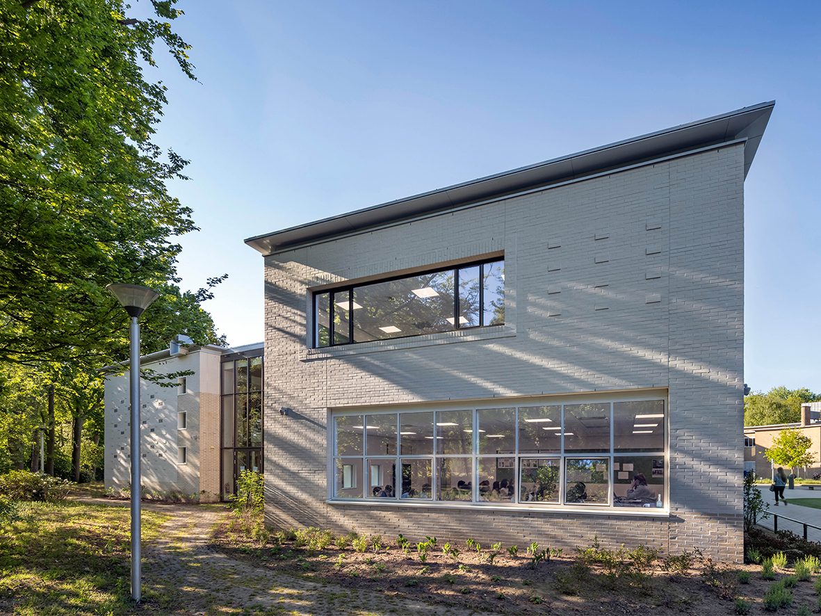 In een zorgvuldige analyse van het rijksmonument en zijn omgeving zijn een aantal kernmerken gevonden die als bruikbare ingrediënten voor de nieuwbouw hebben gediend. Denk aan volumetrische configuraties, verhoudingen in de gevels, architectonische ingrepen en elementen. De nieuwbouw zoekt in materiaal en compositie het verwantschap op met het monument, en maakt gebruik van gelijkaardige elementen zoals de opgetilde dakrand, de royale bandramen en een opgetilde sokkel. De nieuwe vleugel wordt met een klein afzonderlijk volume gekoppeld aan de school: een terugkerend thema in het monument. De positie tegenover de historische A-vleugel brengt beide volumes in evenwicht met elkaar, waardoor de benadering van de hoofdingang in balans is en meer vanzelfsprekend. Op deze wijze voegt de nieuwbouw een nieuwe tijdslaag toe aan de school, een hedendaagse interpretatie van de originele uitgangspunten.