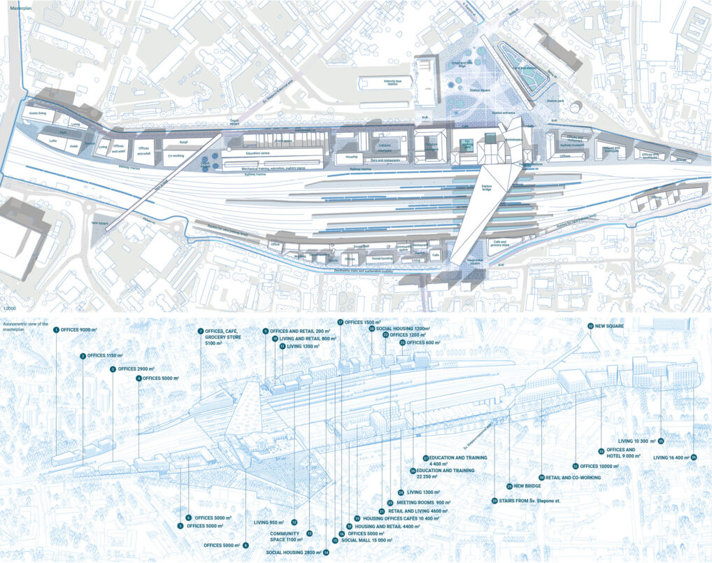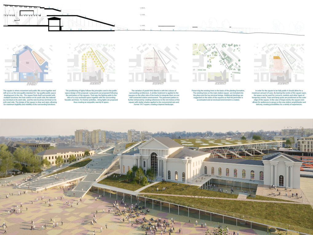 In ons voorstel vormt het station letterlijk een brug tussen de twee stadshelften. De brug passert bewust de restricties van het oude stationsgebouw en vormt een nieuwe entreehal. Het oude gebouw dat een nieuwe invulling krijgt, wordt daarmee in haar ere gelaten. Het bepleisterde erfgoed word omarmd door de nieuwe hal in een lichte houtstructuur en vormt daarbij een ensemble tussen oud en nieuw. Er wordt definitief gebroken met het gevoelige Soviet verleden, maar het wordt allerminst vergeten.Â