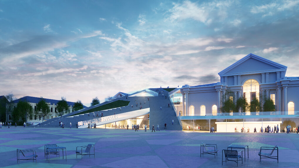Het hoogtverschil tussen de stadsdelen manifesteert zich als een tribunetrap die uitkijkt op het nieuwe voorplein en het leven dat zich daar verzamelt, met op de top, een wijds zicht over de stad. De nieuwe entreehal bevindt zich onder deze trap en gaat drempelloos over in het plein richting het stadscentrum met een tweede entree aan de andere kant van de brug.Â