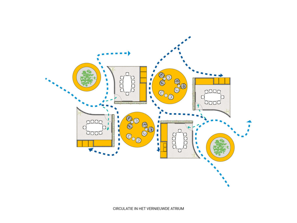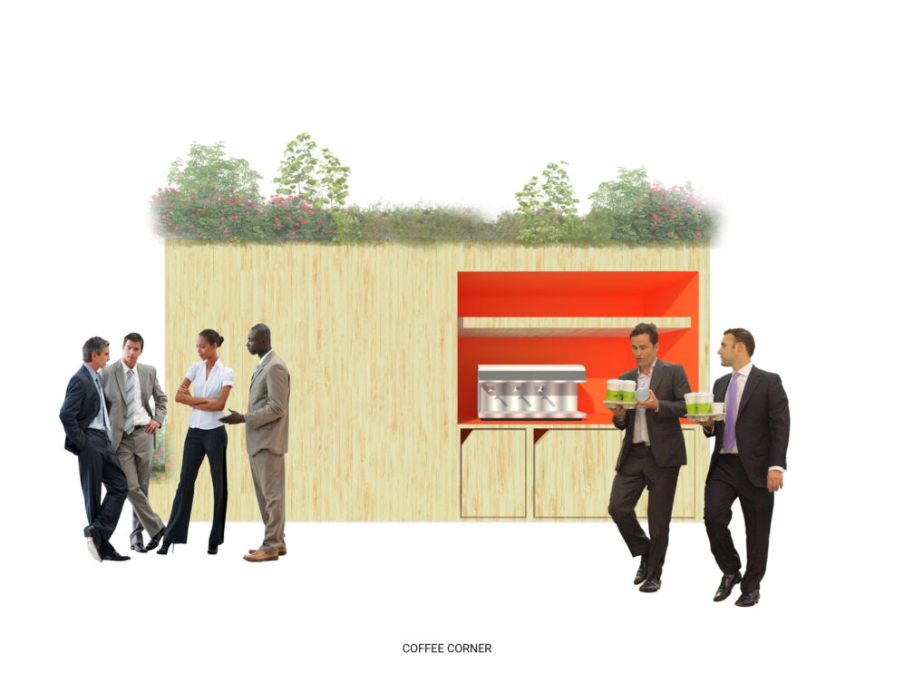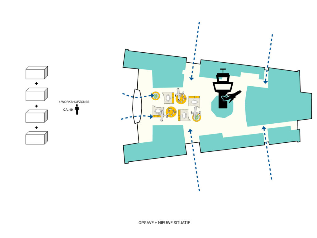 The project consists of 4 temporary workshop rooms for the International Brussels airport, in the entrance hall of the control tower building that was completed in 2005. The core of the hall is surrounded by the cafeteria and the auditorium. JDWA has been asked to solve the emptiness between the existing elements: the orange sitting areas, trying to create a strong dialogue with them and the generous roof light. In order to respond to temporary needs, fast installation and disassembly, the pavilions are made of wood. The main concept is to play with the natural light. The light enters the pavilions through the glass roof and then gets filtered by the wooden structure. In this way it is possible to see everything around it enjoy the natural light. As a marketing strategy, the corporate identity has been taken into account and the house style colours have been incorporated into the design (expo-walls). The interior is designed to be a flexible room where employees can have the space to co-create, write on the glass and relax on the couch. On the back side of all but one pavilion, an informal meeting space is integrated. In the other one the space is dedicated to a pantry. Each pavilion is 18 m2 suitable for 10 people.