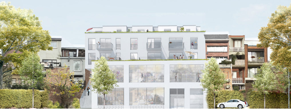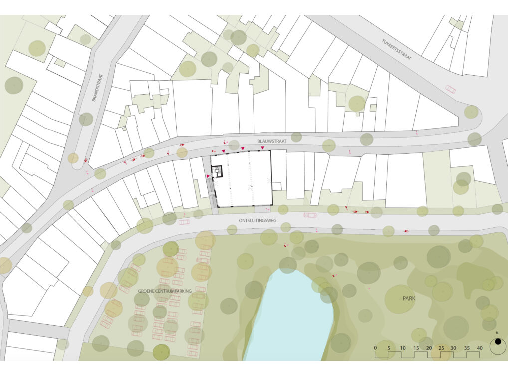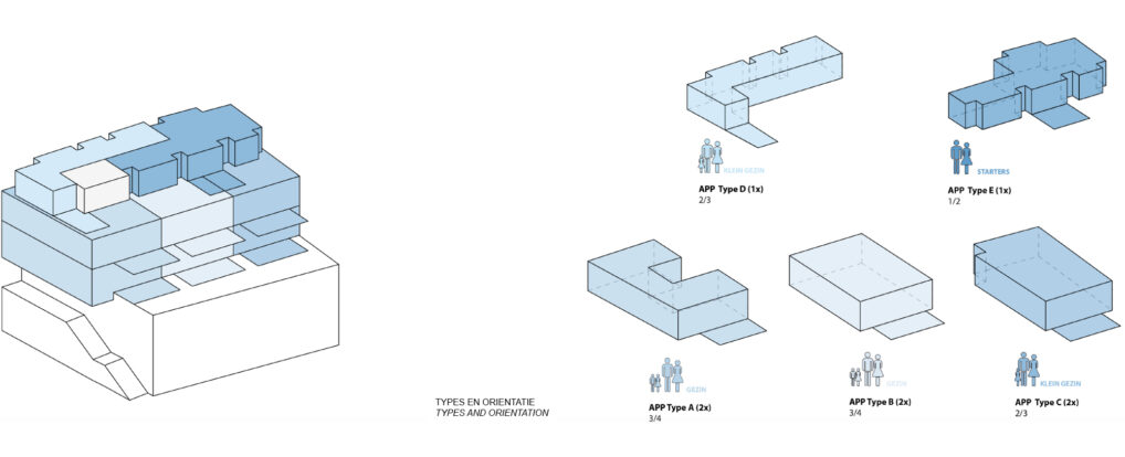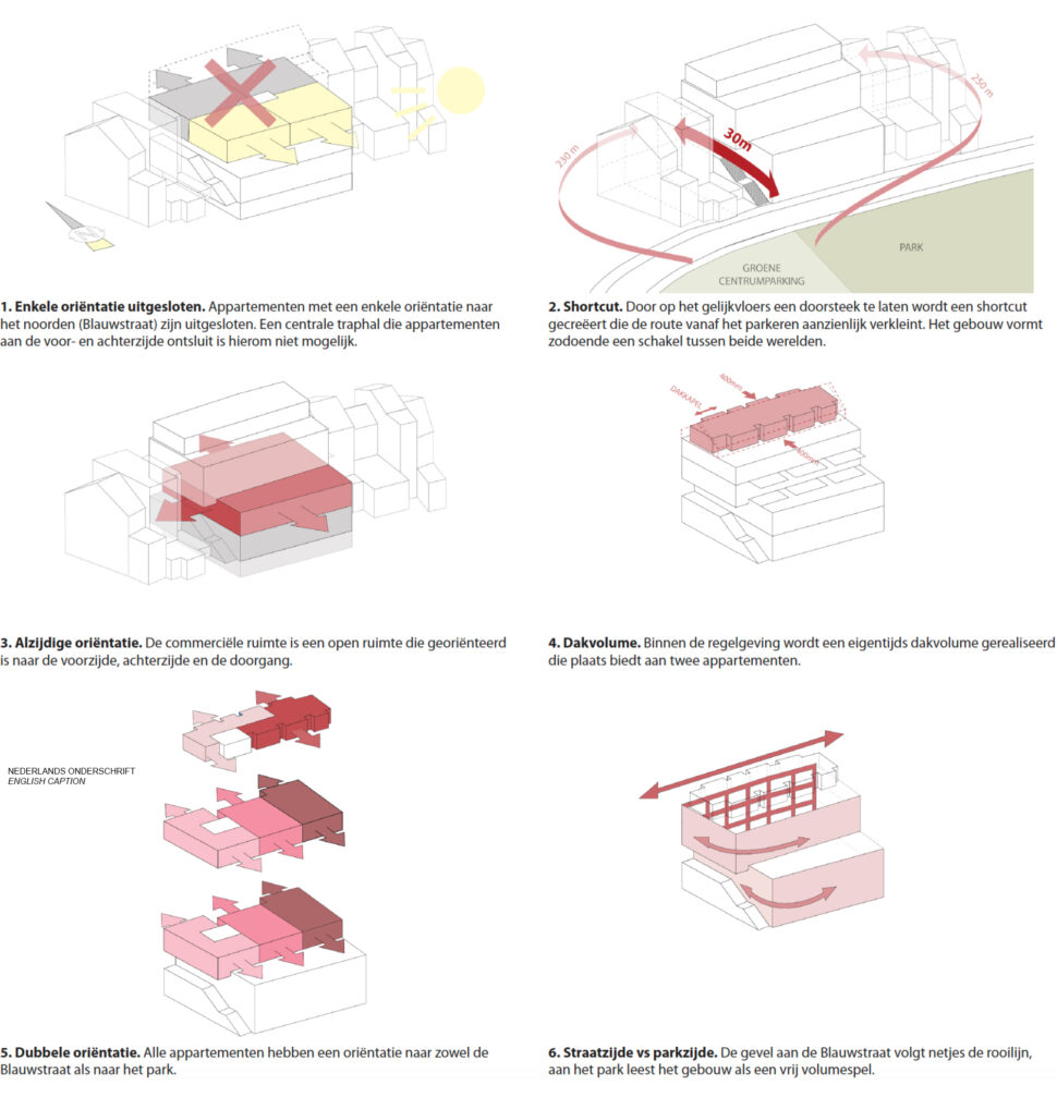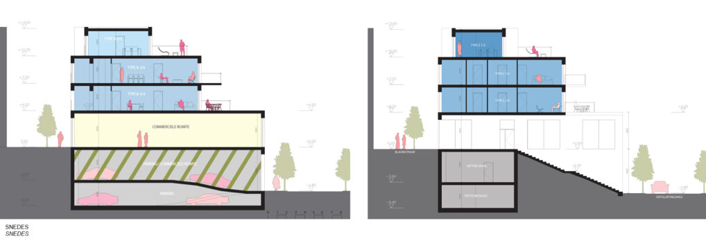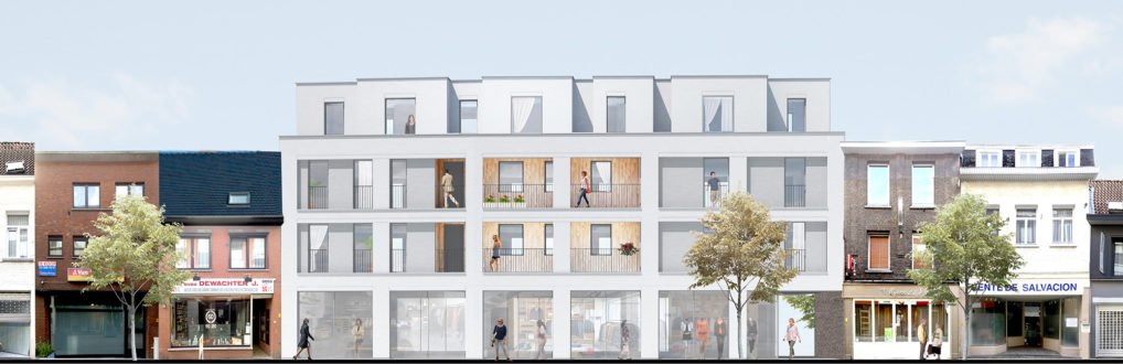 Goed Wonen Rupelstreek wishes to realize an apartment building with commercial spaces on Blauwstraat in Boom. This responds to the demand from, among others, the municipality to breathe new life into this historic shopping street. The starting points of the design are to realize the owner-occupied apartments in an efficient and high-quality manner in the available volume, alongside a commercial space on the ground floor. That commercial space can be classified as one or as three independent stores. The two (partly) underground floors include parking, bicycle parking and storage. The qualities of the specific location of the building between Blauwstraat and the green center parking are used by creating a short cut between the two in the form of a passage. This passage forms the link between the park (ren) and the city, making it an extremely central location where it is interesting for commercial functions to establish themselves. The building comprises eight apartments that are accessed via a central staircase and lift hall. All apartments have an orientation towards both Blauwstraat and the park. Large windows open onto the spacious, south-facing terraces that overlook the park. Because the warehouses of the commercial space are in the first basement floor, the entire commercial space can be used for primary sales space. This of course has a large glass section to Blauwstraat but will also have windows facing the alley and the park (ren) behind it. This increases visibility and the relationship with the area beyond. The building is constructed from light gray-colored facing brick. The facade is characterized by its formal grid structure that makes the scale of the apartments and the bay layout in the street facade legible. The gallery is finished with a light wooden finish, creating an attractive play between the brickwork and the wood in the street.