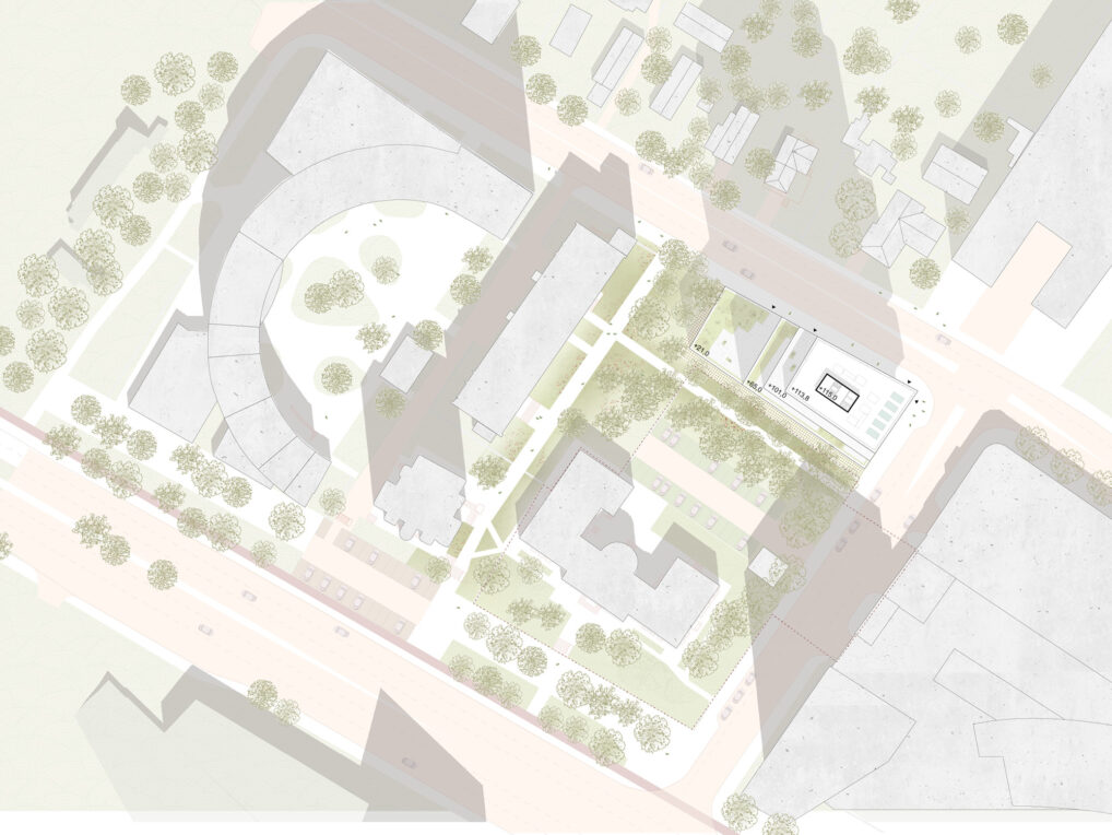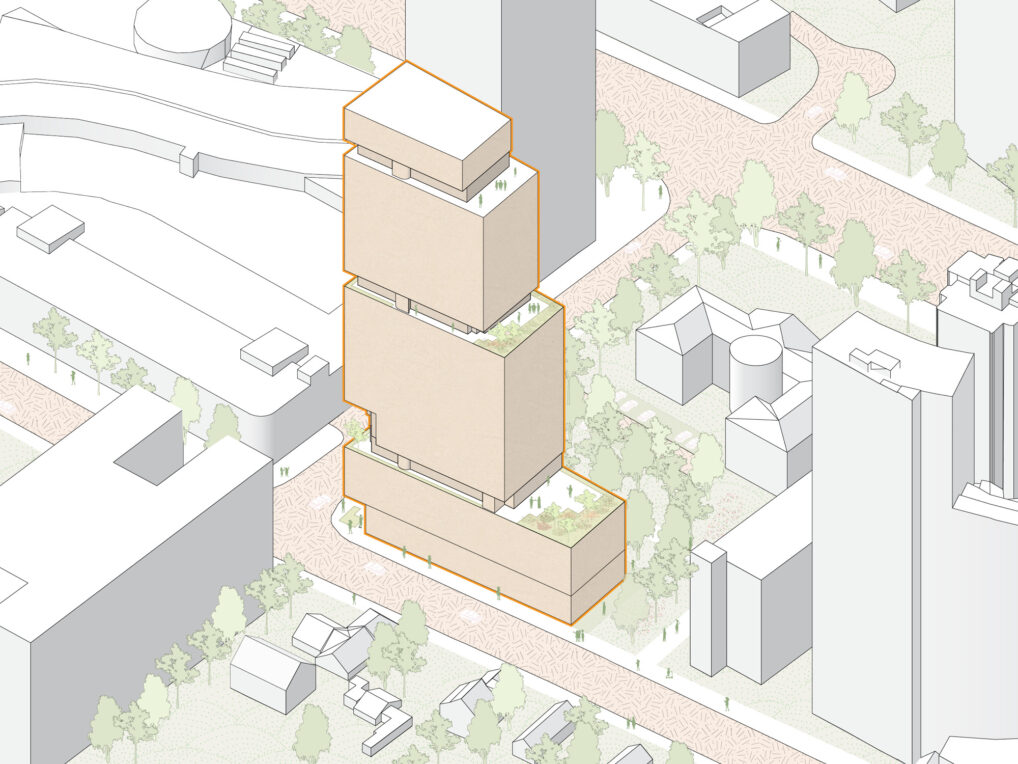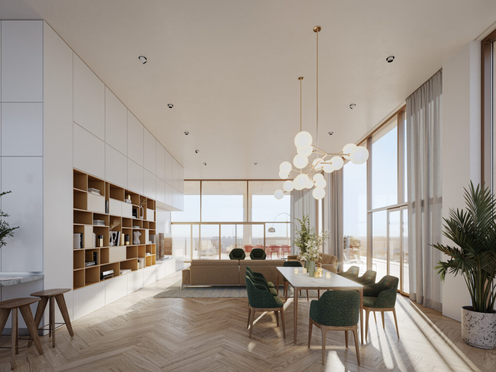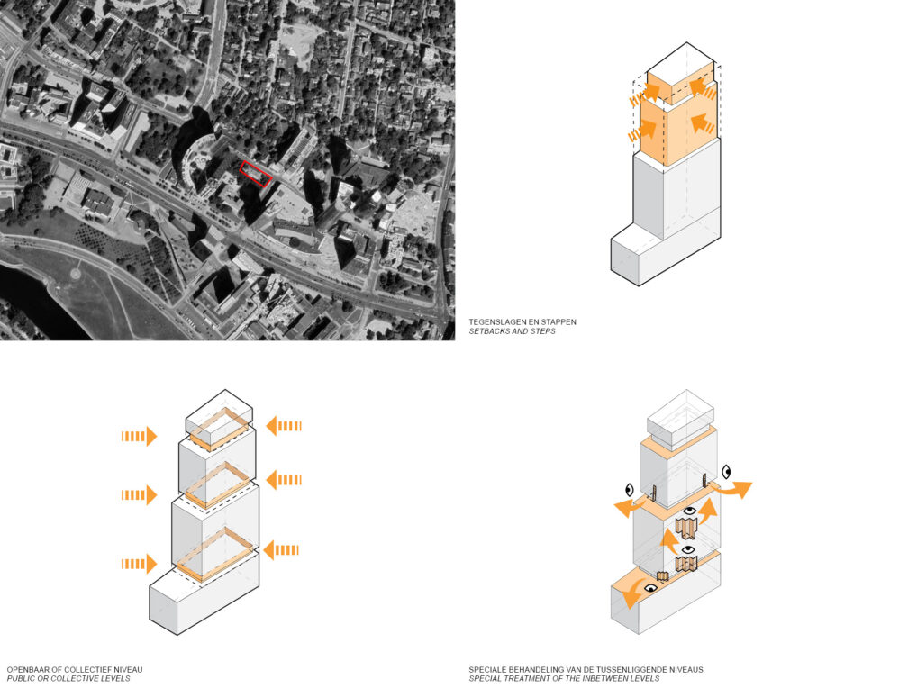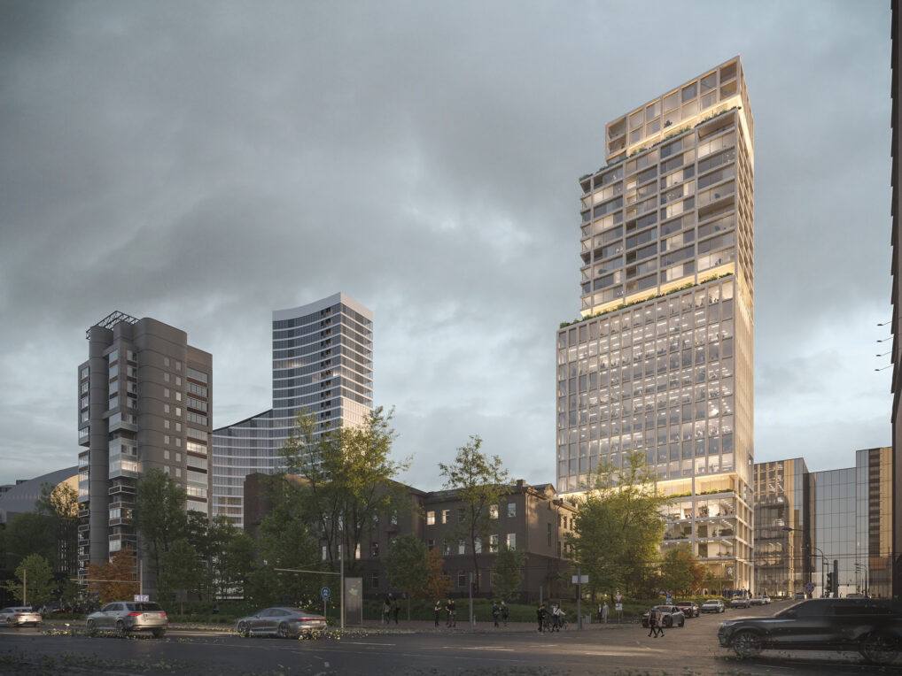 The aim of the project is to realize high quality housing and comfortable working spaces where the wellbeing of the dwellers and users is the first goal. Secondly, the building itself will be a sustainable and iconic addition to the Vilnius skyline and the Urban Hill concept of the CBD. And finally, the project will add liveliness to the cityscape of the business district by providing public and commercial program on the ground floor and the other publicly accessible floors of the building. The location in the heart of Vilnius’ business district is very special. The building sits in the middle of a large area that undergoes a huge transformation at the moment. Therefore, our project shows maximum respect for its surroundings (present and future) and aims to be a contemporary, but contextual addition to the city. Subtle transformations or setbacks in the west and south facades result in a contextual and intriguing volume matching the scale and size of surrounding buildings. Where the shape of the building changes, we offer attractive in-between levels with different (public or collective) programs, charging the city not only on street level, but offering “action” also on the upper levels of the building.