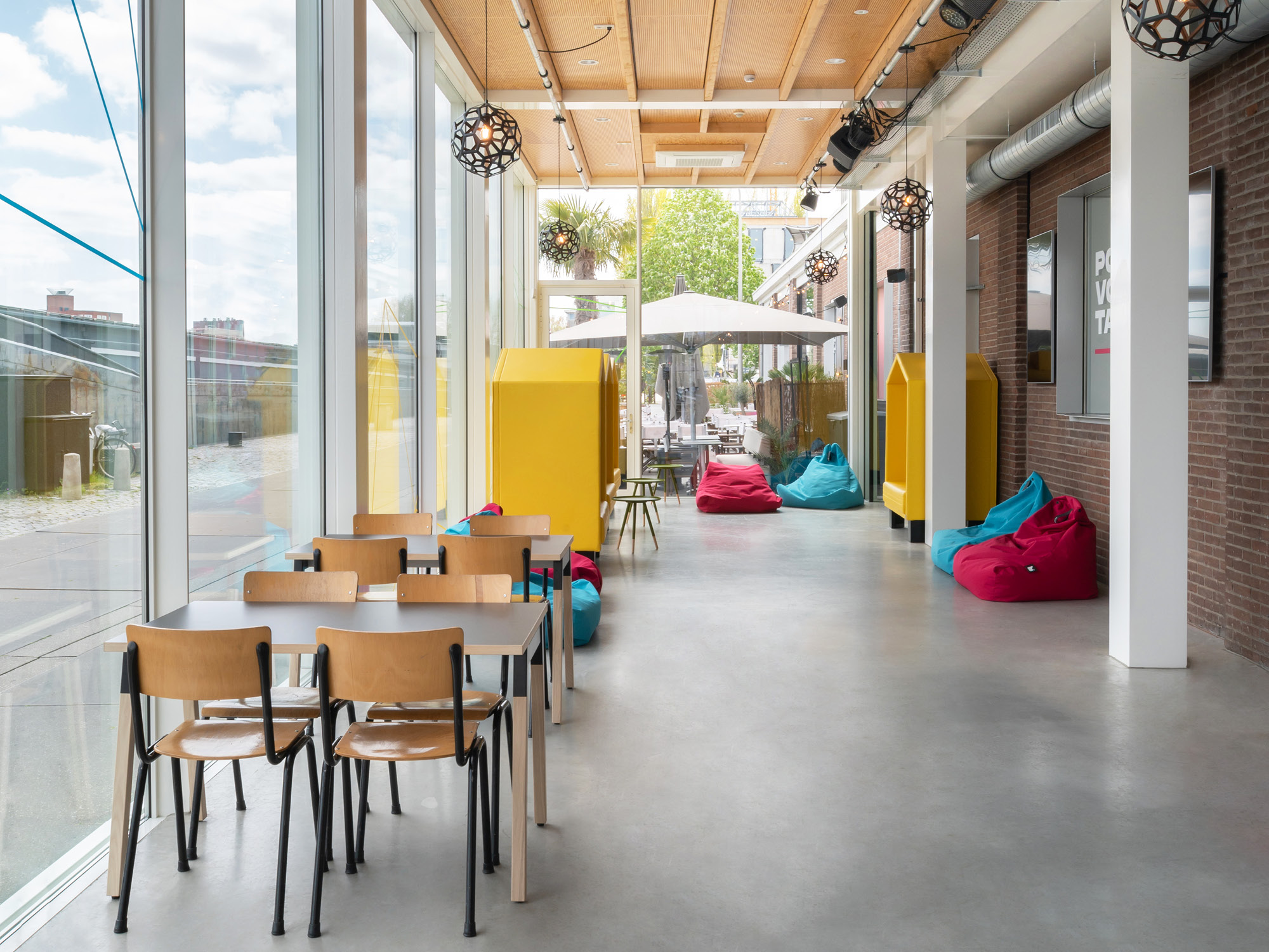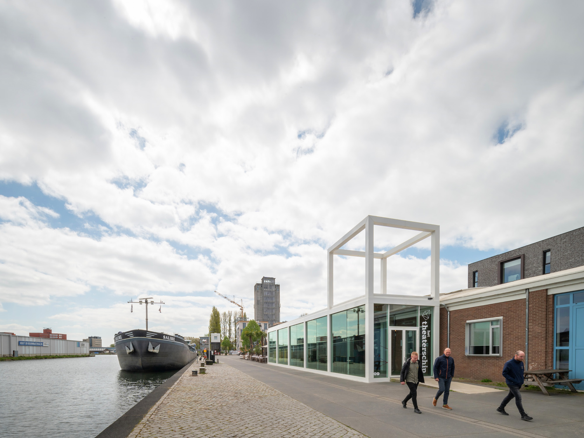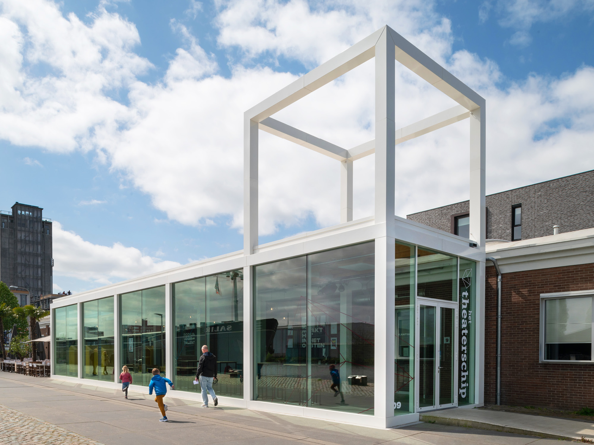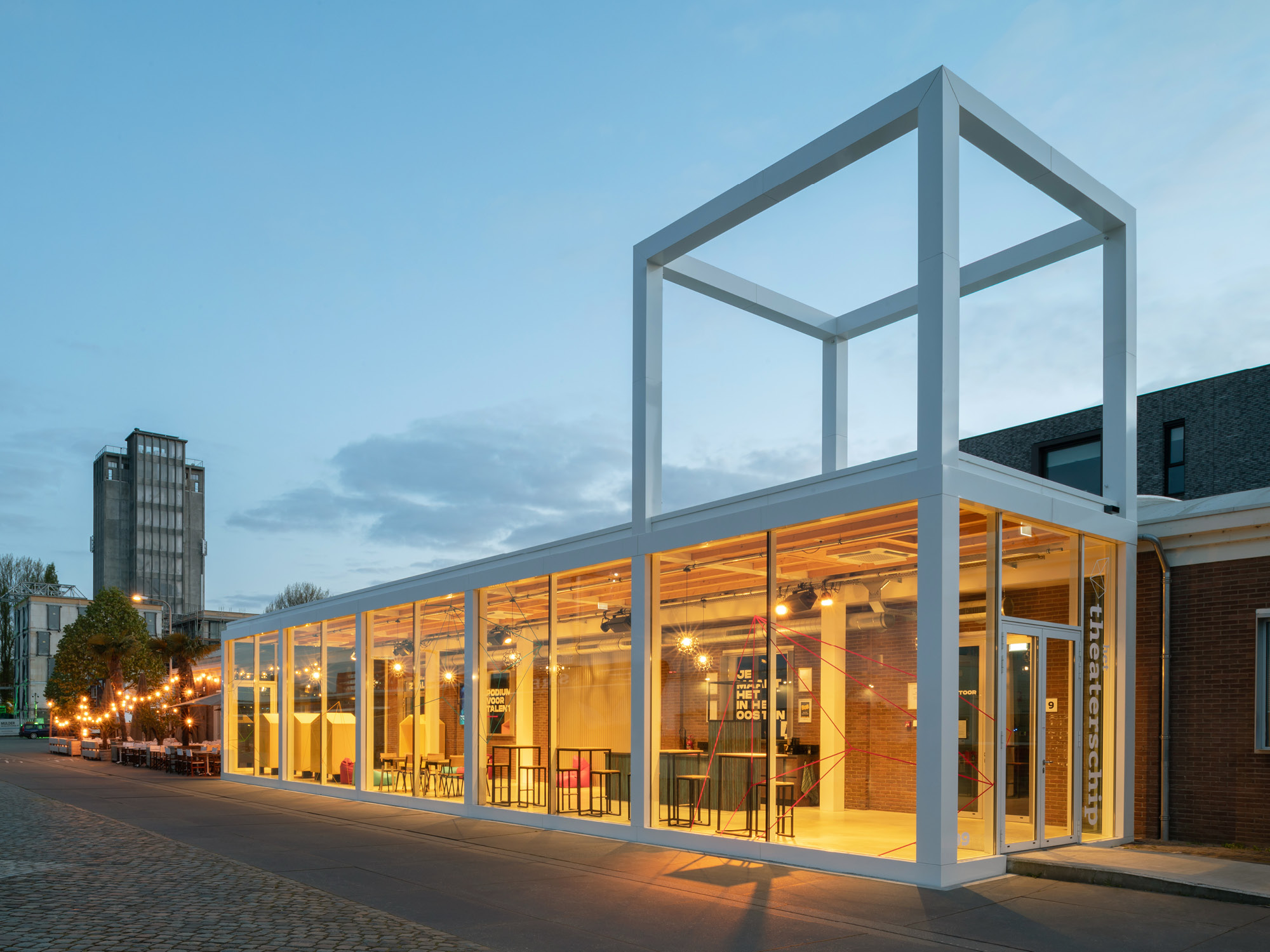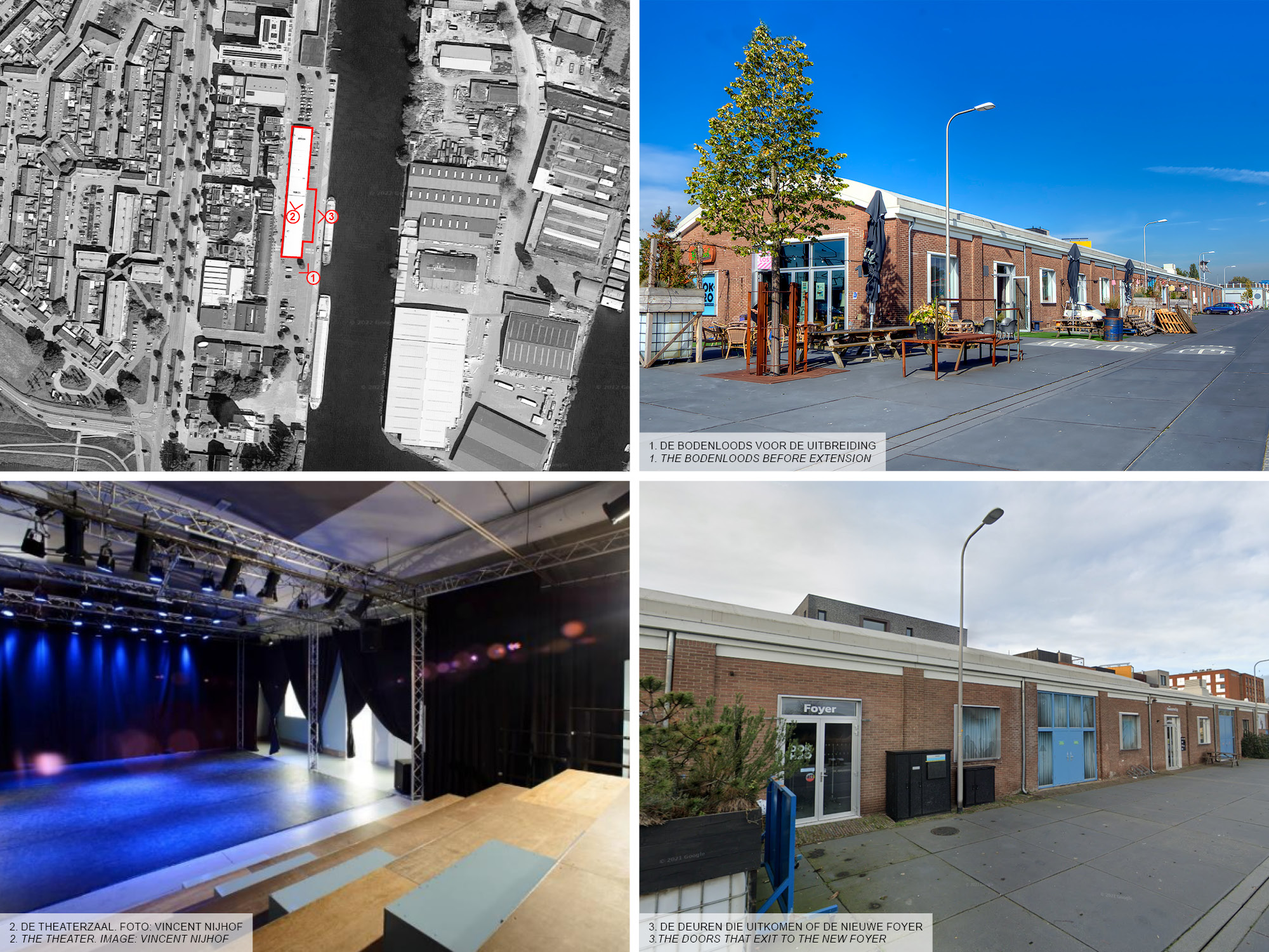 The Bodenloods was one of the first buildings in Deventers Havenkwartier (harbor district) that was transformed by Woonwerk to enable long term new use. Nowadays multiple businesses have found a home in the building like a photo studio, two cafe’s on the heads and in the heart the theater called ‘Theaterschip’. At this moment the cafe on the south side and the theater share a common foyer, but that is about to change. The cafe will extend into the current foyer leaving the theater in need for a new foyer for themselves.
