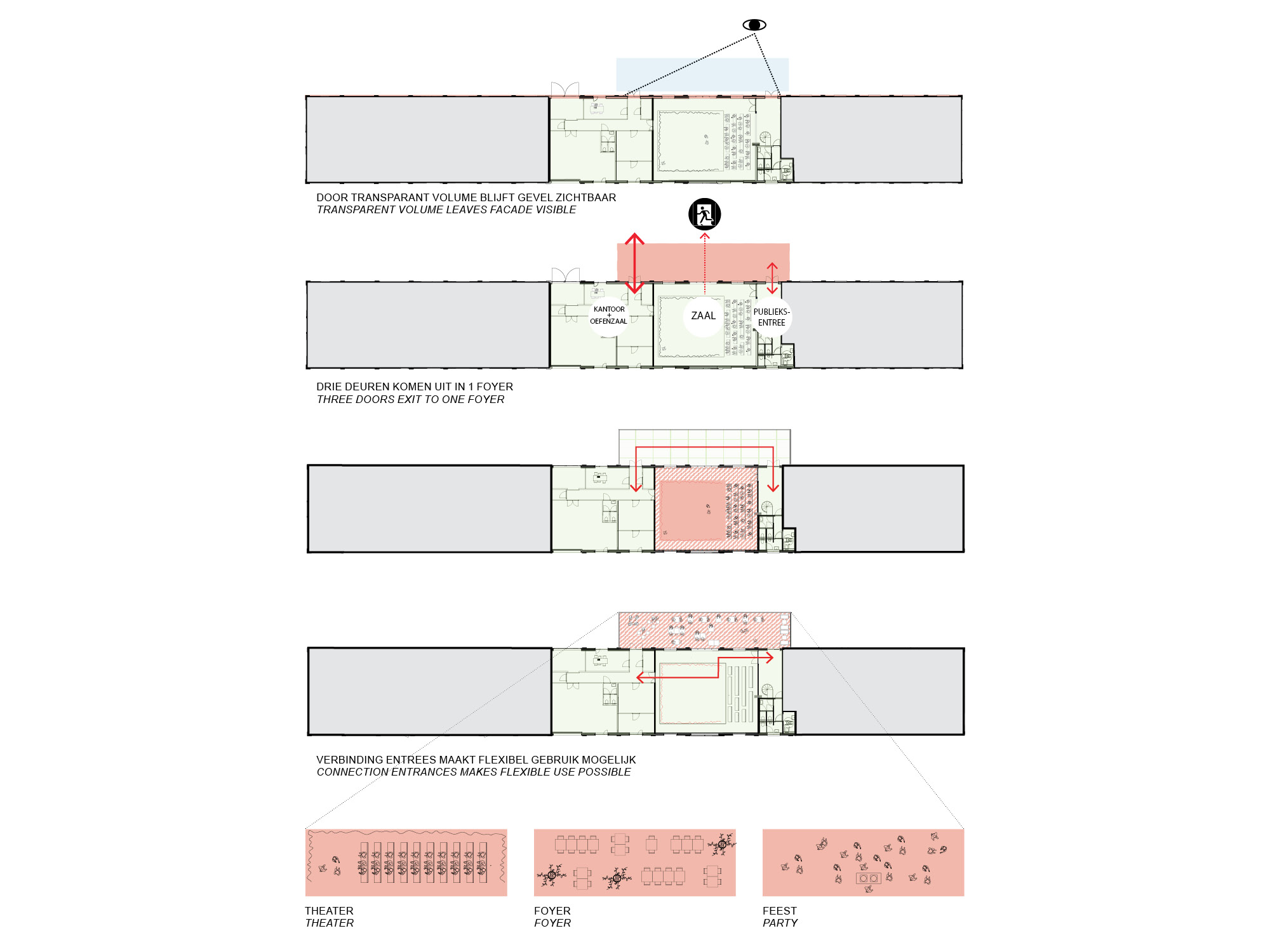The elongated foyer connects three existing entrance doors of the building. This allows the spaces to be used independently, greatly enhancing the programmatic possibilities.