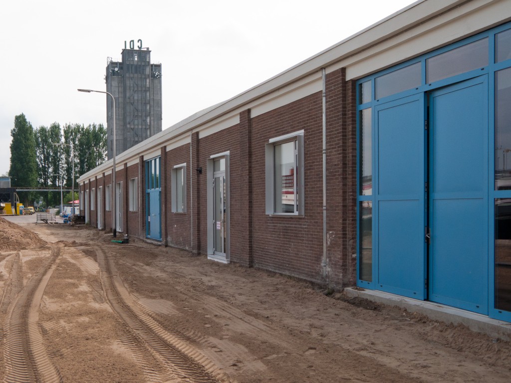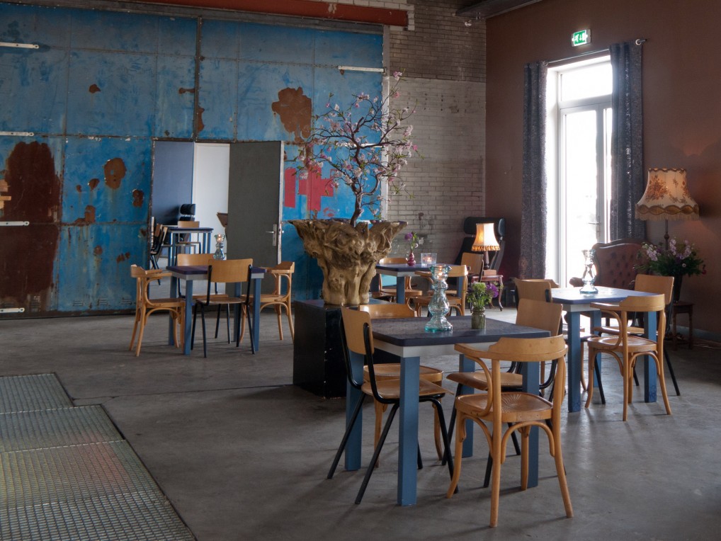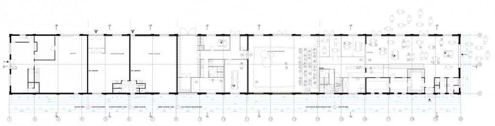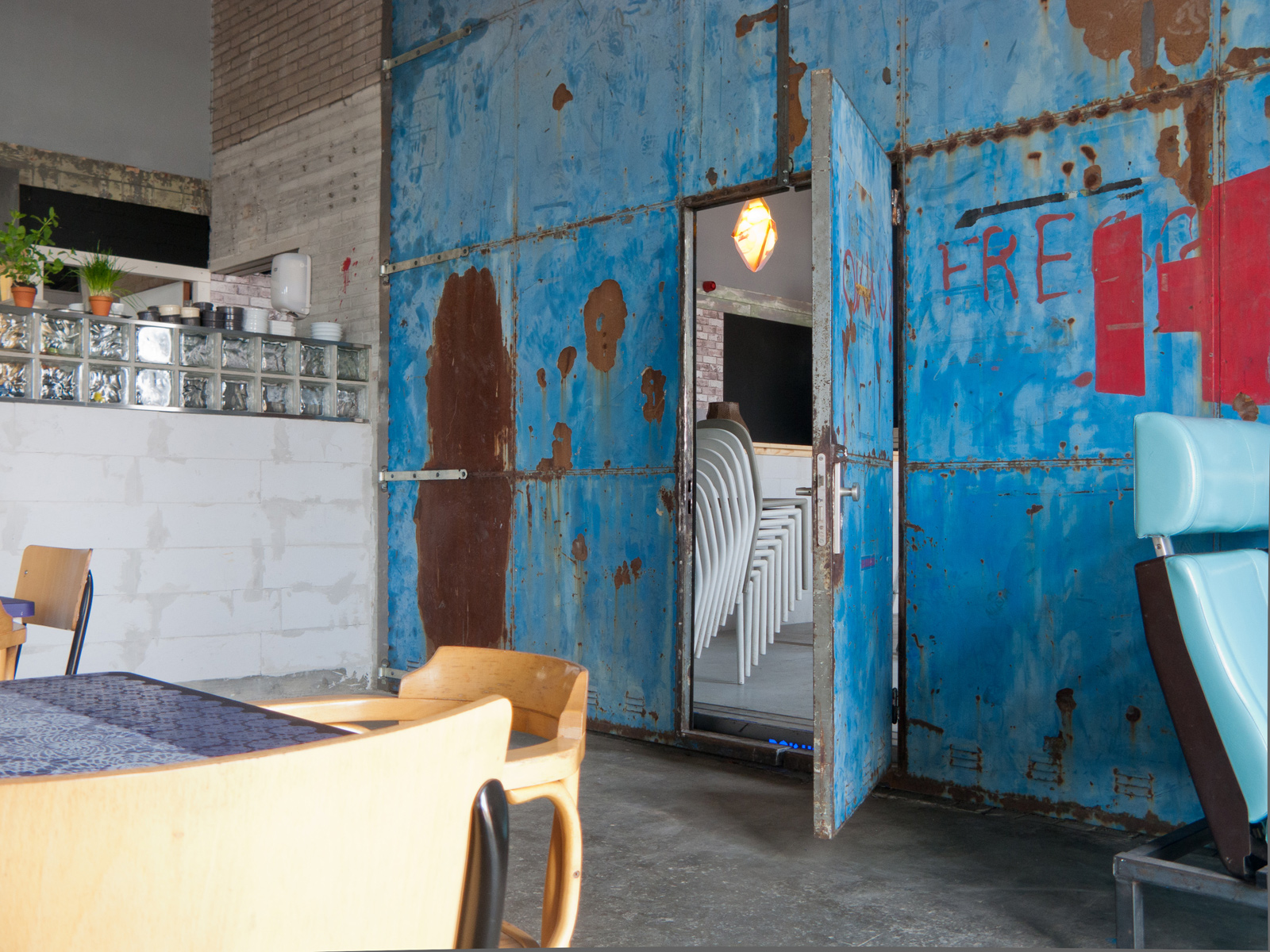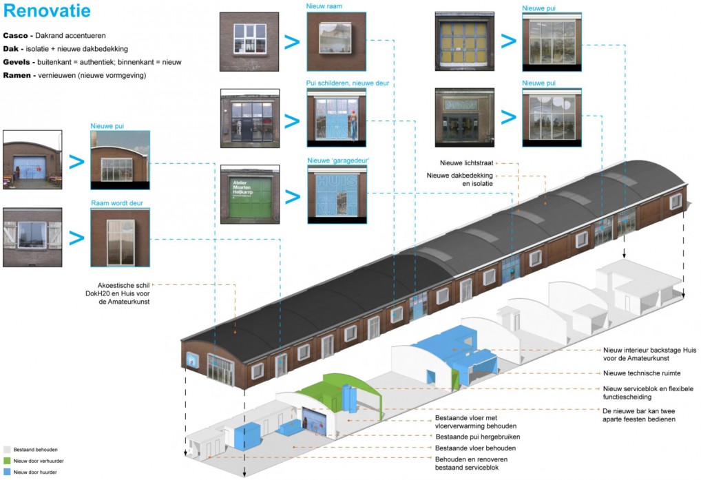 The combination of the image of the existing building and the new interventions result in the characteristic image of this building. The existing casco is flexible but a energetical and acoustical update is necessary. The image is kept, but there is some room for interventions in the facades matching the new use. The façade of this very long building gets an update and the roof is adapted to match the acoustical requirements of the theater-café . The monumental blue garagedoors moved to the interior of the foyer and make place for a large window defining the relation between inside and outside. The rithme in the façade openings is where necessary restored and strengthened by adding new openings. Also in the long facades the border between inside and outside fades away by adding large double doors.
