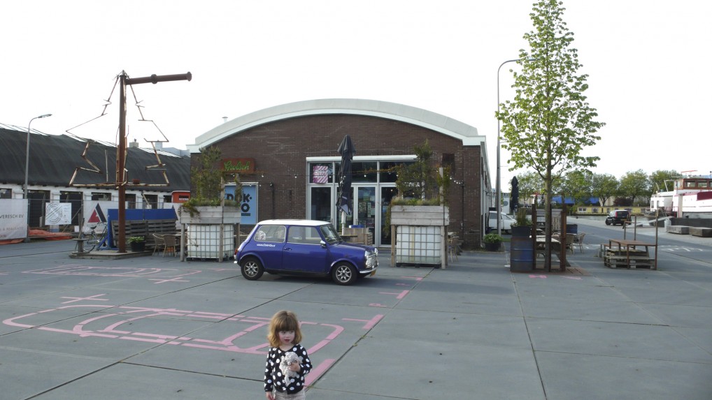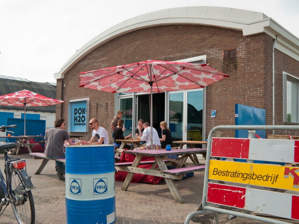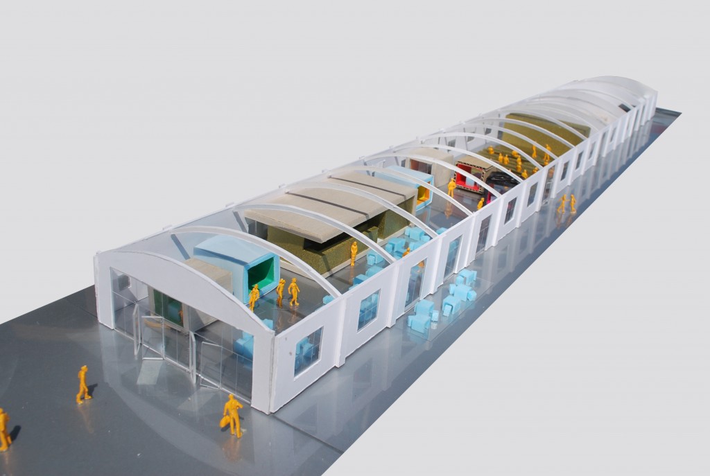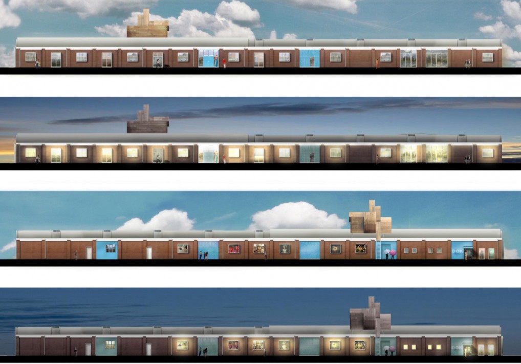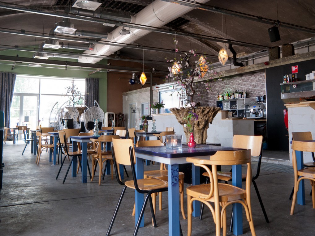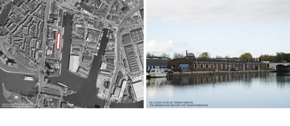 The combination of the image of the existing building and the new interventions result in the characteristic image of this building. The existing casco is flexible but a energetical and acoustical update is necessary. The image is kept, but there is some room for interventions in the facades matching the new use. The façade of this very long building gets an update and the roof is adapted to match the acoustical requirements of the theater-café . The monumental blue garagedoors moved to the interior of the foyer and make place for a large window defining the relation between inside and outside. The rithme in the façade openings is where necessary restored and strengthened by adding new openings. Also in the long facades the border between inside and outside fades away by adding large double doors.