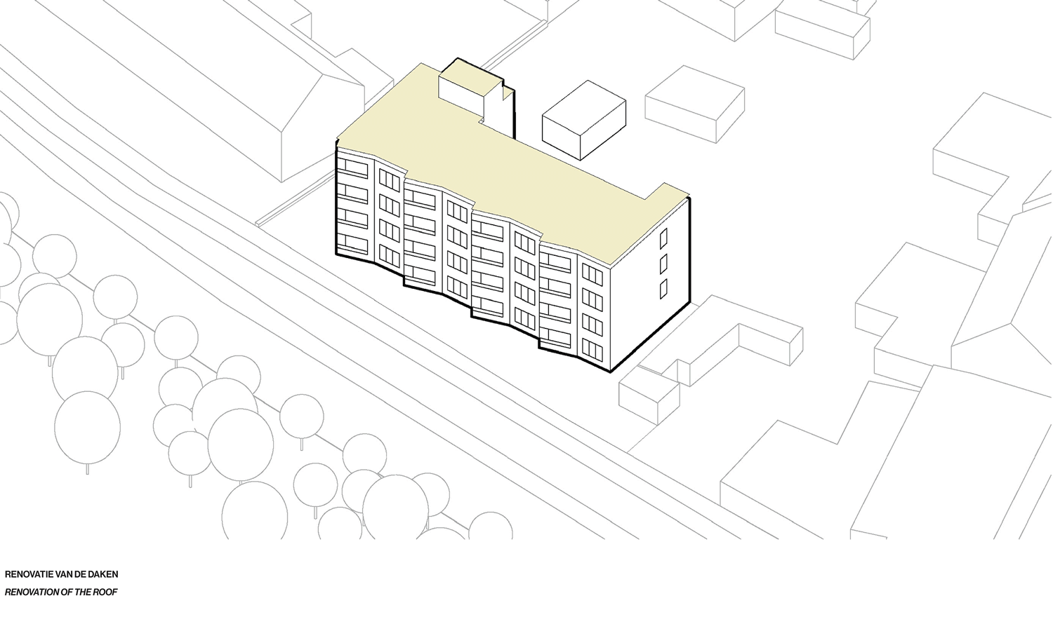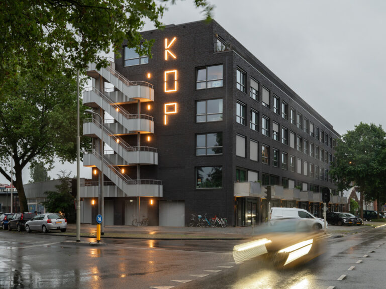 De Voorkempen intends to renovate a building with 17 apartments and develop a contemporary living environment that embodies the distinctive building’s street facade, while respecting the existing structure. Located between Antwerp and Schoten, the site includes a parking area behind the building, green spaces, and a pedestrian and bicycle path at the front.