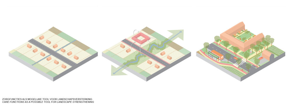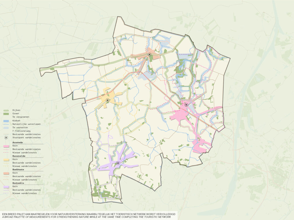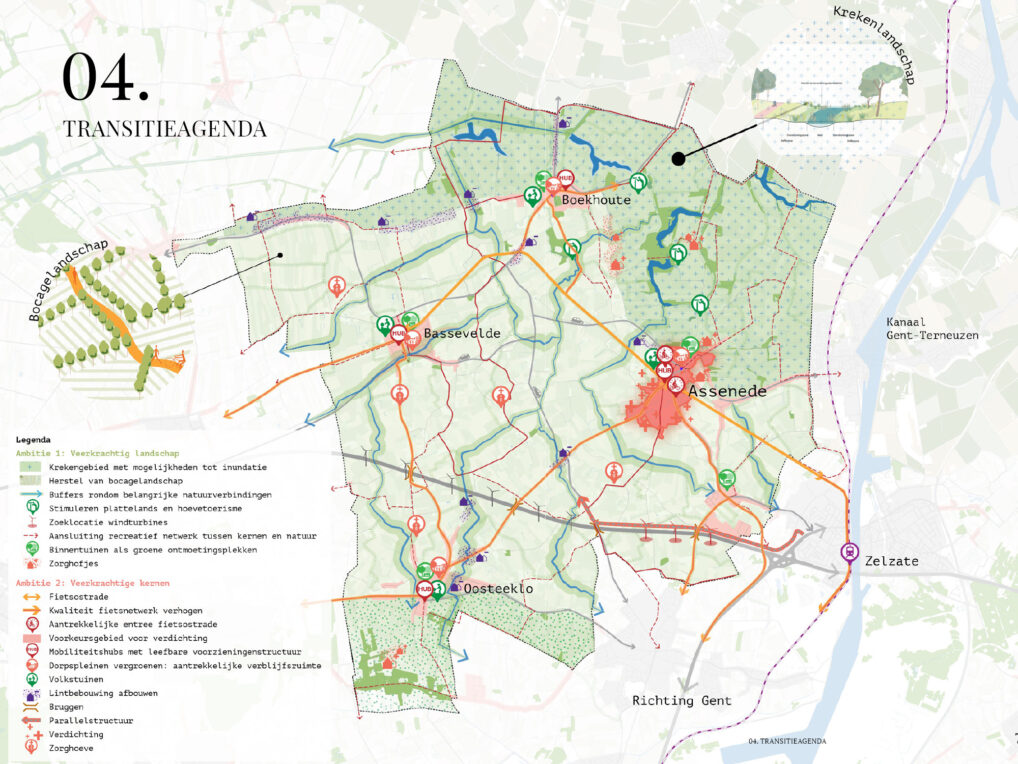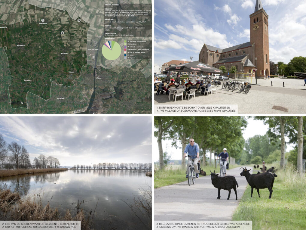 Assenede is situated North of Ghent on the Dutch border in the direction of Terneuzen. It is a rural municipality with a focus on agriculture and lies on the crossroads between three kinds of landscape, with wet creek land in the north, and dry sandy forests in the south. The scaling up of agriculture production has led to a rapid loss in scenic quality and biodiversity. At the same time the urban structure is scattered and suffering from aging and depopulation. How can we anticipate on this demographic shift and focus on built environment that profits from and at the same time contribute to the strengthening of existing landscape qualities?