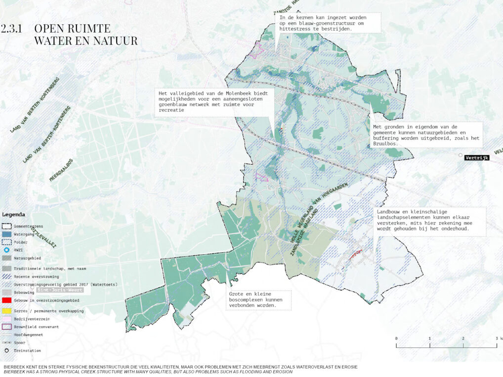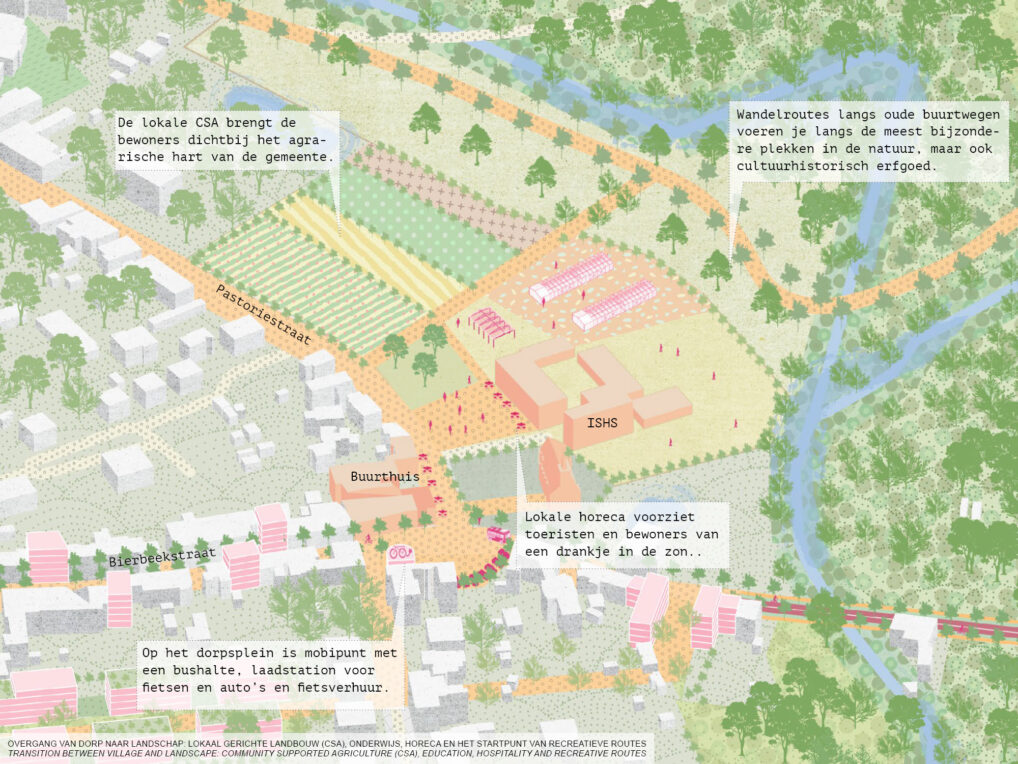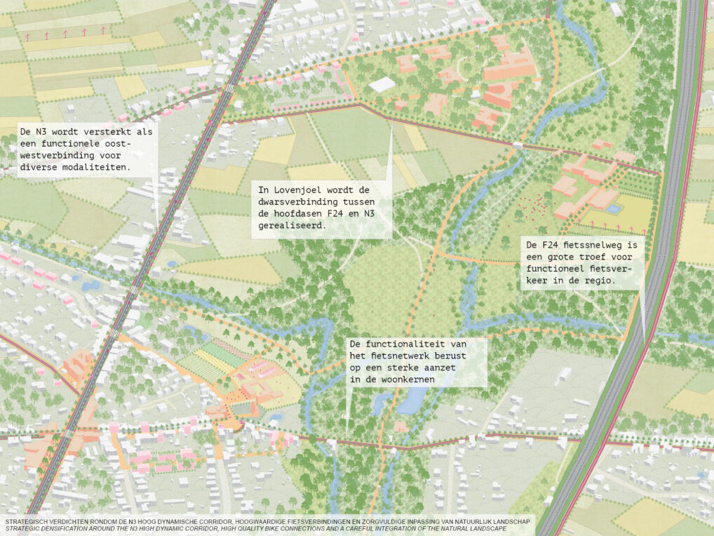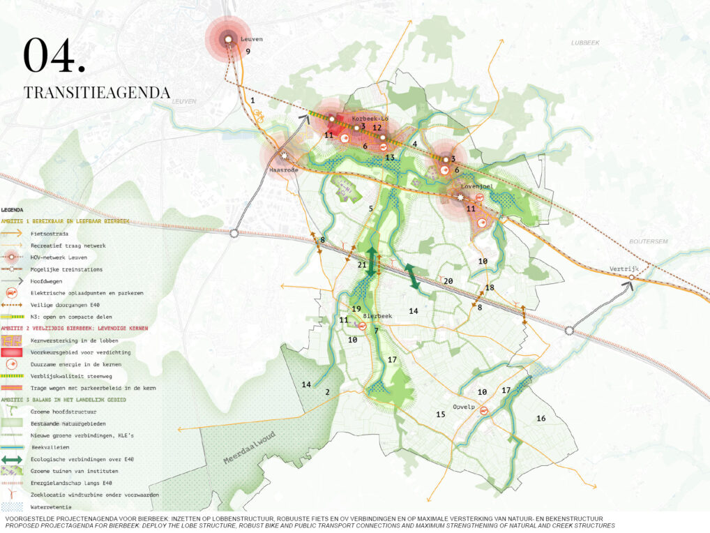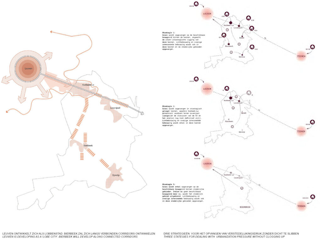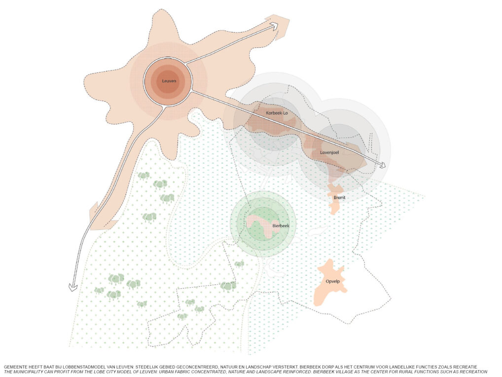 In the proposal the lobe structure is embraced and further development happens only along the high dynamic corridor towards Leuven. This allows the municipality to develop and maintain high living quality, but also profile itself as a rural and recreative municipality.