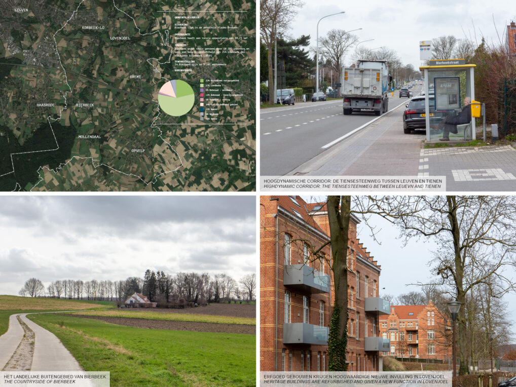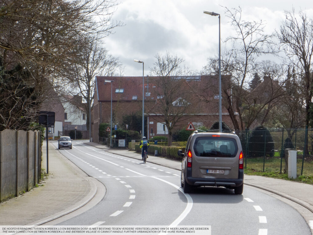 The municipality of Bierbeek is situated between Leuven and Tienen, which are connected by the Tiensesteenweg. Along this corridor lie the biggest cores of the municipality: Korbeek-Lo and Lovenjoel. As a fusion municipality however, development in Bierbeek is mostly spread over these two cores, but also Bierbeek as the main village. The expansion of Leuven rapidly increases urbanization pressure in the municipality, as well as the increased traffic that comes with it. The local infrastructure is not equipped to deal with this increase. The municipality is at a crossroad: either they embrace the ‘lobe structure’ as proposed by Leuven, halting development of Bierbeek village, or development keeps being spread out, posing the risk of losing qualities in terms of nature and livability.