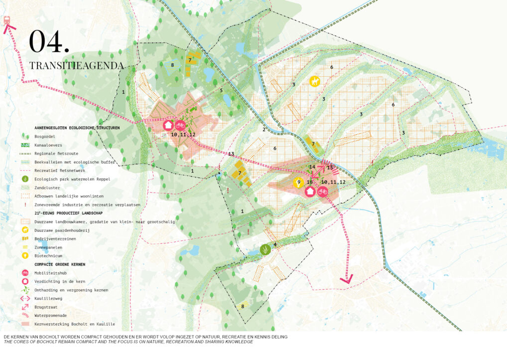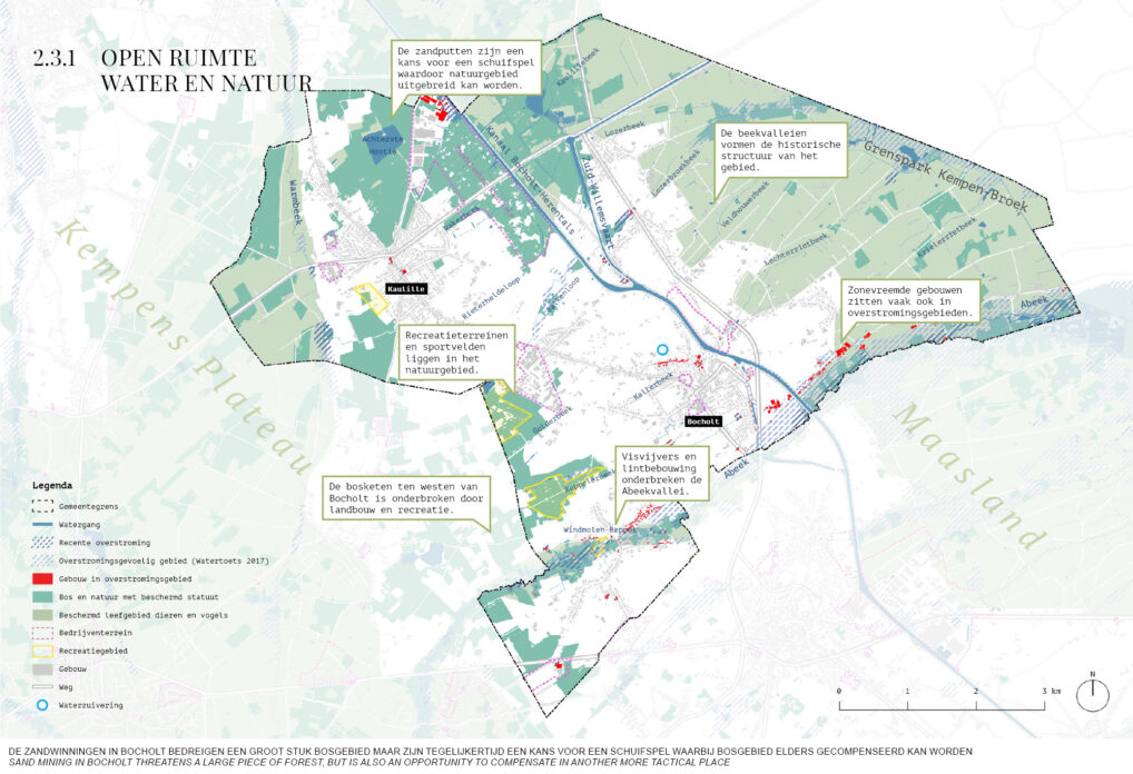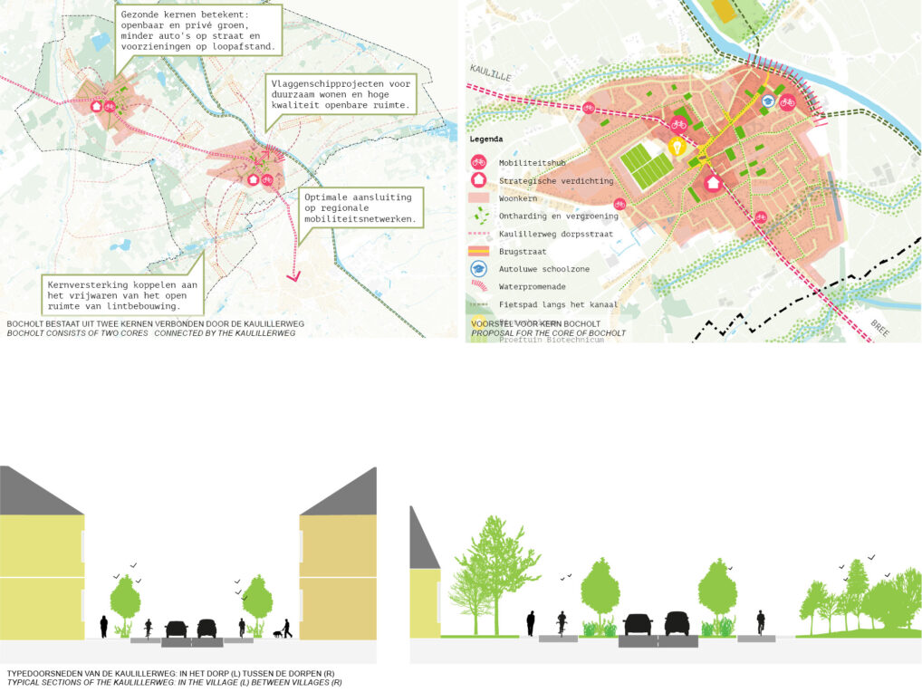Bocholt is blessed with a fantastic landscape, its many creeks make it a popular recreative destination. The lack of a clear spatial policy however, risks cluttering of this landscape and losing existing qualities. Another struggle are the two village residential cores, that compliment each other functionally, but are only connected by car infrastructure. The road currently is dangerous for cyclists, and both cores are excessively paved and offer little quality.