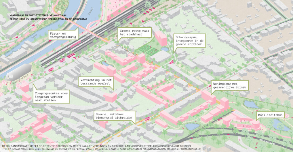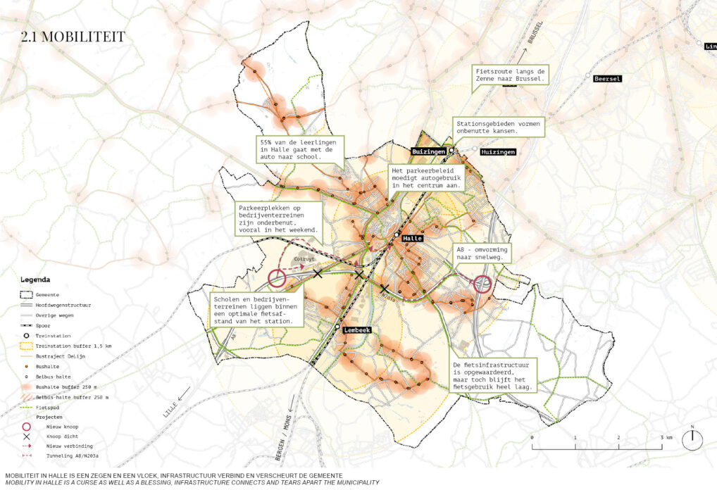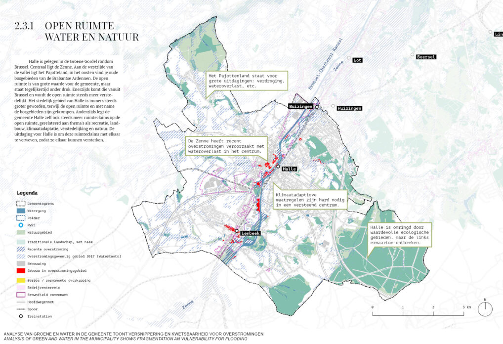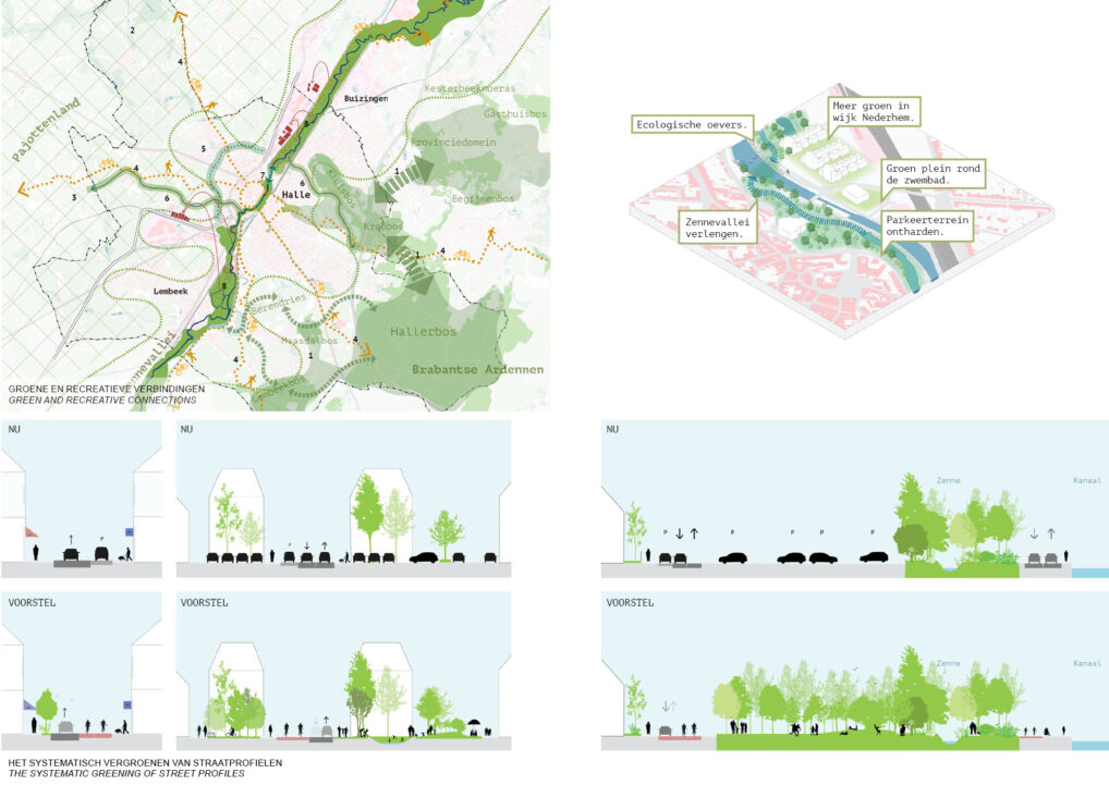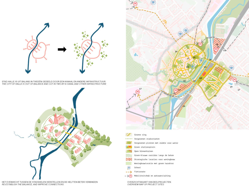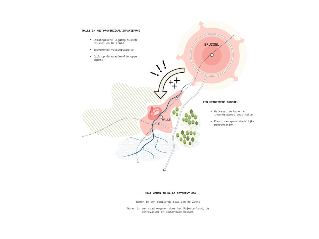 Halle is a Flemish municipality just south of Brussels that struggles with urbanization pressure from the capitol, where new projects threaten the continuity of open space. A bundle consisting of the canal, the Zenne river, railroads and regional car connections have cut the city in two. The two halves operate separately and out of balance.