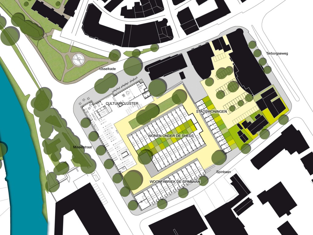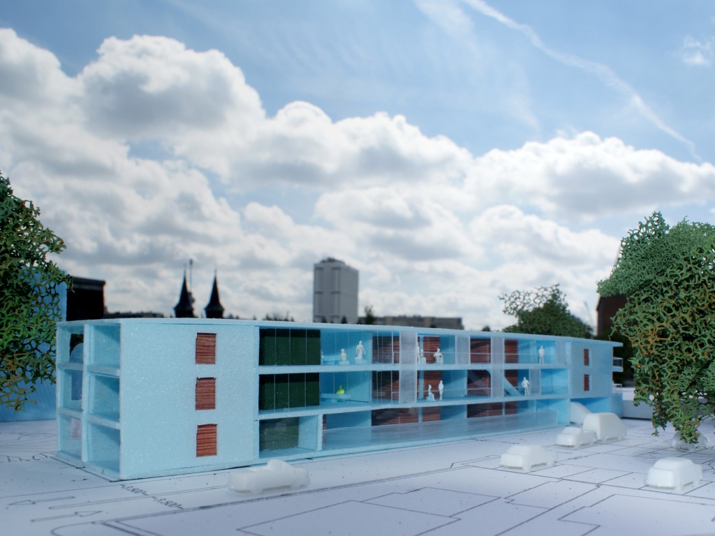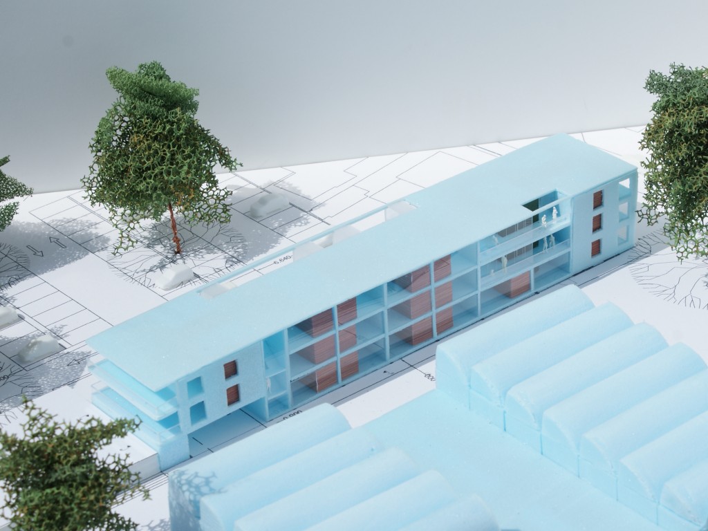 This project for 24 care houses is a part of the urban masterplan for the Brewinc location in the center of Doetinchem. Together with the new library in the old school, the shed houses and the new housing factory, these houses will define the living ensemble around the courtyard in the heart of the city. The straightforward building defines the edge of the plan and orients itself on the informal collective space of the courtyard around the shed houses.