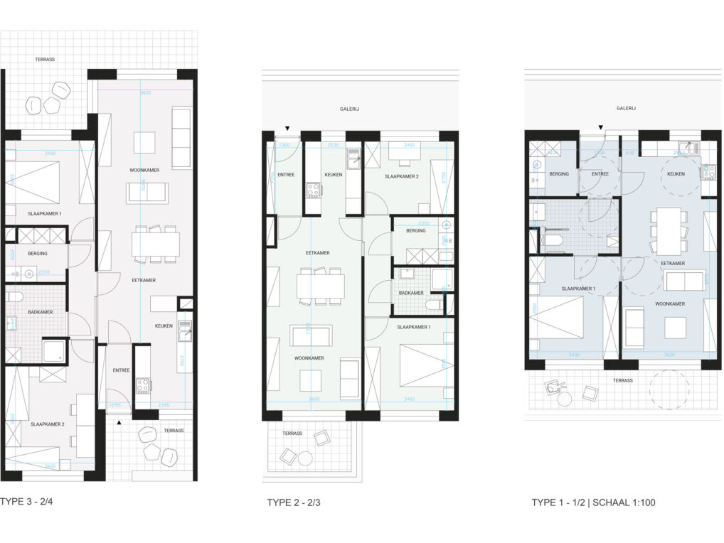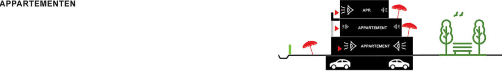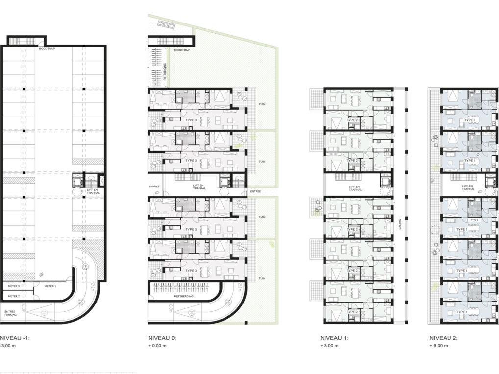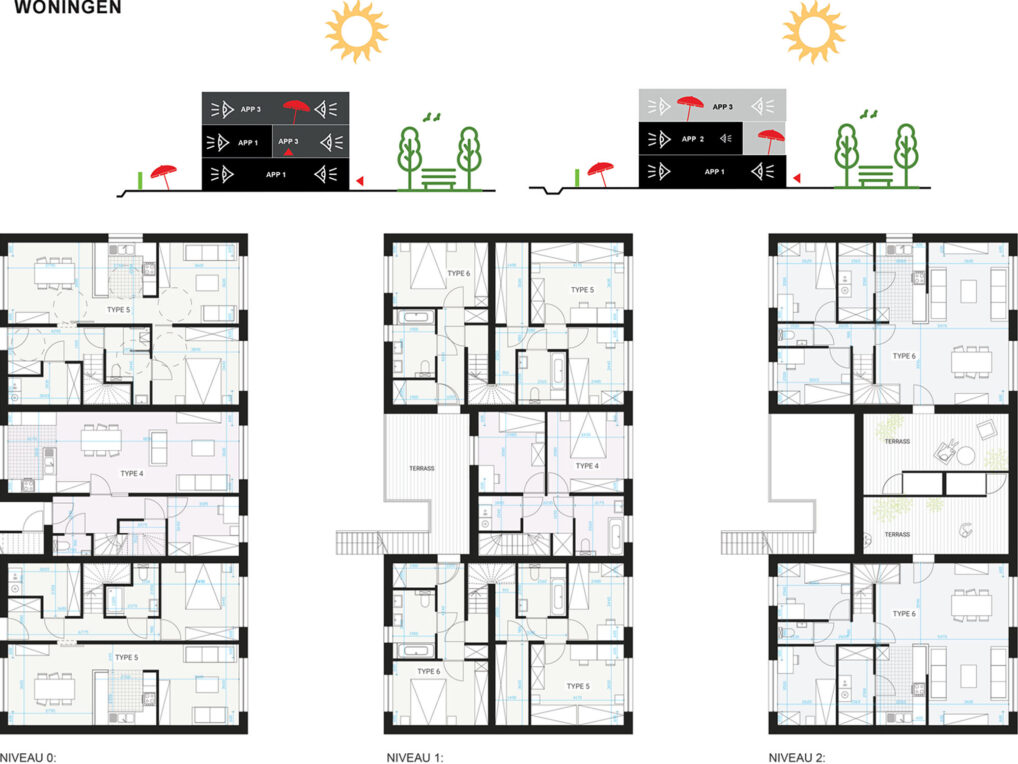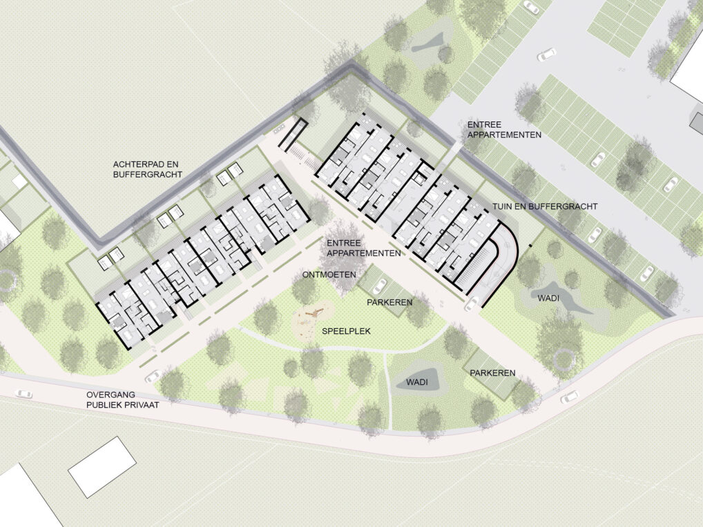 The different typologies are mixed up, and so are the new residents. This leads to a mixture between different people. Young people will find a home here as well as elderly, at the same time there is room for family housing. By pushing the, new build, buildings to the north edge as much as possible, the quality of the street as a walking and cycling path is optimized. In the created environment collective parking is provided, this means there is room for a sidewalk and a terrace in front of every door with a wide view over the fields.