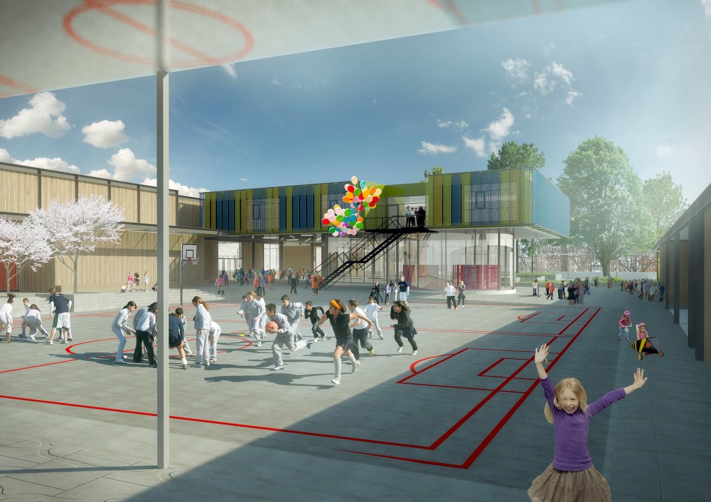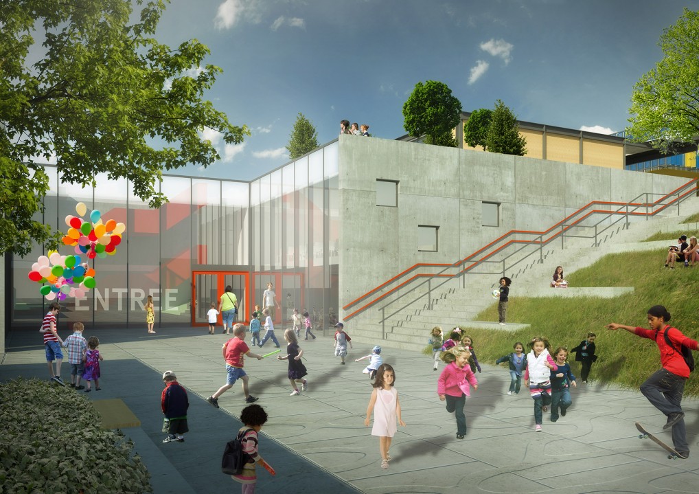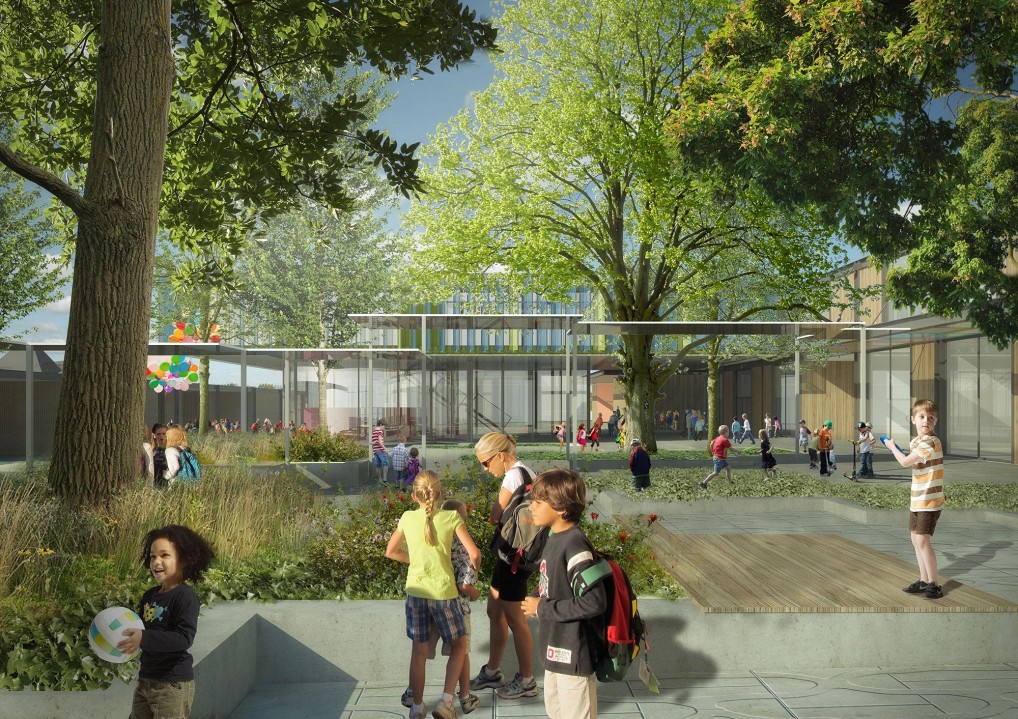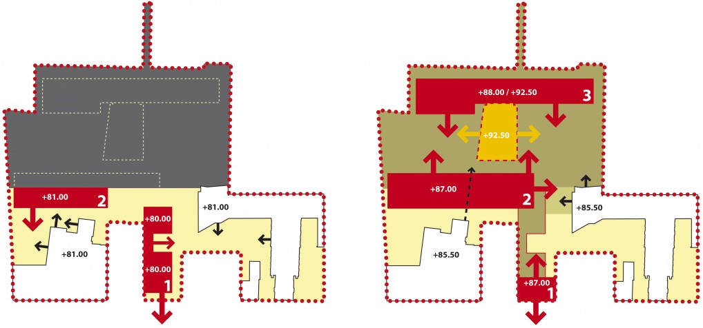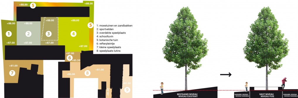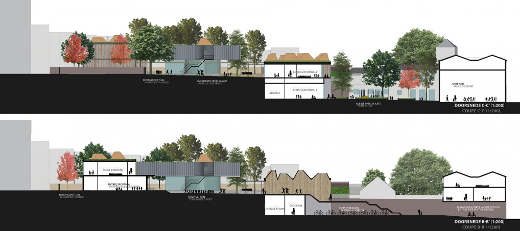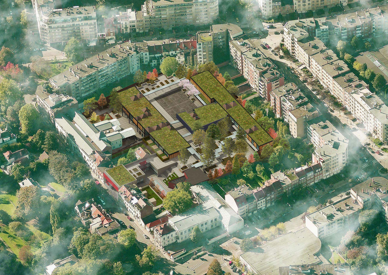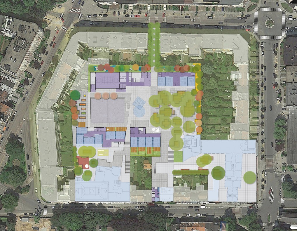 The redevelopment of schools 7 and 8 in Elsene is a complex question Because of different reasons. A big part of the complexity can be found in the step-by-step transformation. The end result should be perfectly matching the demands, but also each intermediate stage should represent a finished “product”. Next to that, the school will stay in use during the whole transformation process. Our proposal formulates an answer to these demands and starts from the existing qualities of the existing collection of buildings and outside spaces. The step-by-step approach strengthens the existing qualities and improves and integrates potential areas or zones of the site. The large central outside space will be confirmed as the central space of the school. The way buildings and outside spaces deal with the height differences on the site will be improved significantly. The relation between the low part (street) and the high part (central space) will be completely redesigned, new links will be realized inside the buildings and in the outside spaces and playgrounds. This means a reorganization of the entrances of the schools, demolishing and rebuilding certain buildings and a redesign of the playgrounds and outside spaces.
