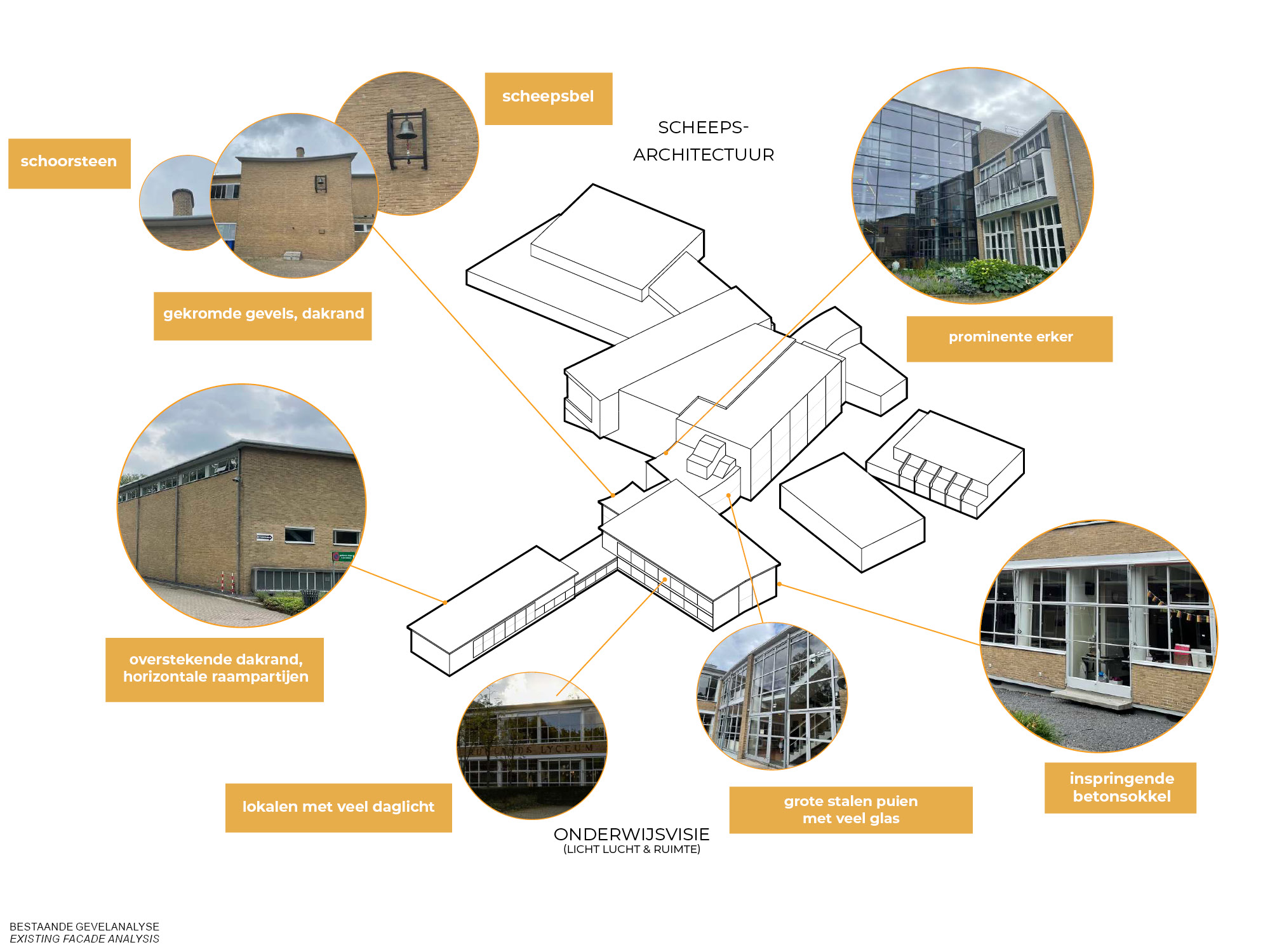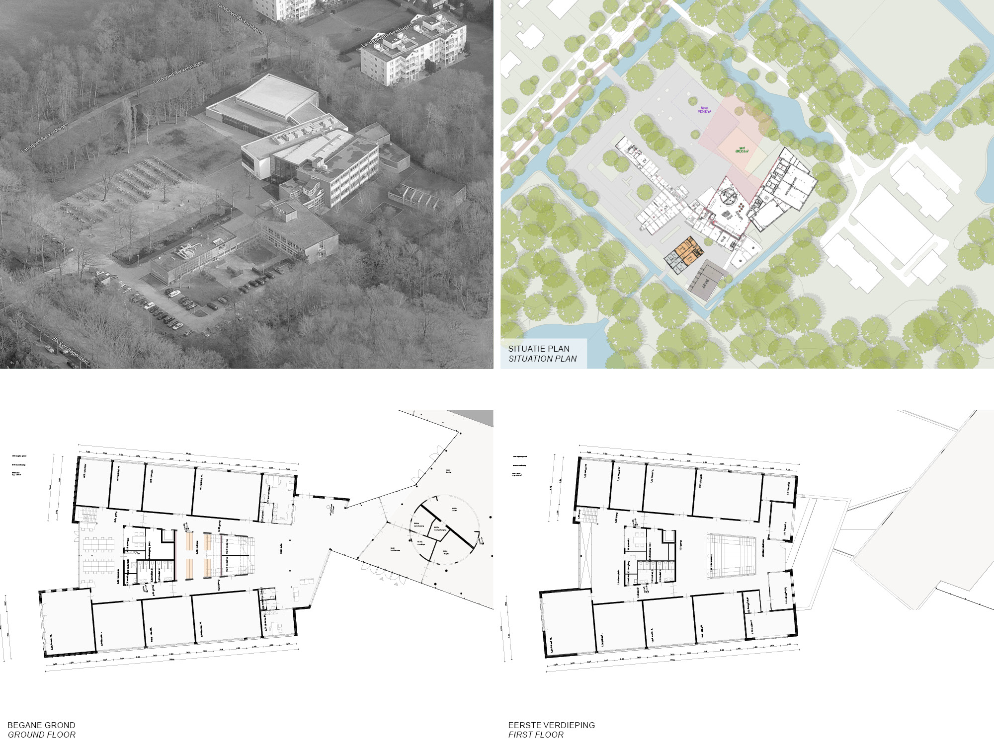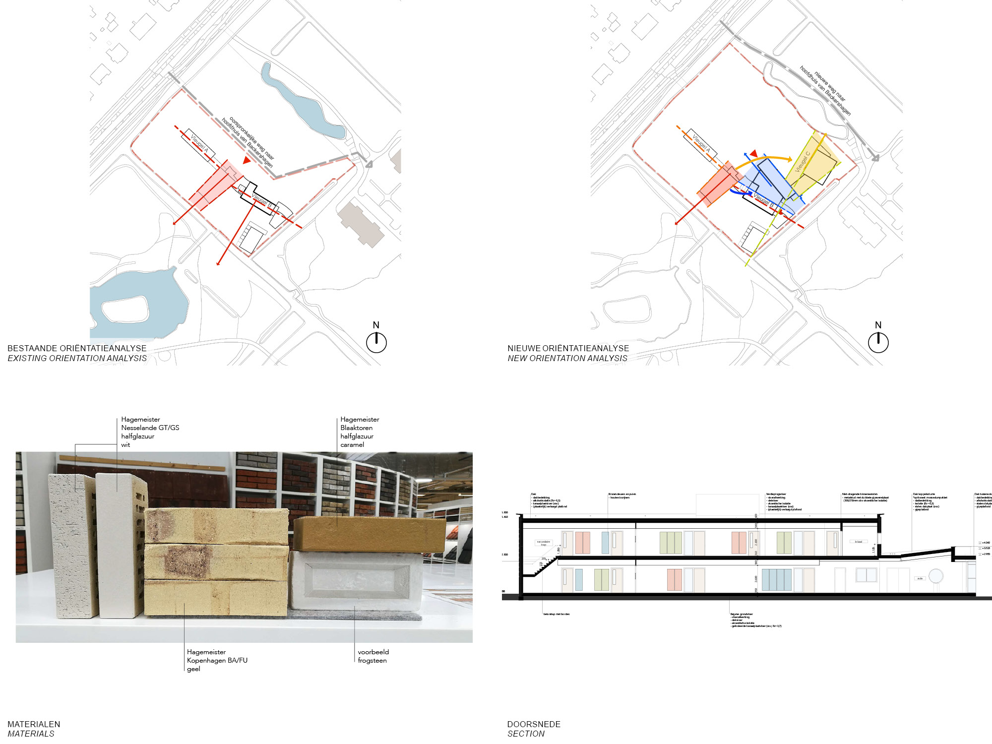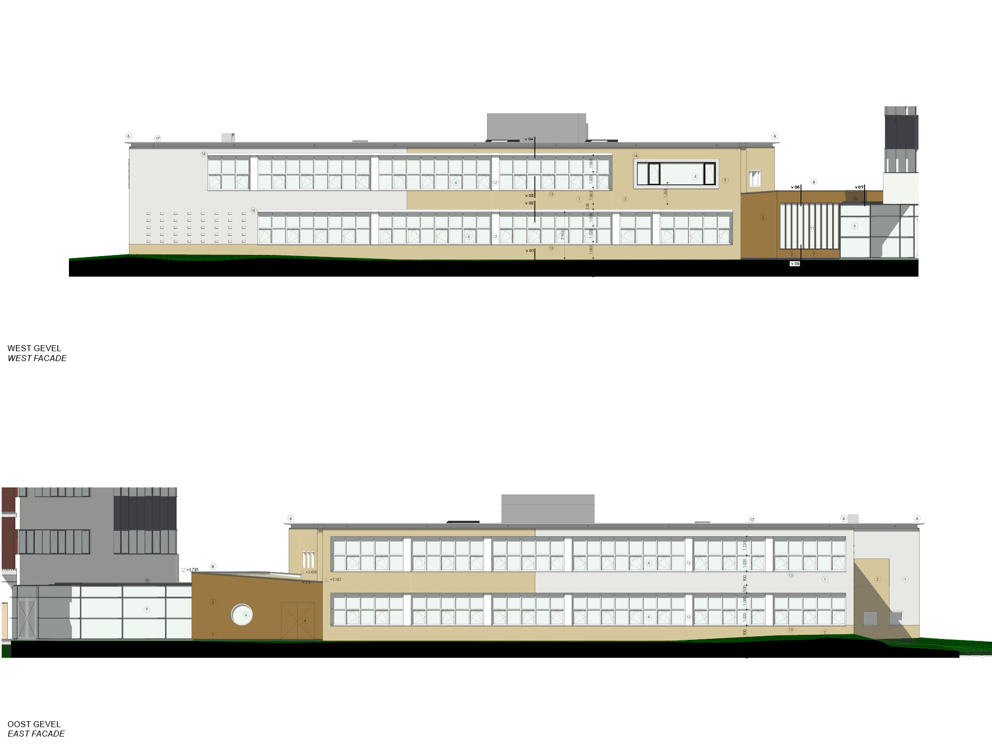 A careful analysis of the national monument and its surroundings has identified a number of key brands that have served as usable ingredients for the new building. Think of volumetric configurations, proportions in the facades, architectural interventions and elements. The new building seeks a relationship with the monument in terms of material and composition, and uses similar elements such as the raised roof edge, the generous band windows and a raised plinth. The new wing with a small separate volume will be merged with the school: a recurring theme in the monument. Its position opposite the historic A wing balances both volumes with each other, balancing the approach to the main entrance and allowing more to follow. In this way, the new building adds a new time layer to the school, a daily translation of the original principles.