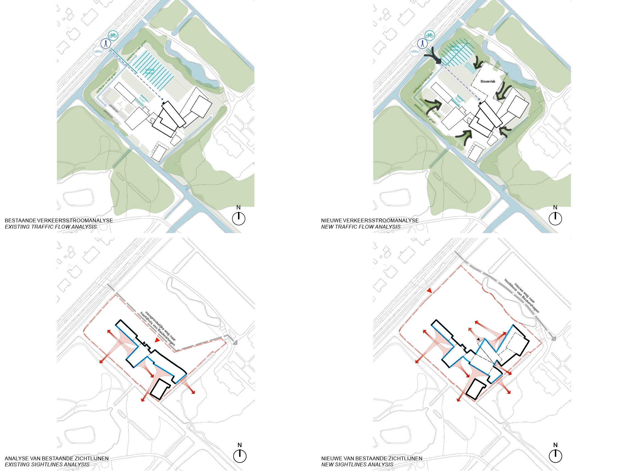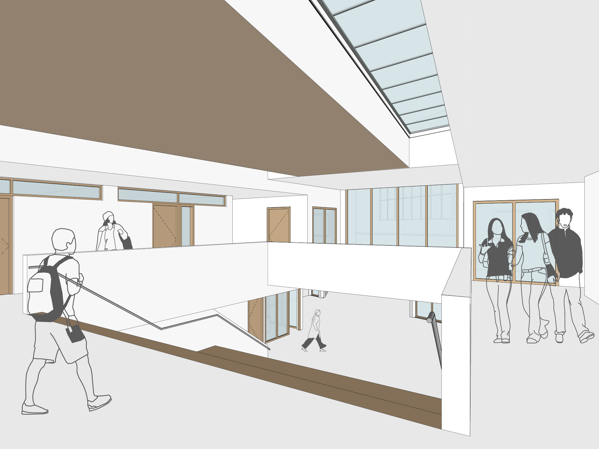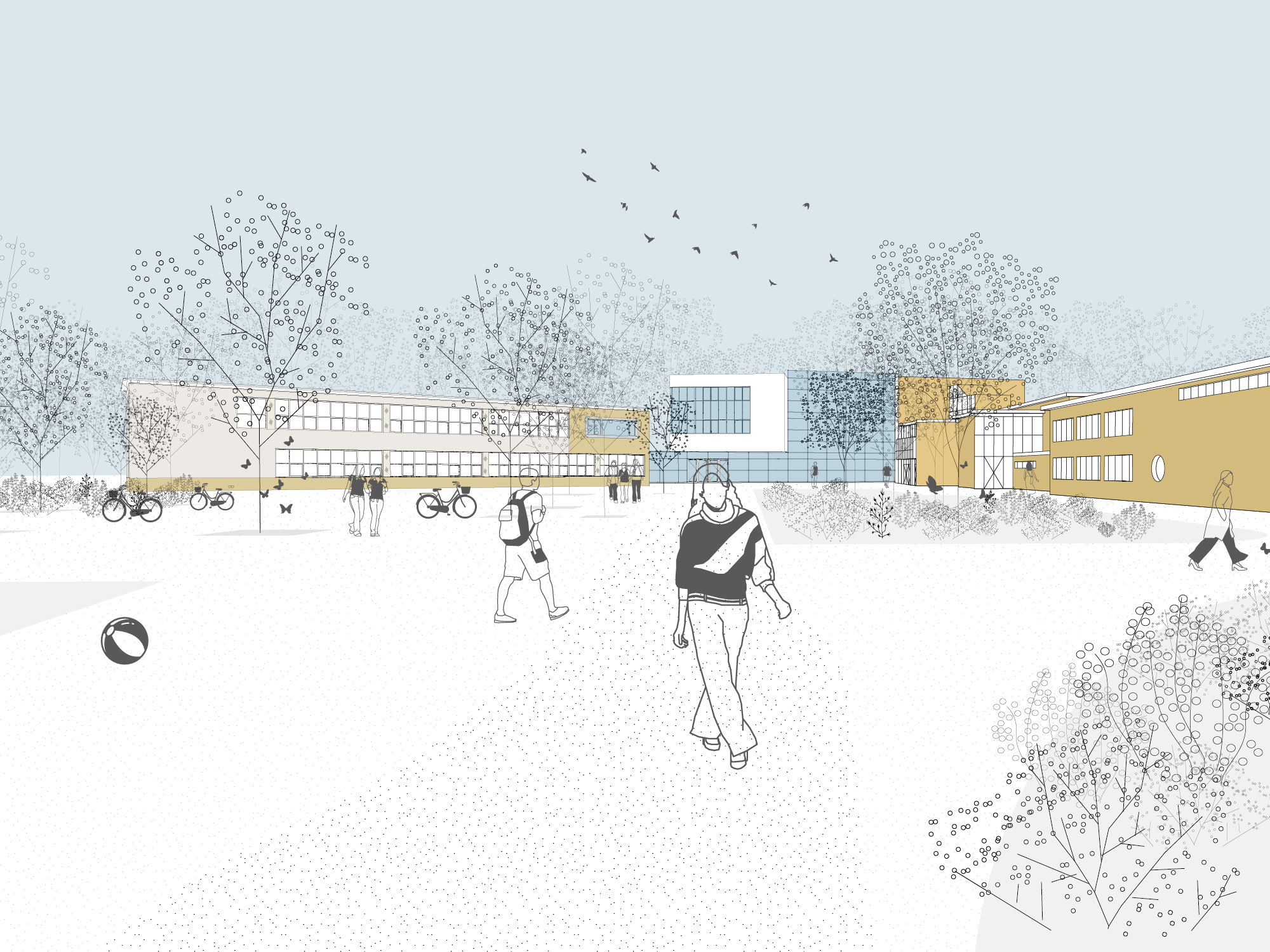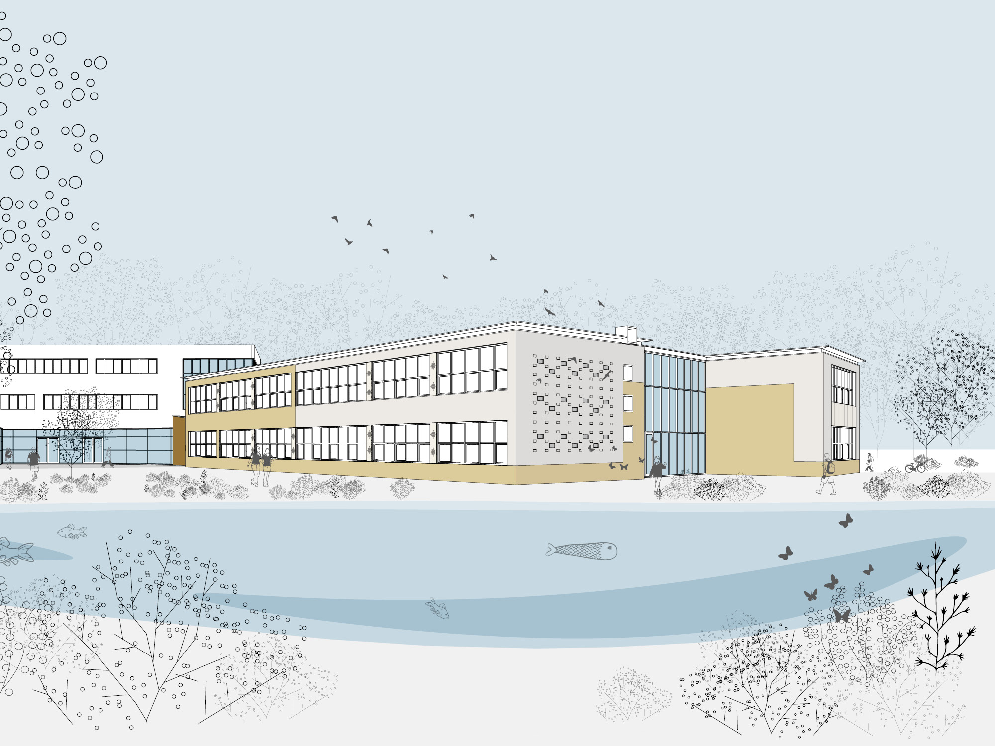 A careful analysis of the national monument and its surroundings has identified a number of key brands that have served as usable ingredients for the new building. Think of volumetric configurations, proportions in the facades, architectural interventions and elements. The new building seeks a relationship with the monument in terms of material and composition, and uses similar elements such as the raised roof edge, the generous band windows and a raised plinth. The new wing with a small separate volume will be merged with the school: a recurring theme in the monument. Its position opposite the historic A wing balances both volumes with each other, balancing the approach to the main entrance and allowing more to follow. In this way, the new building adds a new time layer to the school, a daily translation of the original principles.