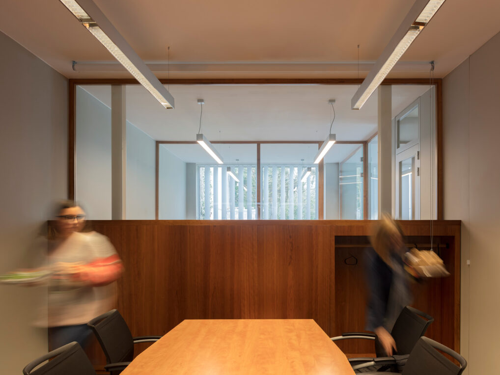 The extension is made of steel and transparent glass, just like the previous extension. The new part perfectly matches the existing situation. This new part contains an extra meeting room and two offices. These rooms are separated physically but not visually. The key element in this project (both in the first extension and in the second) is the furniture in cherry wood. The custom-made elements ensure sufficient storage space and separation of the spaces. The furniture acts as one big machine that divides the space.