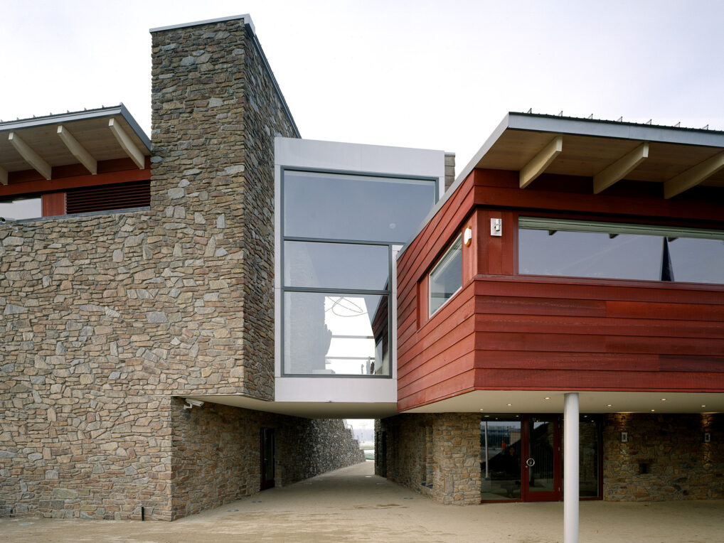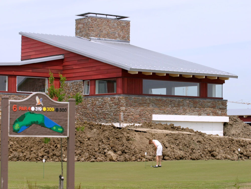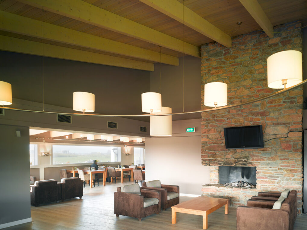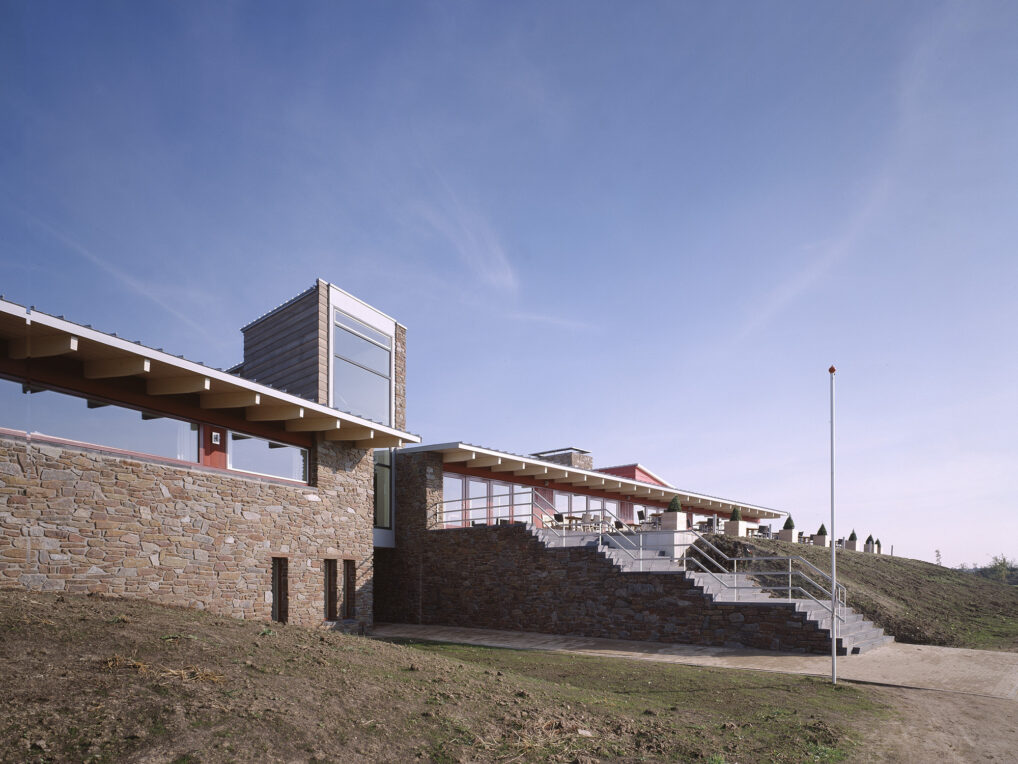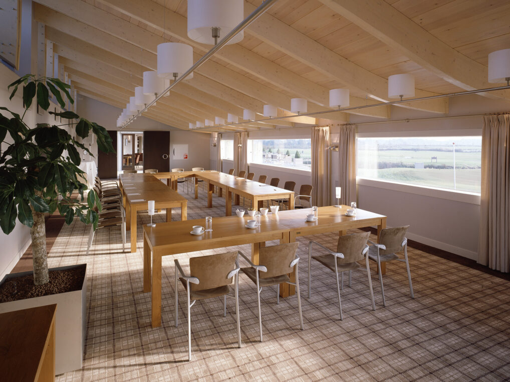 Robust materials have also been used in the interior. Natural stone has been used in some places in the walls and the green roof construction is also visible from the inside. The changing rooms and the golf shop are situated on either side of an underpass to the golf course. The floor above houses the restaurant and meeting rooms. Large panoramic windows offer a wide view of the golf course and frame the landscape as it were. The sunny terrace is adjacent to the next of an afternoon golf: the last hole.