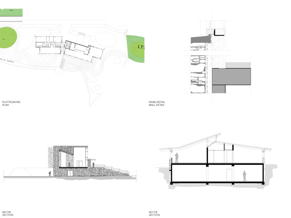 The design of the golf club is based on an early medieval fortress with a wooden structure that is enclosed by an earthen wall. Due to the clustering of the facilities, the golf club is a recognizable unit that is closed off from the environment by the earthen wall. Where the earthen wall is interrupted, there is a view of the disappearing landscape. The buildings are also recognizable as a unit in form and materialization. Robust materials give the buildings the rustic atmosphere of the past. Large chunks of natural stone from the Ardennes cover the concrete basement. Wide wooden beams and roof boarding form the roof construction. Red planks are attached to the facades and the buildings look like bins from a distance.