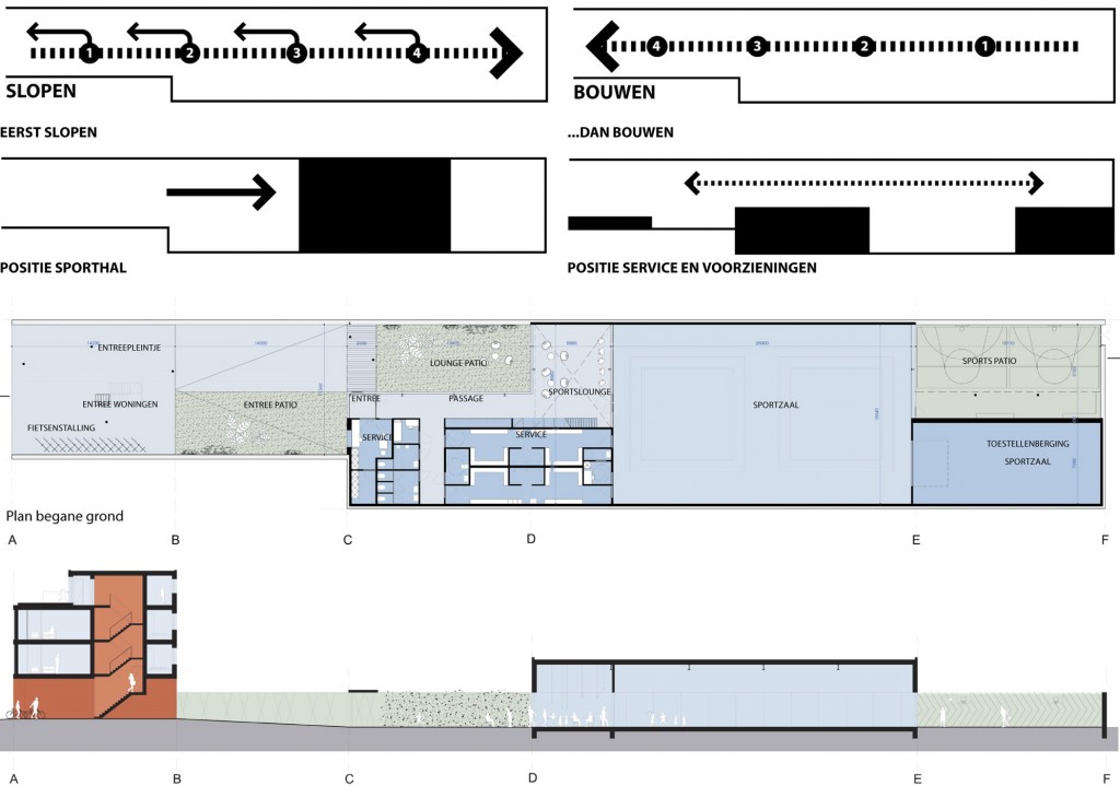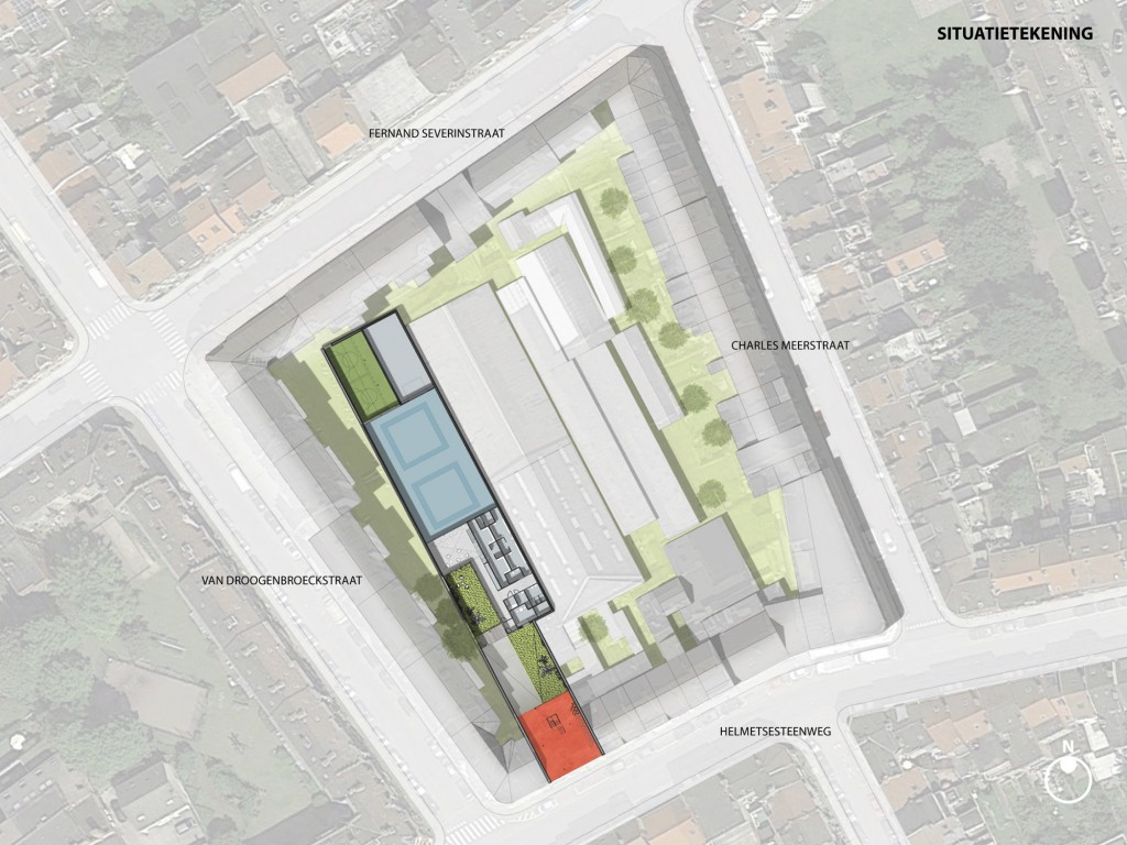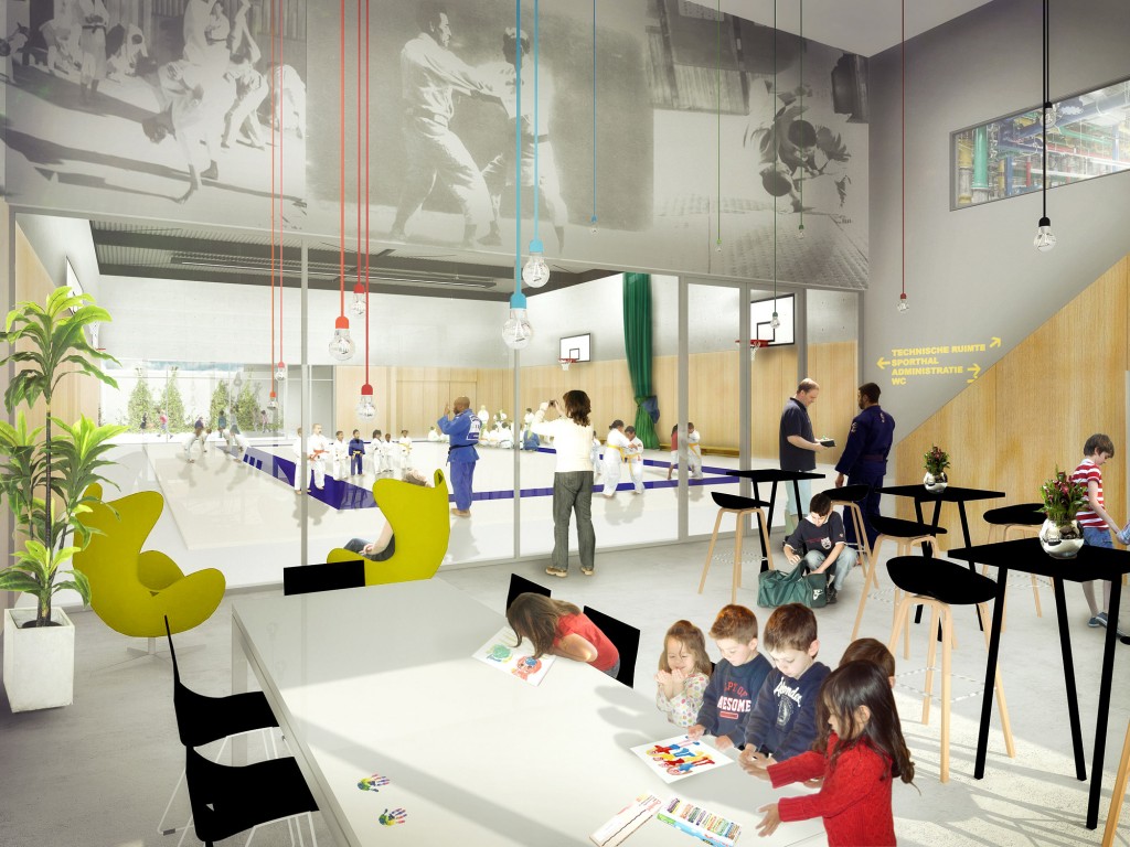 Helmet Sport is a sports hall with changing rooms, storage, etc., and a sports lounge that also acts as a neighborhood meeting venue. The new sports hall will be used by residents and associations of the neighborhood and in particular by the local judo club. At the Helmets street, above the entrance of this complex, 5 modern apartments are realized. The ground floor at the street side is left empty, so the courtyard and the façade of the sports hall are visible from the street and become an extension of the public space.