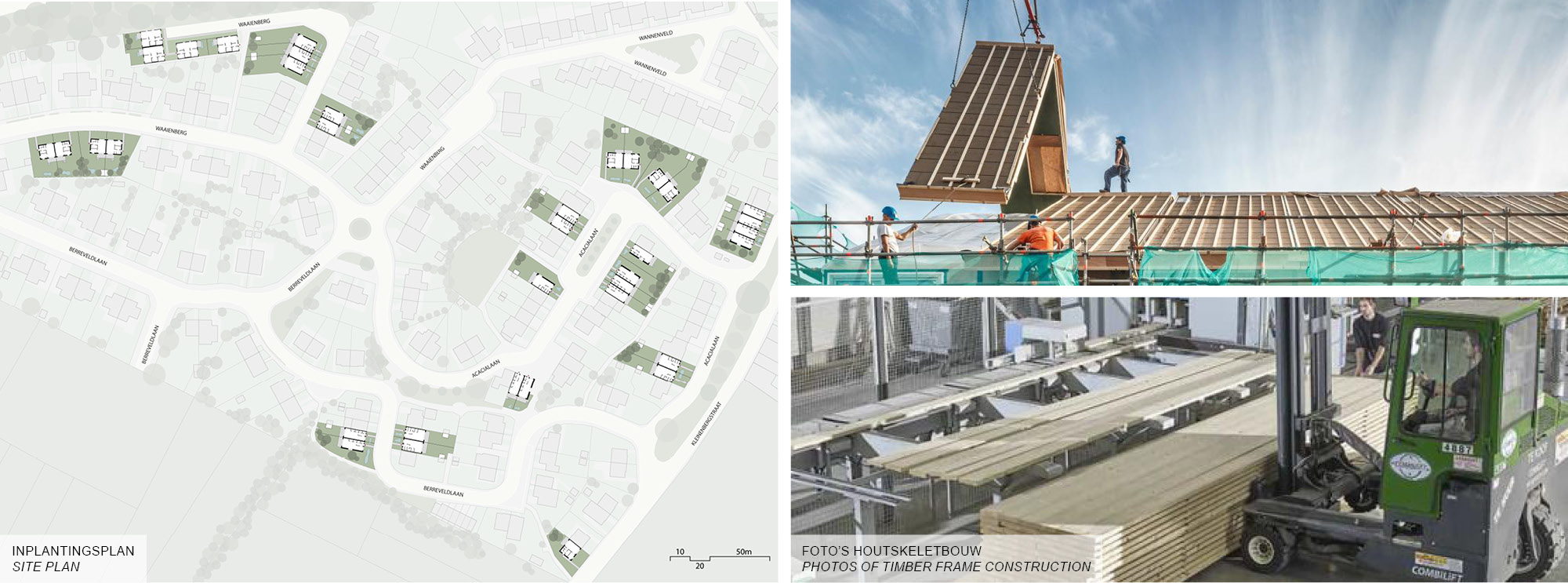 The design by Woonwerk Architecten perfectly meets these conditions. For the construction of the new homes, timber frame construction was chosen, an off-site building method where the building elements (facades, walls, floors, and roofs) are prefabricated in an industrial manner. The installation of the wind- and waterproof structure on the construction site takes only 1 to 2 days per house. Timber frame construction is a ‘dry construction method,’ where no water or cement is used, thus avoiding delays due to rain or frost.