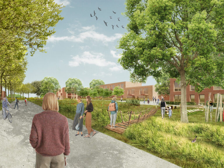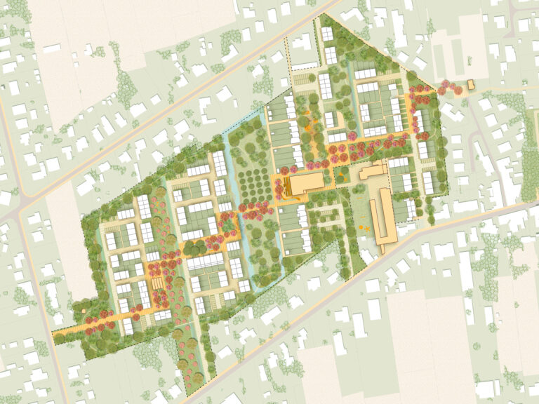 The current neighborhood consists of one type of house that is due for serious renovation. The houses have a large footprint and each has its own garage and driveway. Demolish and rebuild enables an integral transformation of the neighborhood. The new houses will be more compact and will consist of a variety of typologies. The access for cars is simplified requiring a minimum of hard surface. This creates space for green and water, varied and qualitative public space en meeting-spots for the residents. The masterplan forms a connection between existing green structures in the area and weaves the existing slow connections into a qualitative network.