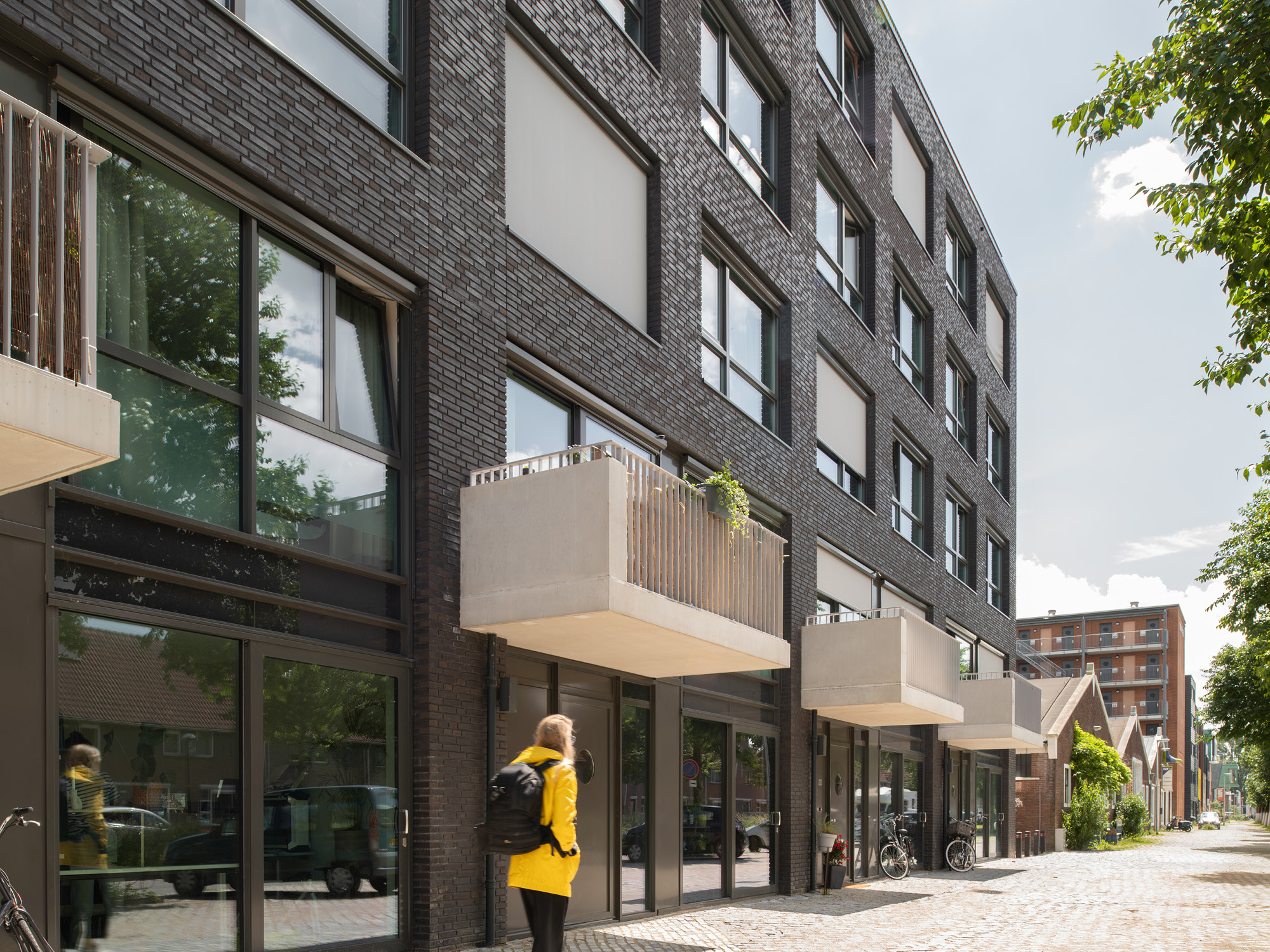 The Koopman, a historical building on the site that will be preserved and will house collective functions such as laundry and a shared roof terrace. The external circulation giving the building its expressive look while offering residents a place to relax and meet each other. An intelligent, straight forward brick volume that minimizes costs while offering a multitude of housing types.