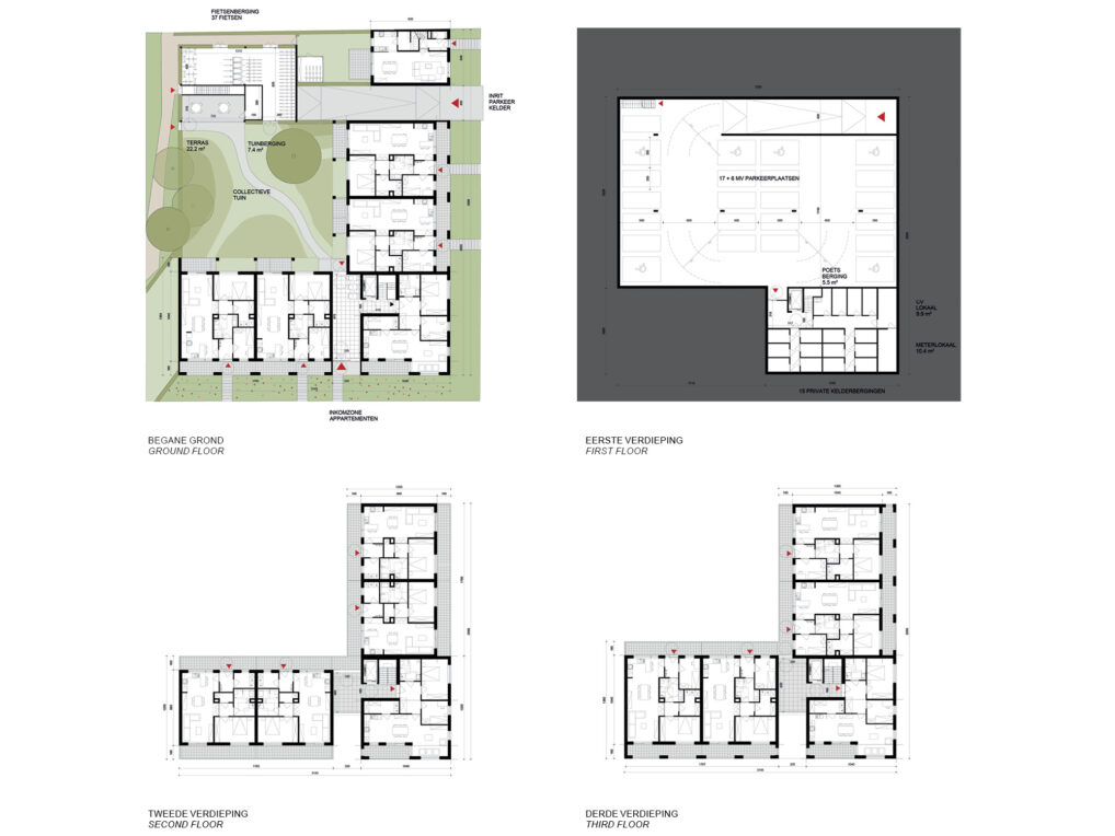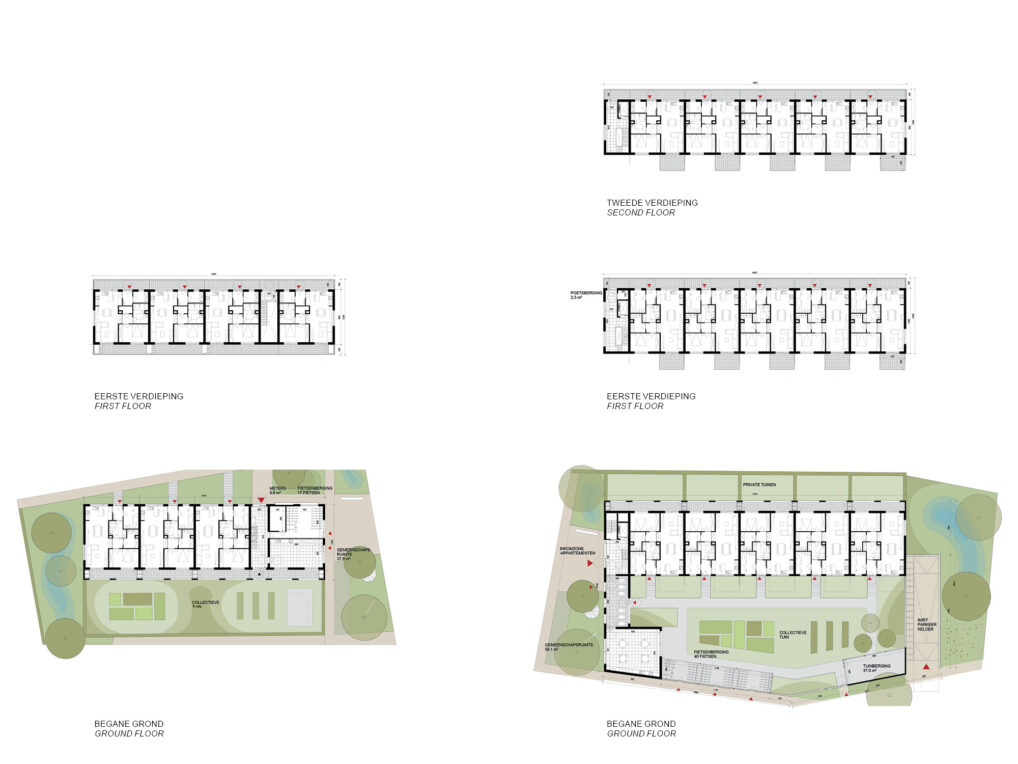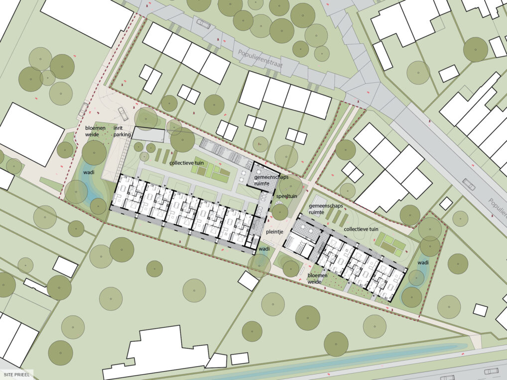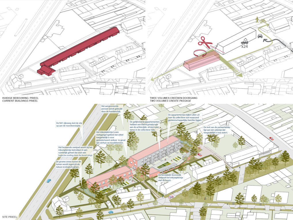 The site ‘Prieel’ is positioned in a strange way. The plot neighbors mostly backsides of gardens and the highway, but at the same time connects to different small routes that can be given a clear definition. The two smaller volumes with collective gardens create a sheltered pleasant living environment.