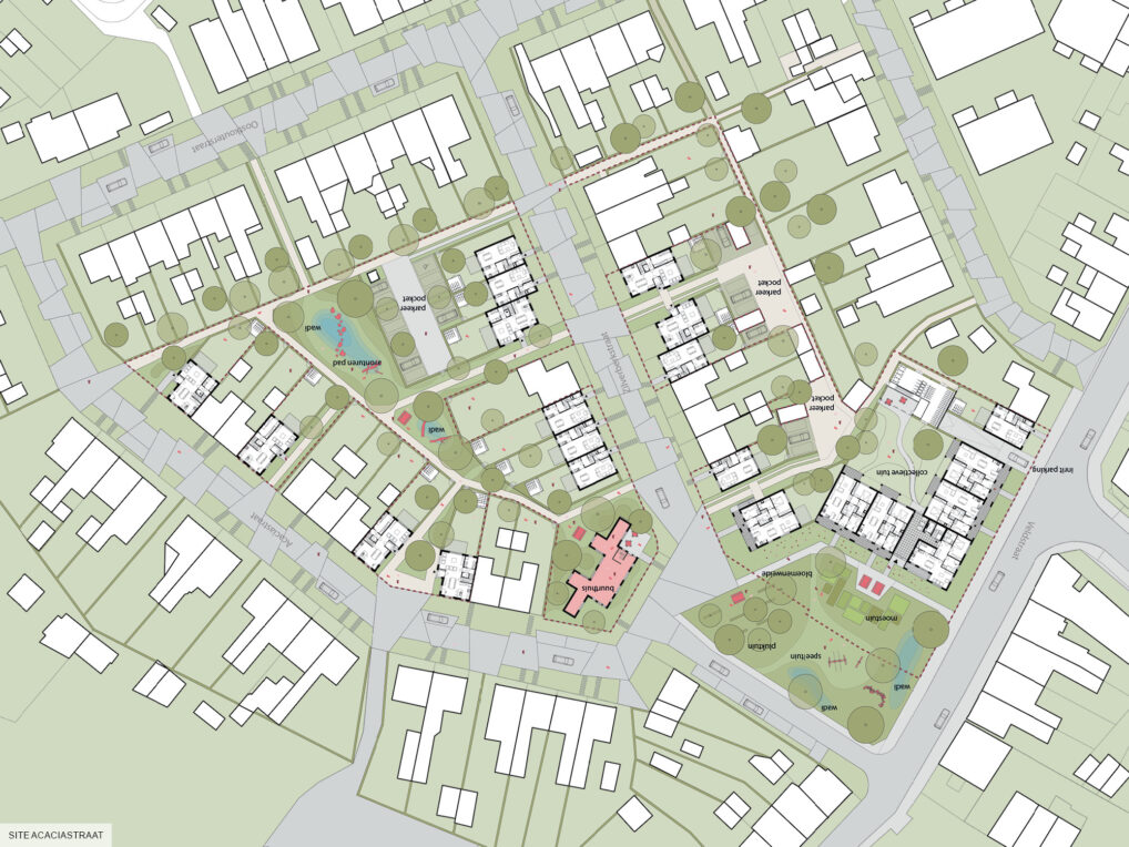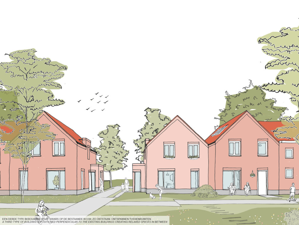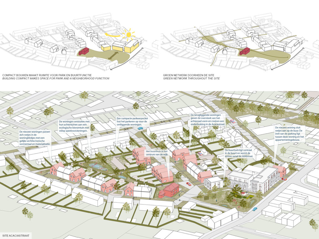 The new proposed houses are thus distributed over the neighborhood and connected by a clearly defined green park space throughout the area.