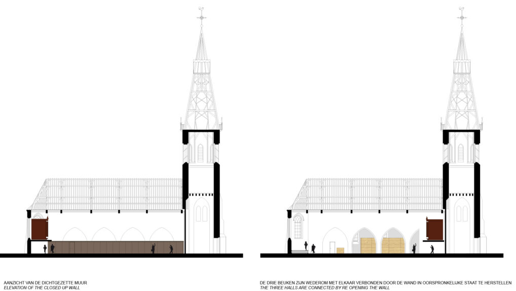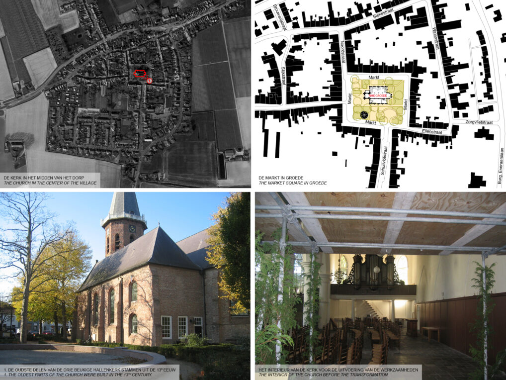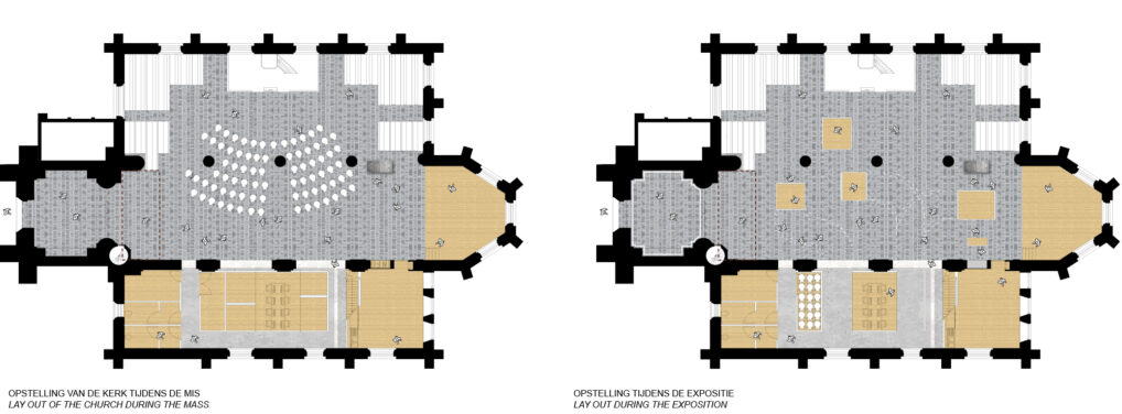 The Dutch Reformed Church (NHK) in Groede will be renovated. The foundation managing the church wants to renew the interior to make multifunctional use of the church possible. Ceremonies, services, lectures and exhibitions have to be able to be organized in the building. Our proposal brings back the original light and space in this Flemish Hall-Church. The historical division between the French and Flemish church is demolished. The original space is recreated. Through the materialization of the floor the history of the church remains visible. To make the multifunctional use possible 2 new volumes are inserted in the interior. The new additions have a different material to make the interior tell the history of the church.