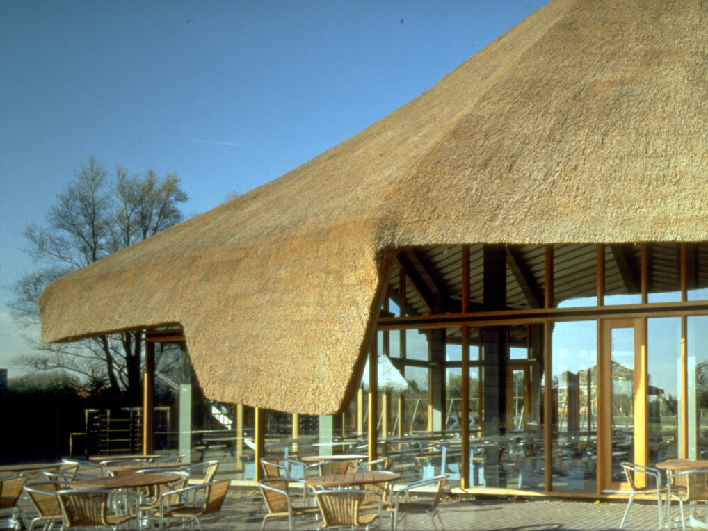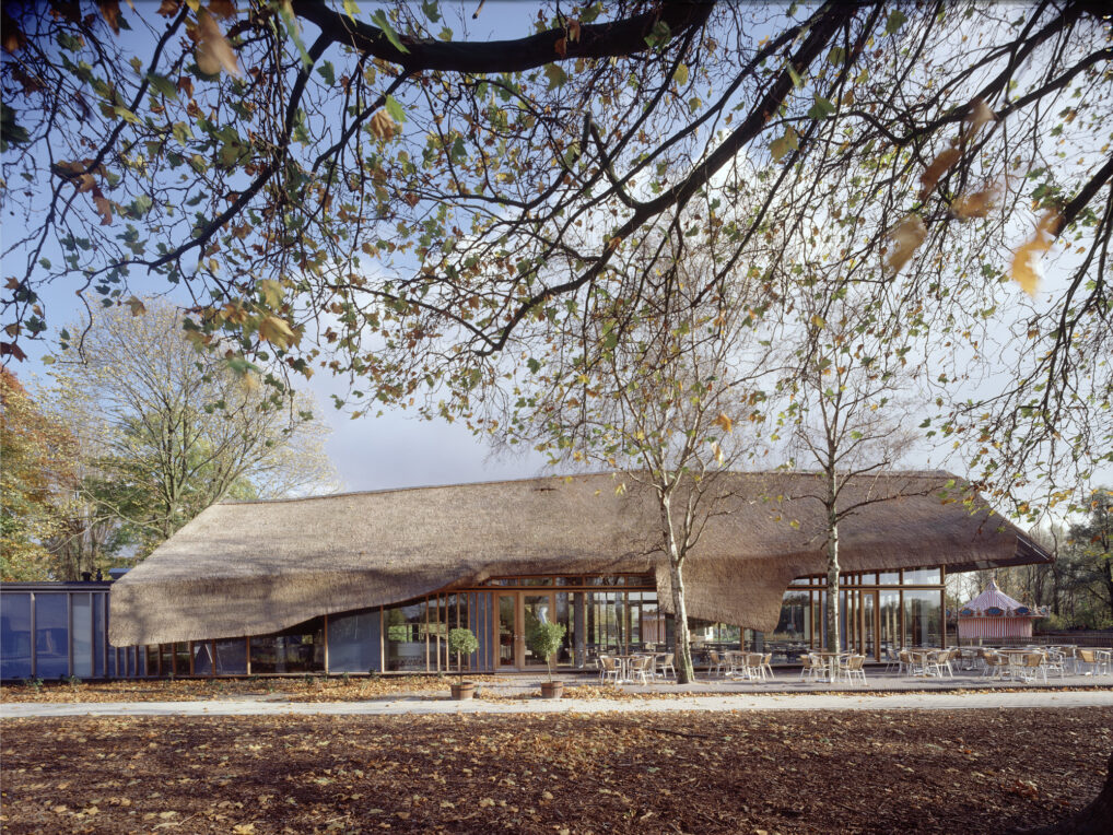 The new entrance to the park includes a pedestrian bridge and a number of entrance buildings. The bridge connects the parking facilities with the entrance area. in this area are the cash registers, an office building with a souvenir shop and a restaurant. A linear route leads into the park from the main entrance. To reinforce this line, the entrance area has a clear tail: the bridge, and head: the restaurant. Due to their form language, use of materials and construction, the bridge and the buildings belong to one ‘image family’. The starting points for the development of the buildings are the identity of the environment, the perception of children and the relationship between building and nature. The concept for each of the buildings is a rectangular glass box – for maximum indoor-outdoor relationship – with a folded reed cover. This organic skin protects and is reflected in the surroundings, the luxurious villas of Hillegersberg with their thatched roofs.