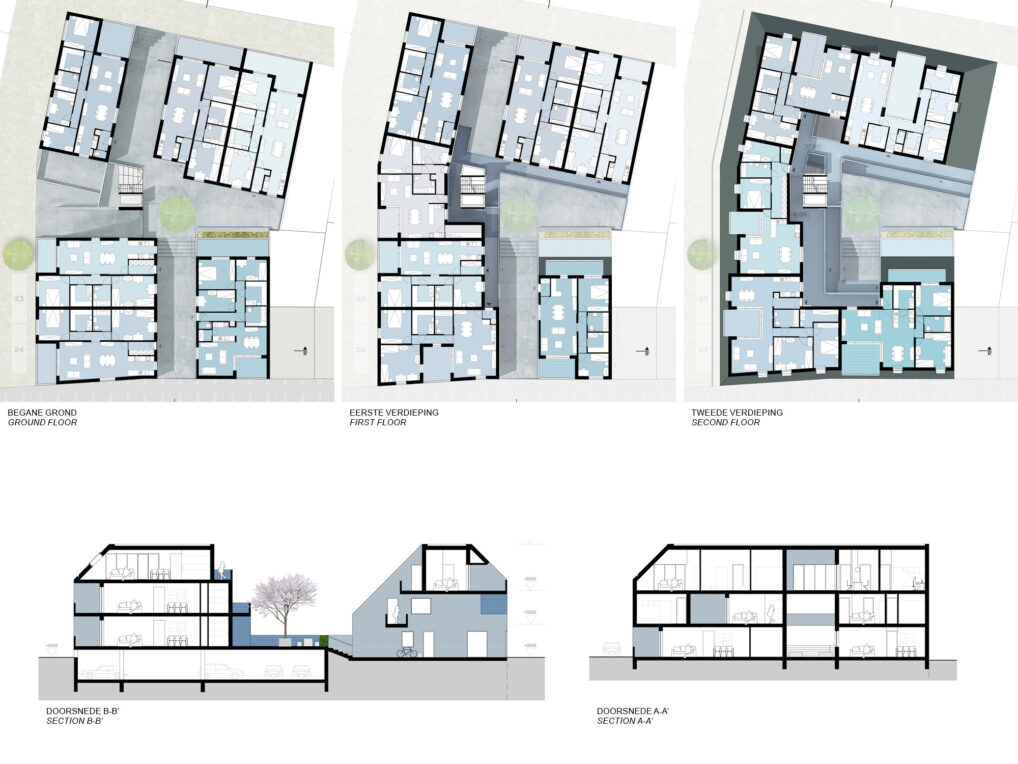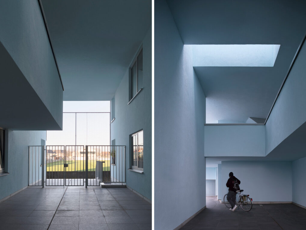 The building’s footprint occupies the entire site. It’s a striking building that meets all imposed conditions by means of smart transformations on the shape and internal organization regarding the integration in the area, the program for housing and parking, spatial quality, social living qualities and architecture. The rather simple outside of the building is completed with an exciting inner world where the common outside space and the entrances to the houses are located. The materials emphasize the difference between inside and outside.